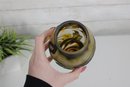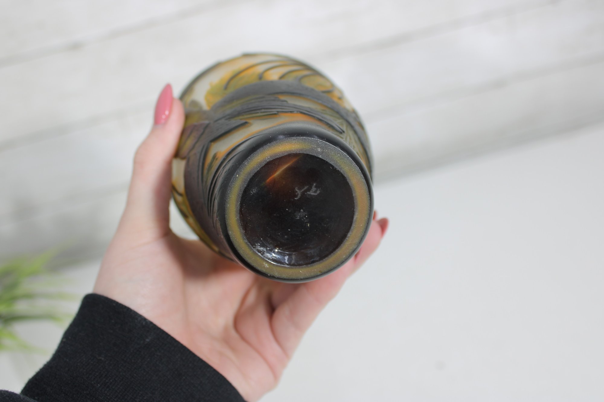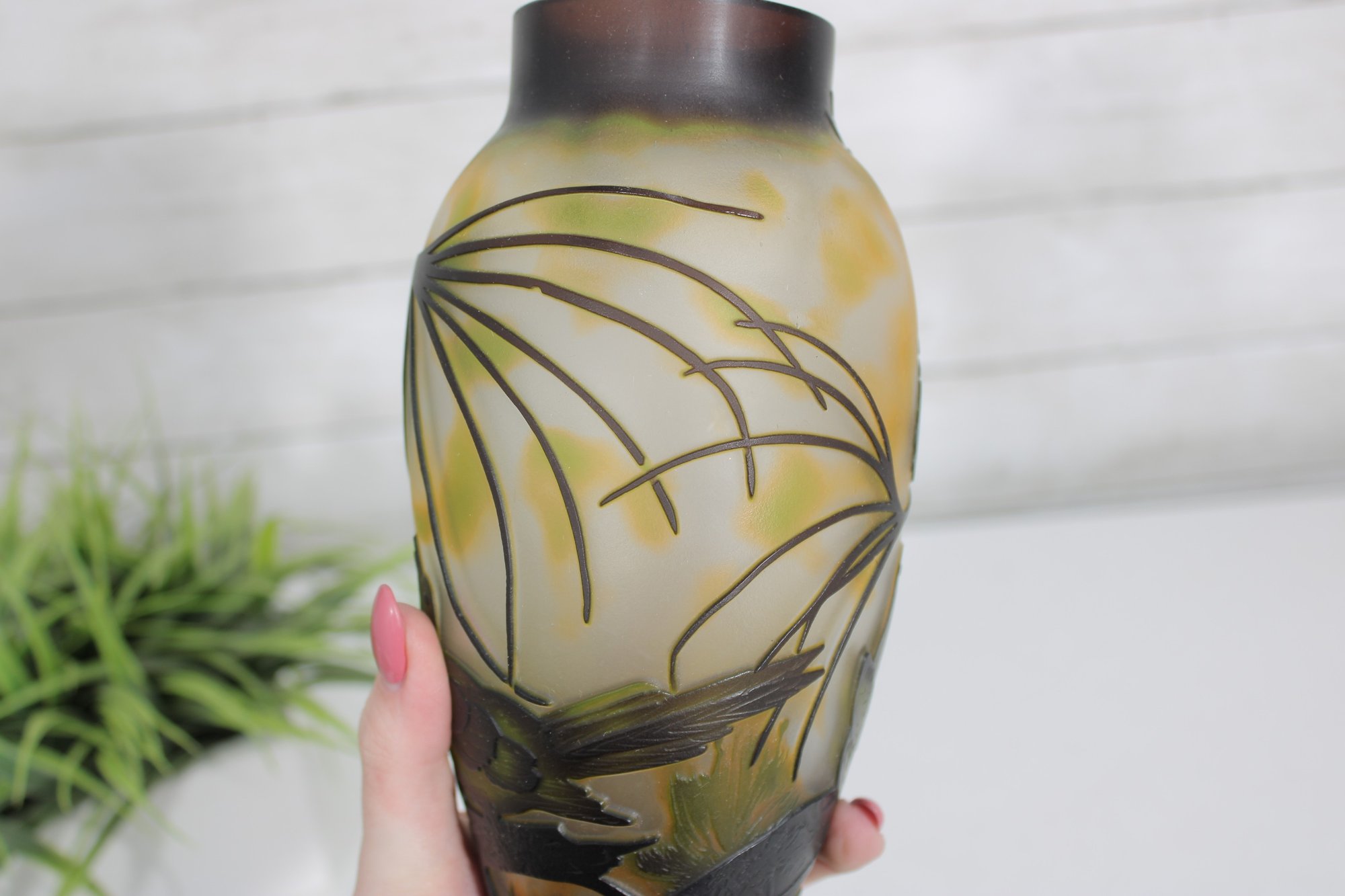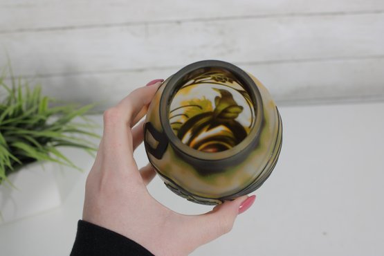 The rounded form with a slightly flared neck enhances the flowing organic motif, while the layered glass technique gives the piece a classic cameo appearance reminiscent of fine European art glass.