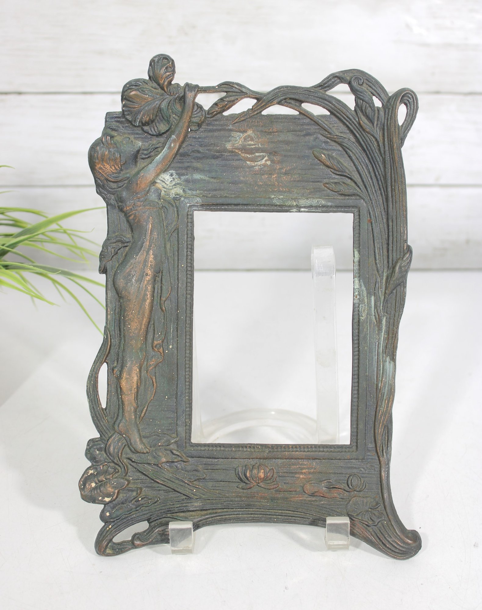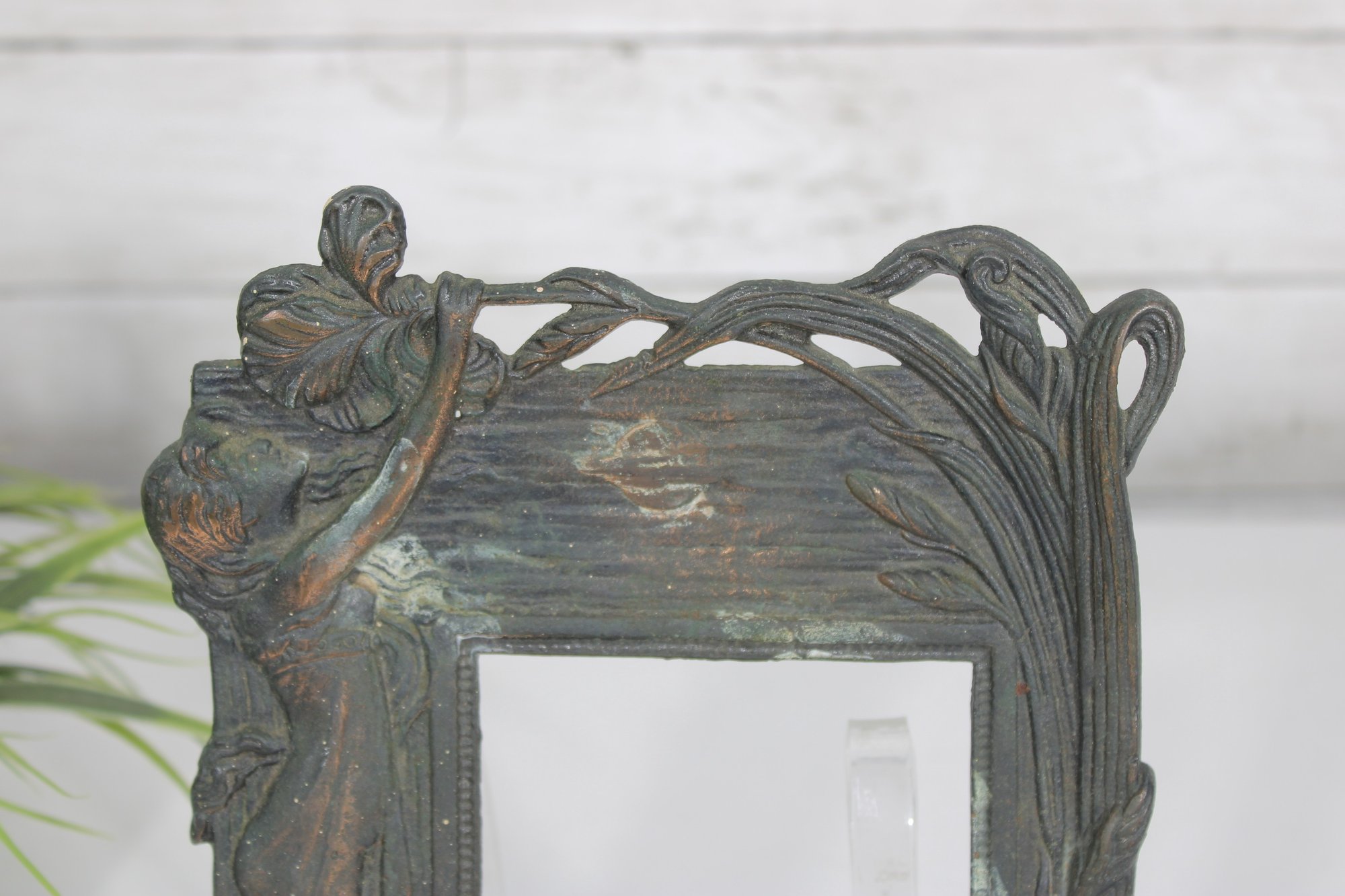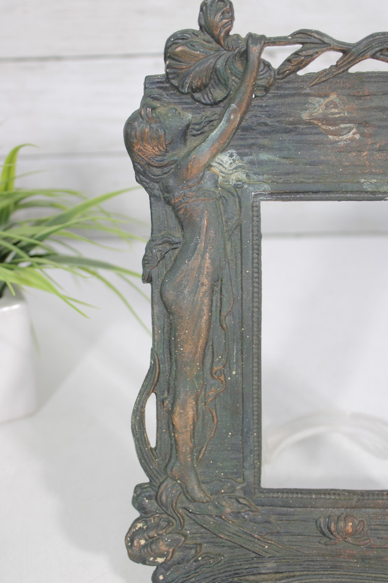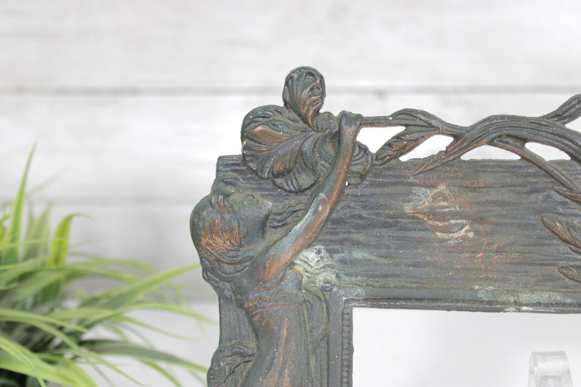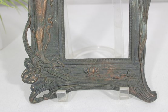 Crafted in a metal with an aged patina finish, the piece displays subtle tones of green, bronze, and copper, enhancing its vintage-inspired appeal. The intricate detailing around the figure and border gives this frame a striking, gallery-worthy look.