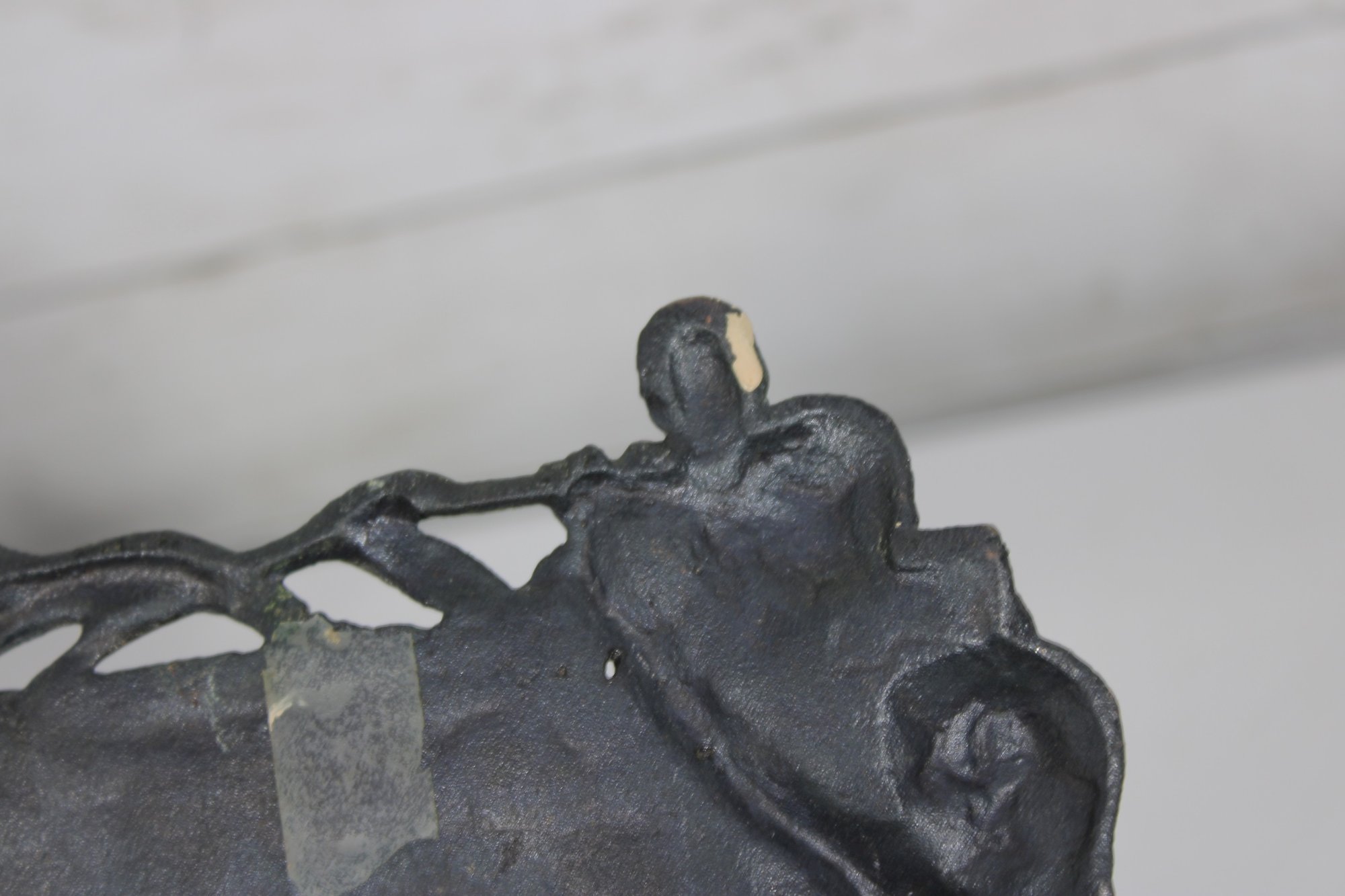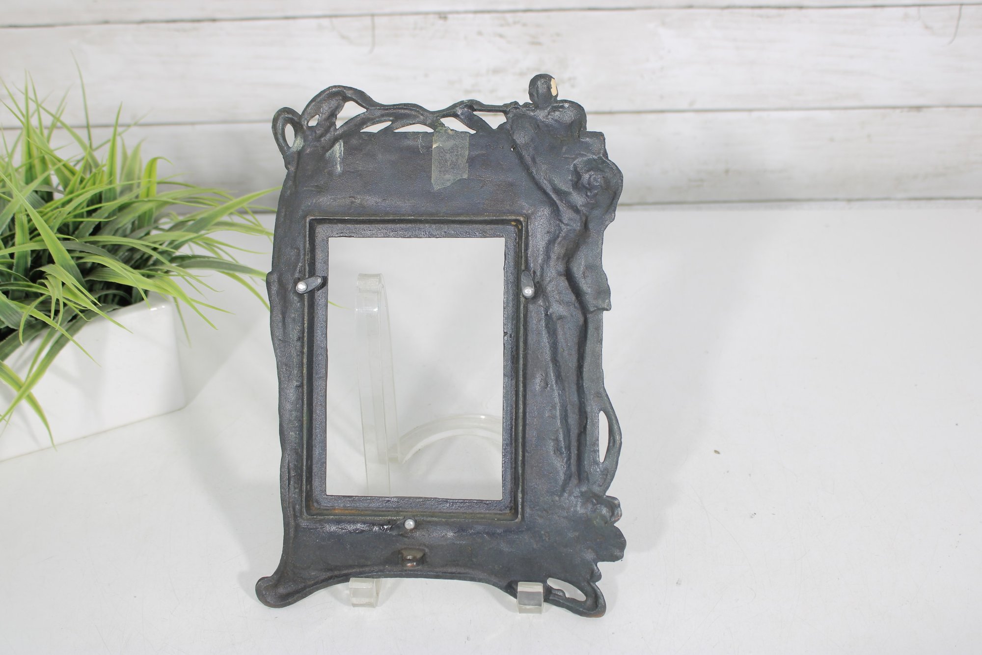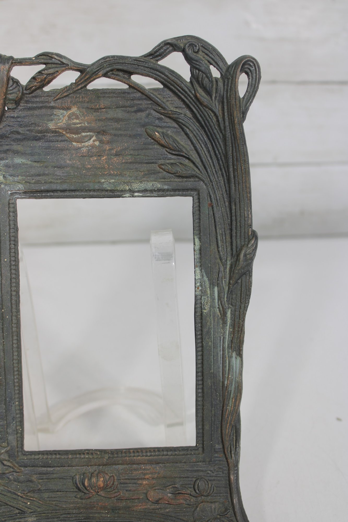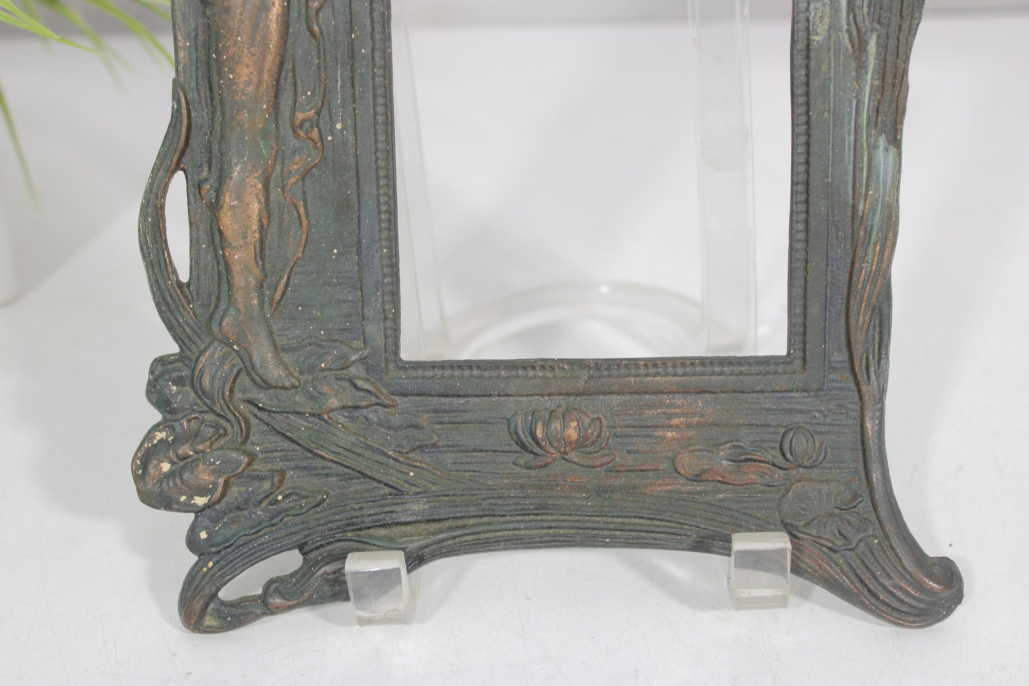 Crafted in a metal with an aged patina finish, the piece displays subtle tones of green, bronze, and copper, enhancing its vintage-inspired appeal. The intricate detailing around the figure and border gives this frame a striking, gallery-worthy look.