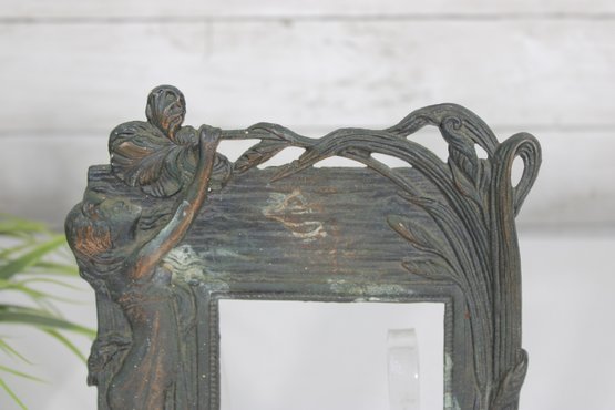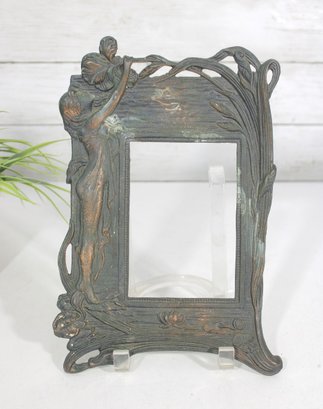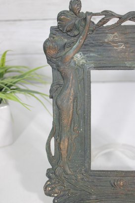 Art Nouveau style picture frame featuring an elegant figural design of a standing woman intertwined with flowing organic forms and naturalistic elements. The frame showcases classic Nouveau characteristics with sinuous lines, textured surfaces, and a sculptural, artistic presence.