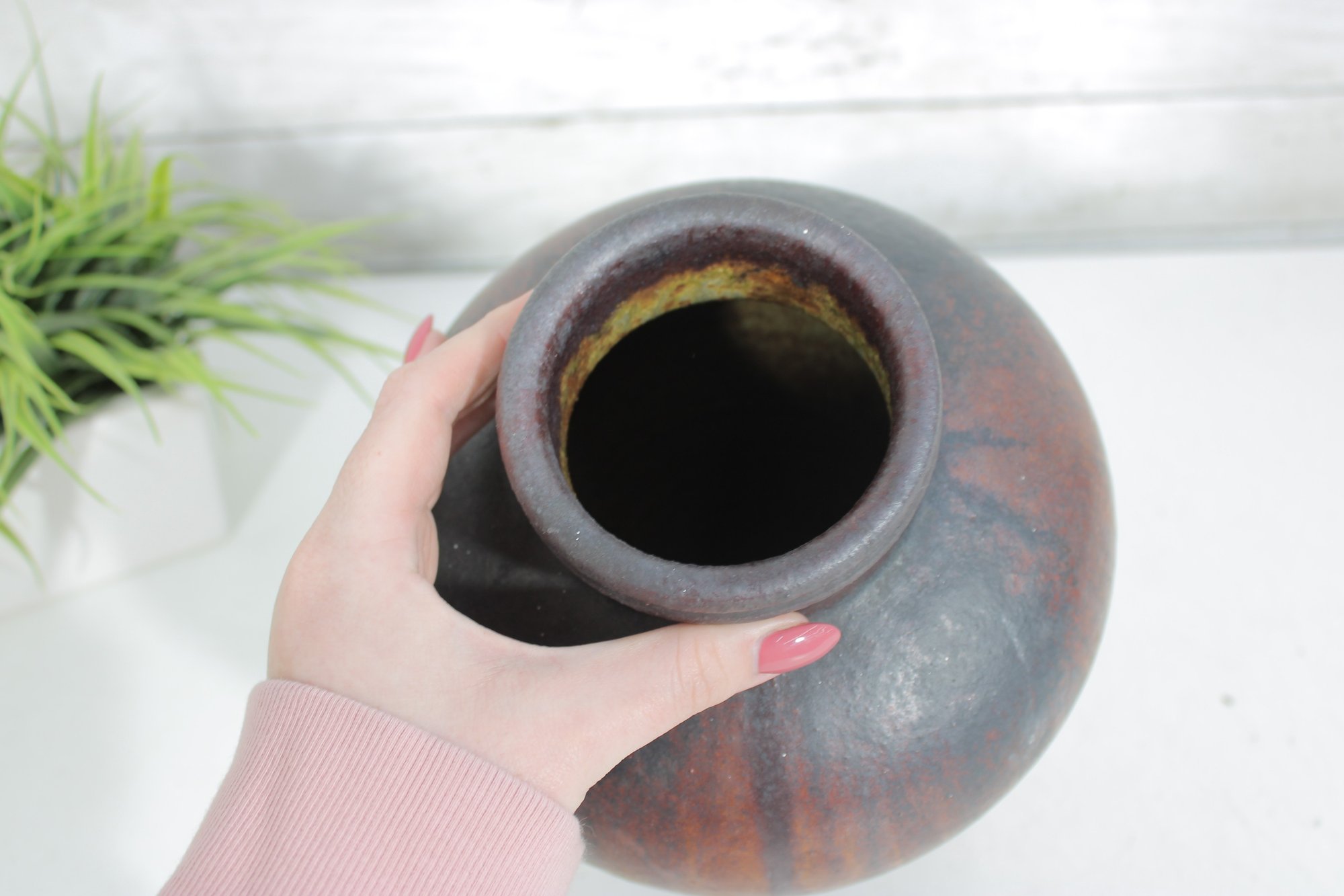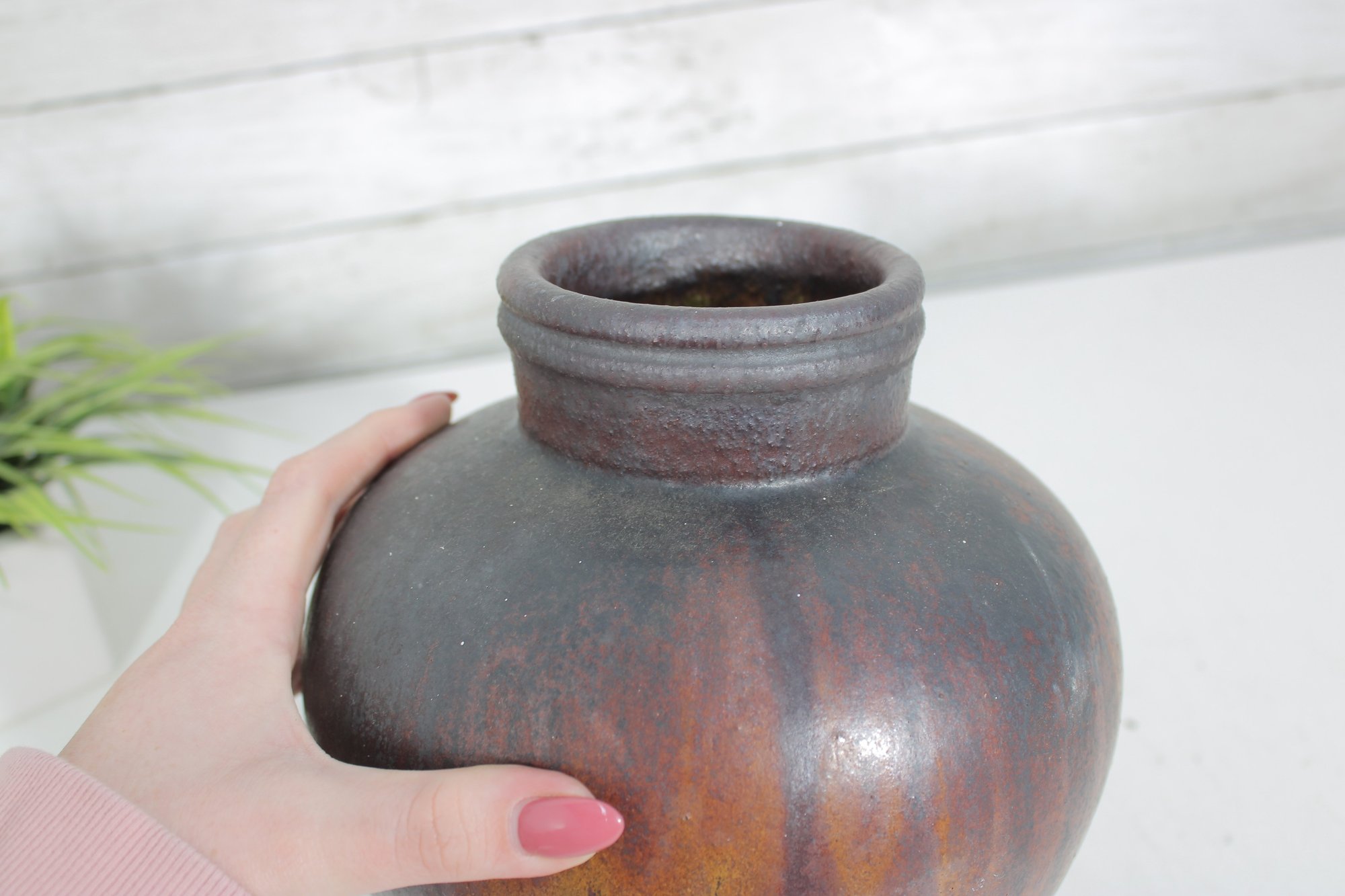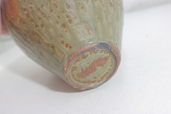 The glaze transitions smoothly from darker tones at the top to a textured, lighter base, creating depth and visual interest. Signed on the underside (as shown), adding to its handcrafted appeal.