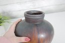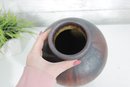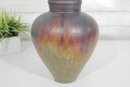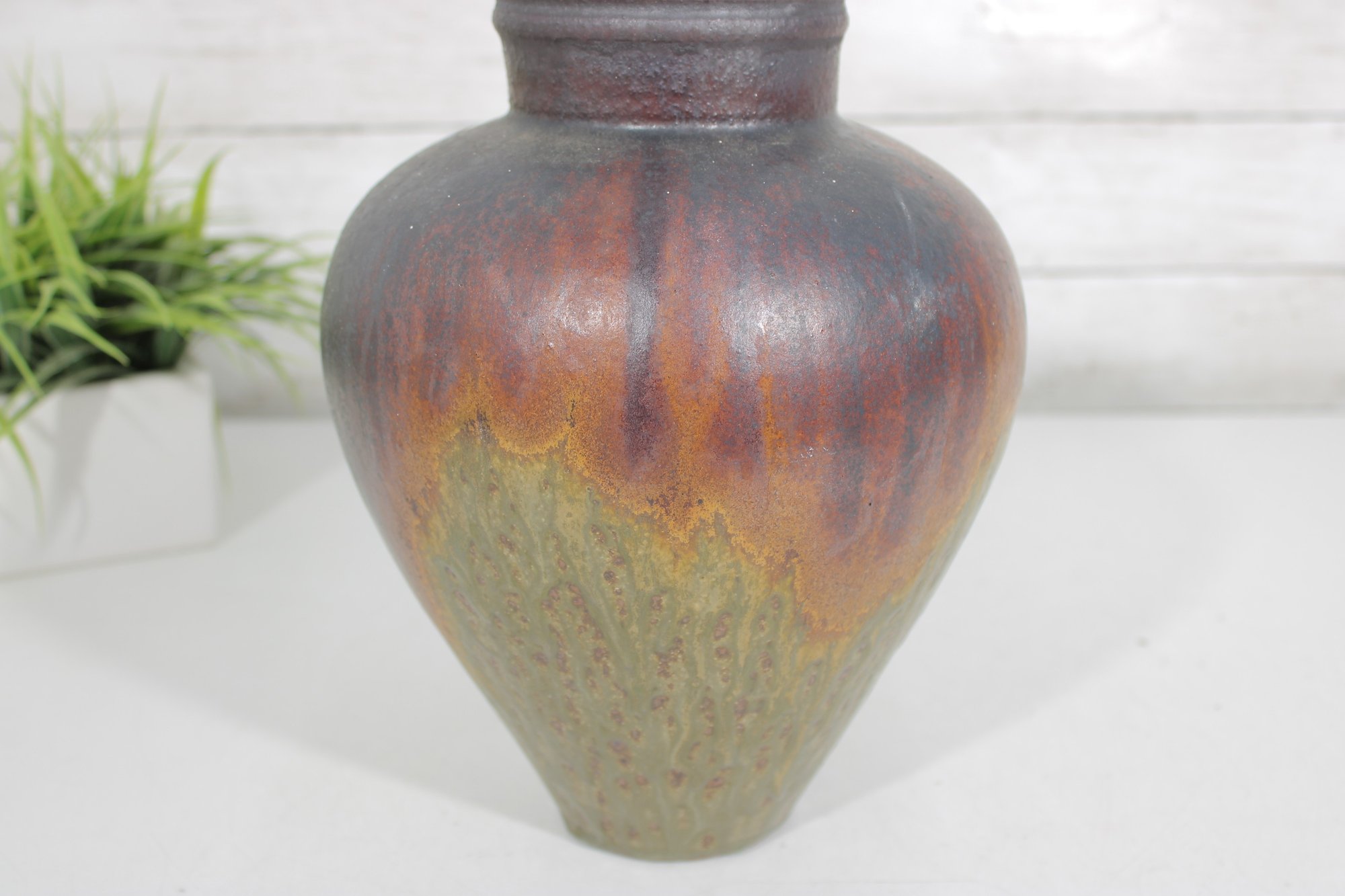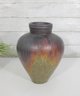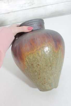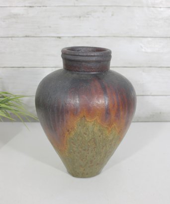 Beautiful art pottery vase featuring a rich, multitone drip glaze in earthy hues of deep brown, rust, olive, and muted green. The rounded, tapering form is complemented by a slightly flared neck, giving the piece a balanced and organic silhouette.