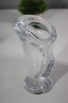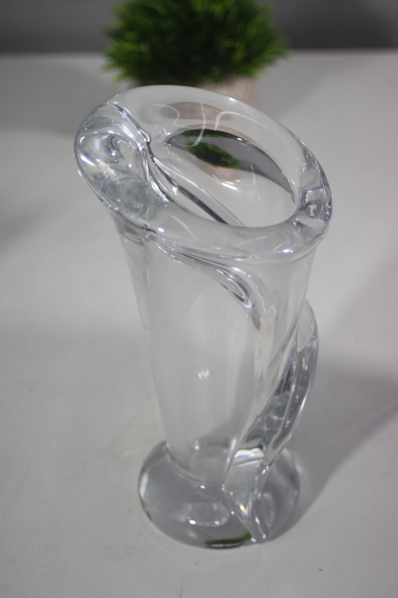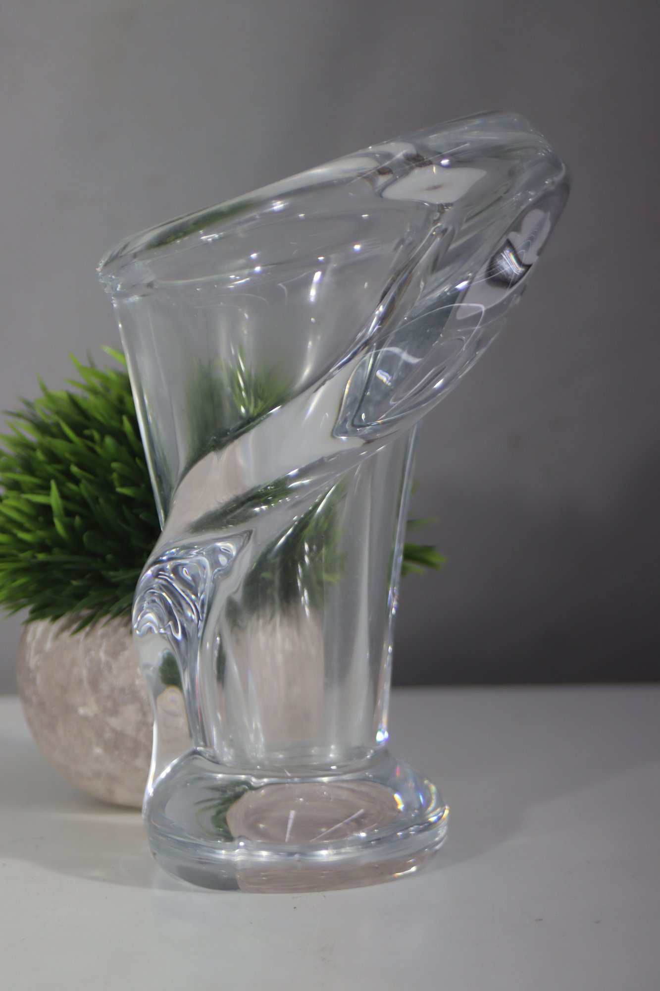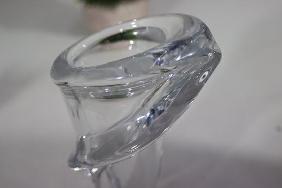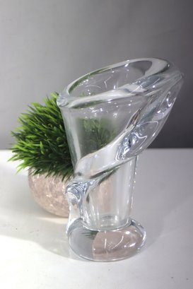 This elegant Art Vannes France Le Chatel crystal vase showcases a breathtaking Calla Lily-inspired sculptural design, making it a true masterpiece of mid-century glass artistry. Crafted from high-quality French crystal, the vase features a fluid, organic form with a gracefully curved rim and twisted body, capturing the delicate beauty of the Calla Lily flower.