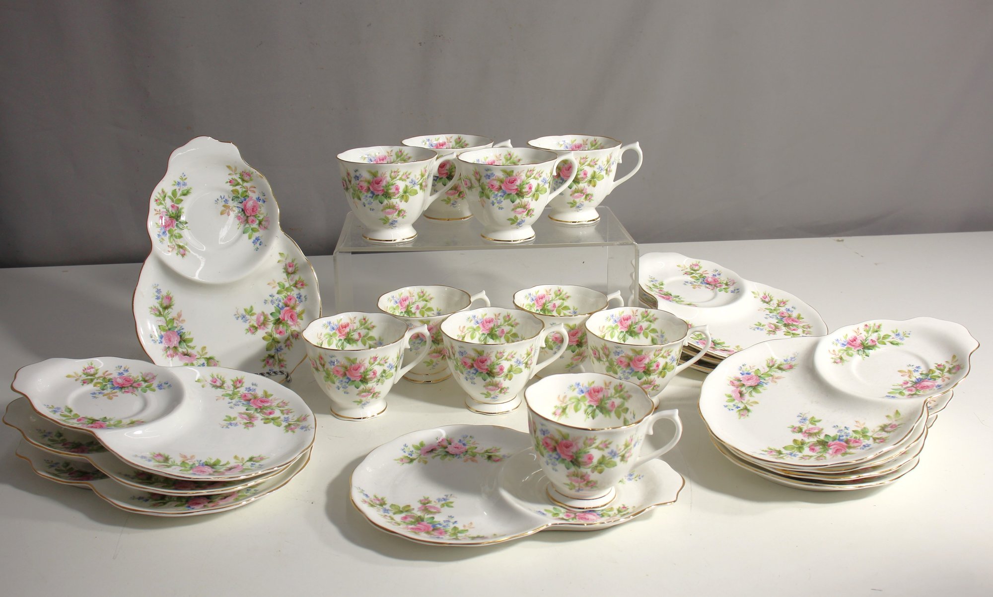 This lovely Royal Albert bone china set in the charming "Moss Rose" pattern is perfect for afternoon tea or light luncheons. The set features delicate pink roses with green foliage, accented by elegant gold trim on a crisp white background. The romantic floral motif and scalloped edges add to its vintage charm.