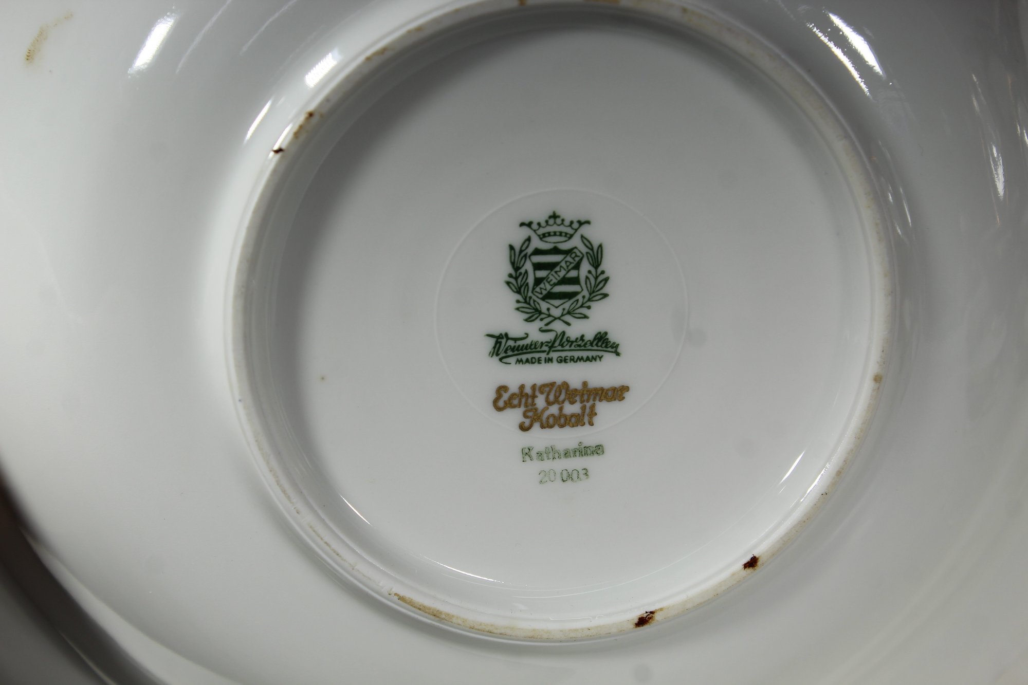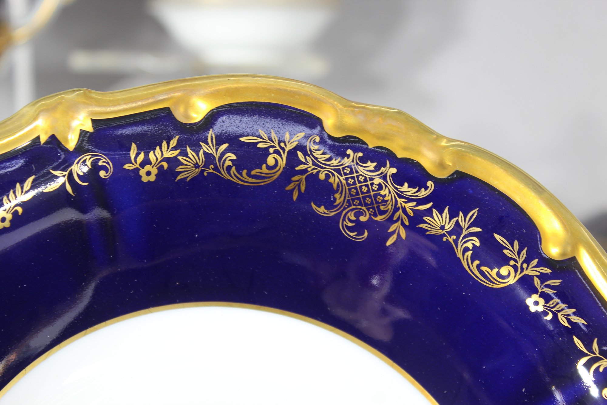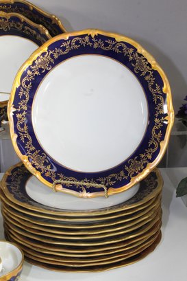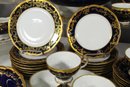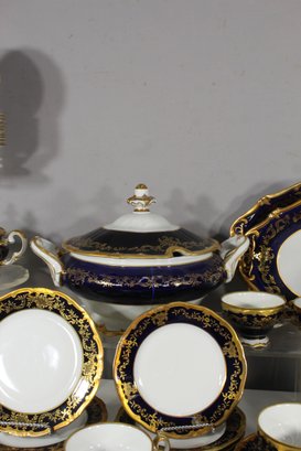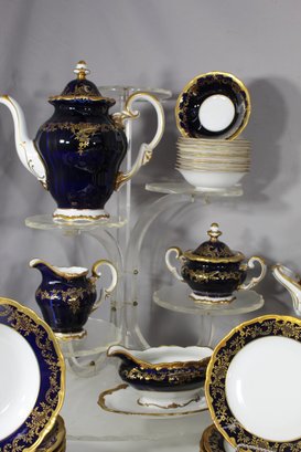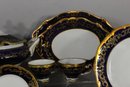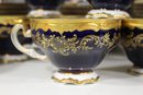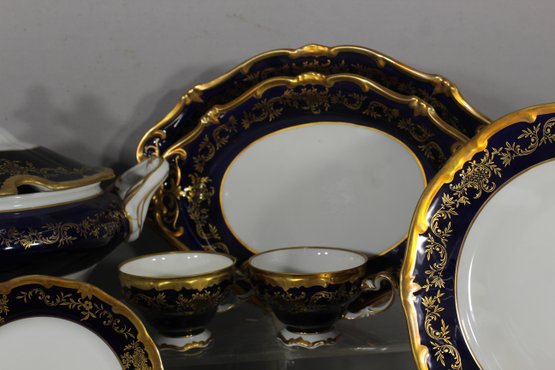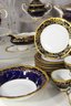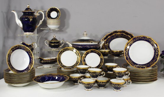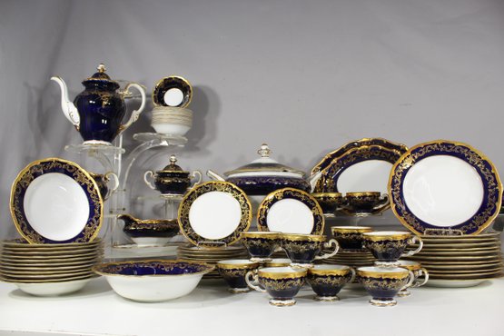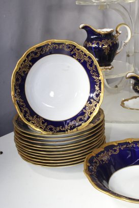 Elegant 80-piece Echt Weimar Kobalt dinnerware set in the "Katharina" pattern, made in Germany. This partial set features a stunning cobalt blue design adorned with intricate gold floral patterns, ideal for collectors or those seeking to enhance their fine china collection.