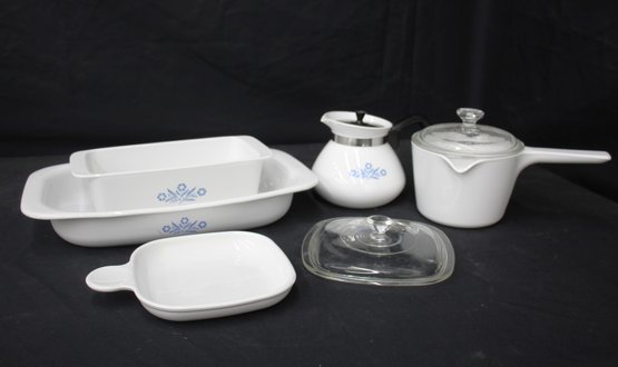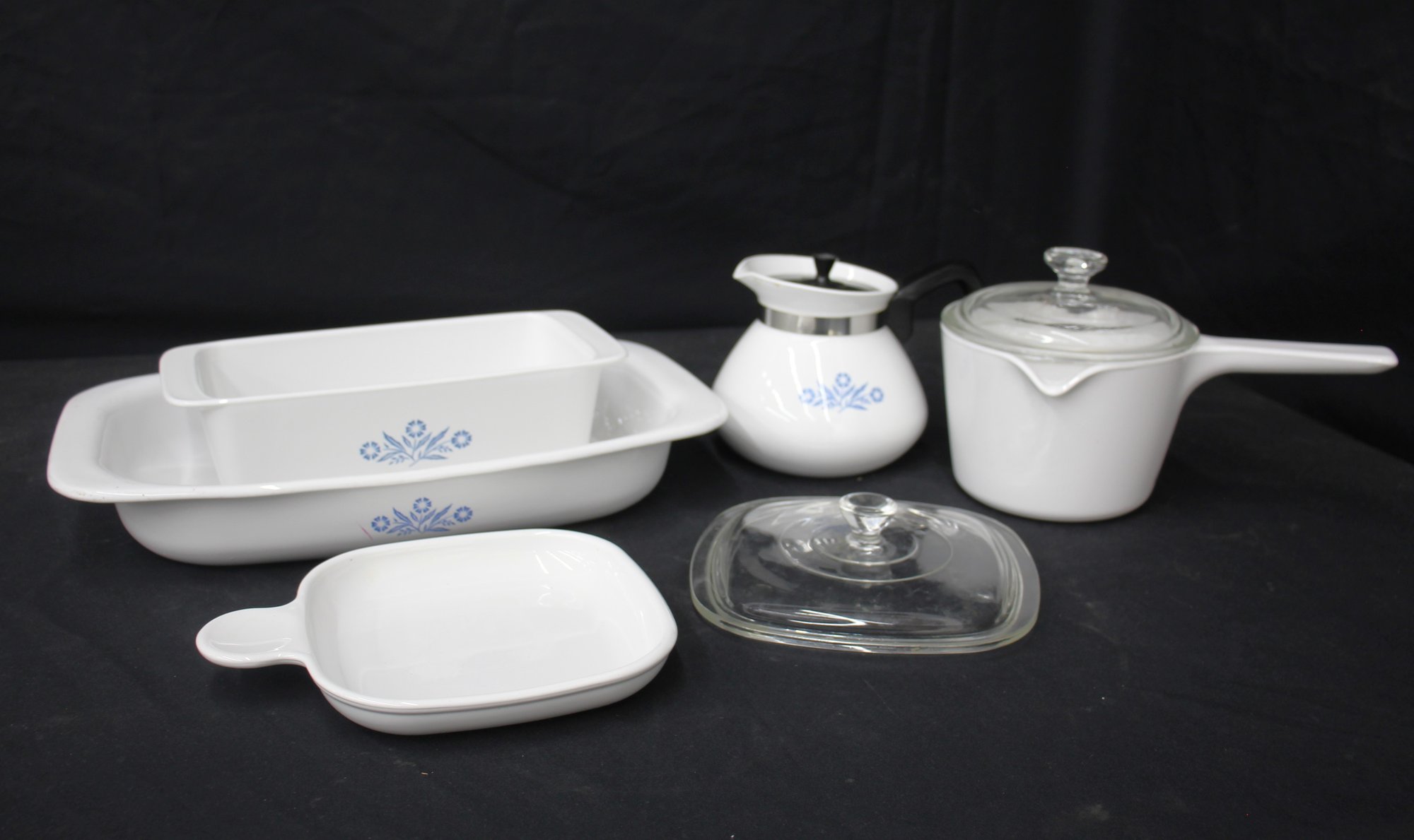 This classic CorningWare Blue Cornflower partial set includes essential pieces for cooking and serving. Known for its durability and iconic blue cornflower design, this set is perfect for both functional use and vintage kitchen decor. The set includes baking dishes, a lidded saucepan, a small skillet, and a creamer—all with the classic CorningWare stamp on the bottom.