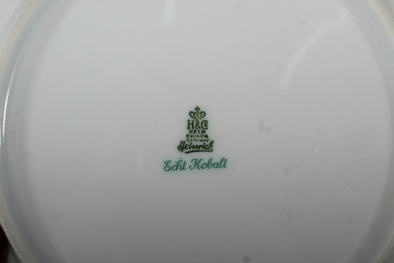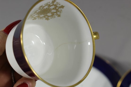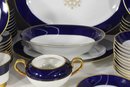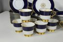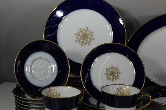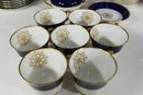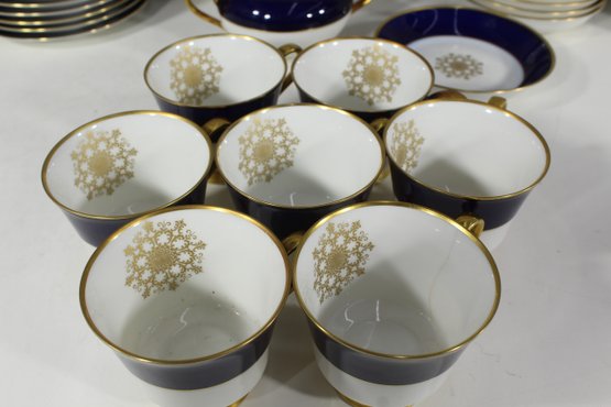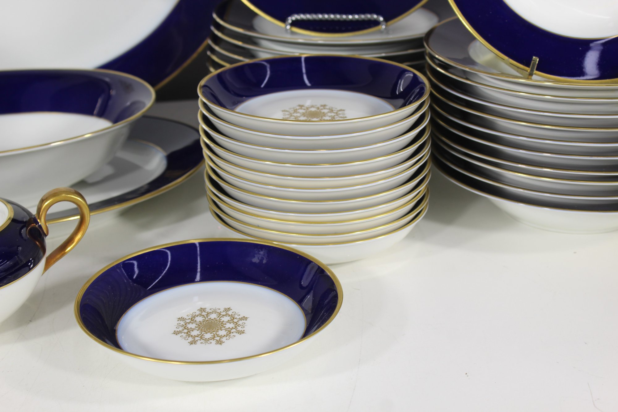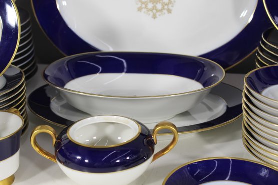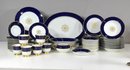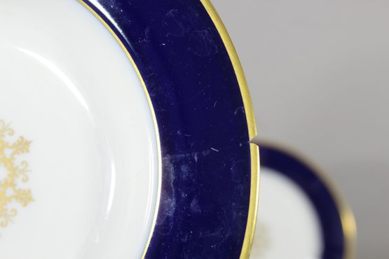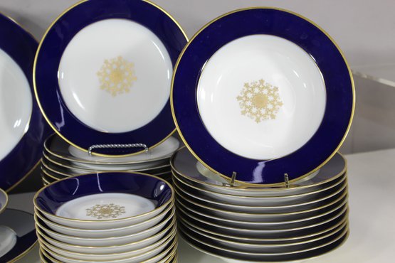 Add a touch of sophistication to your dining experience with this stunning partial set of cobalt blue and gold-trimmed porcelain dinnerware. This set features an intricate central motif and a rich cobalt border accented with delicate gold, embodying timeless elegance.