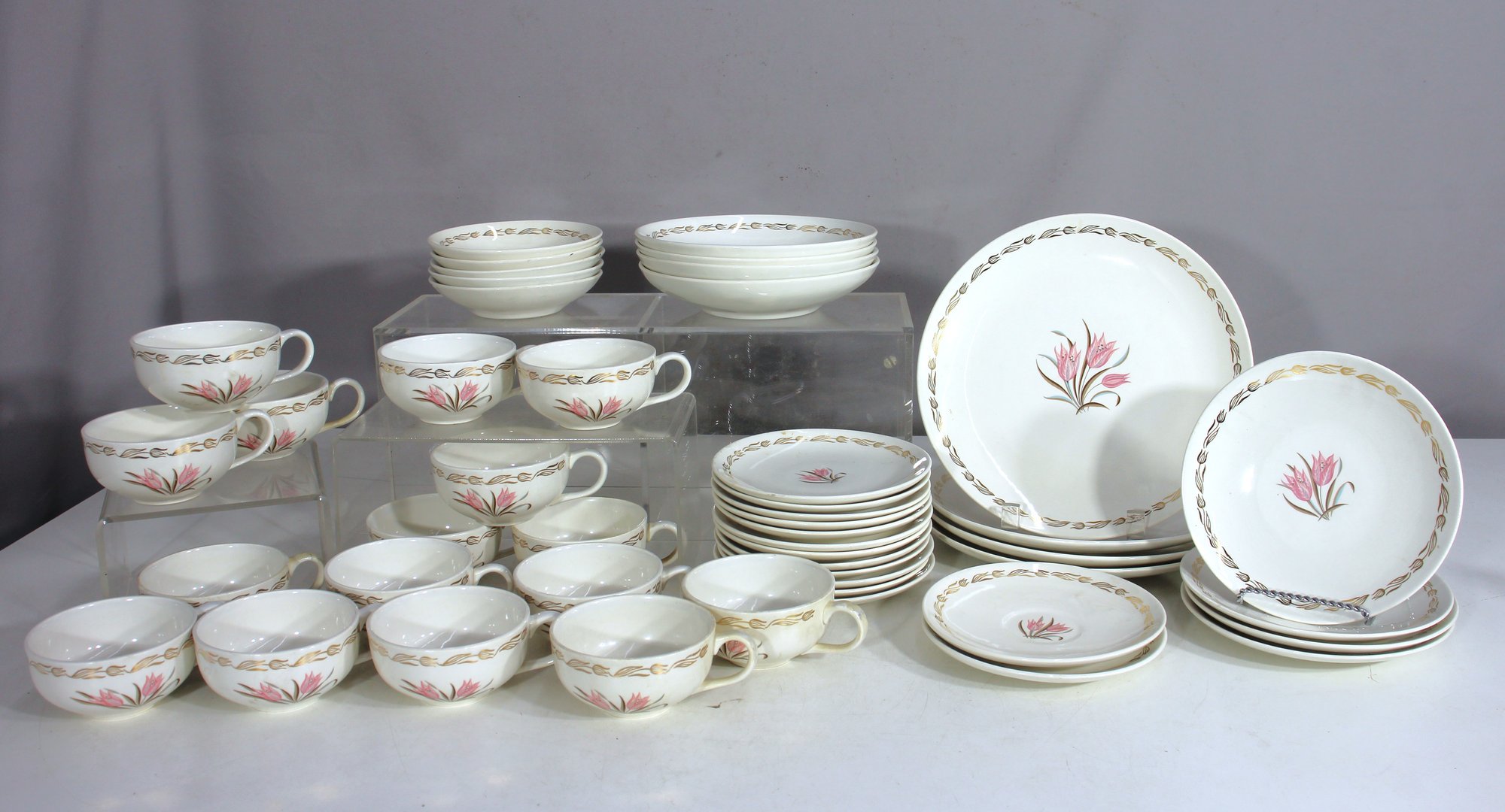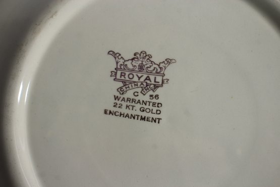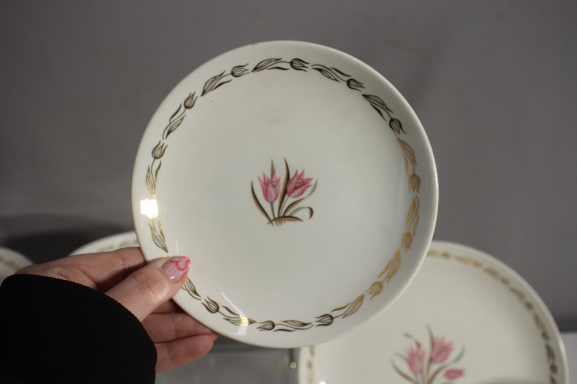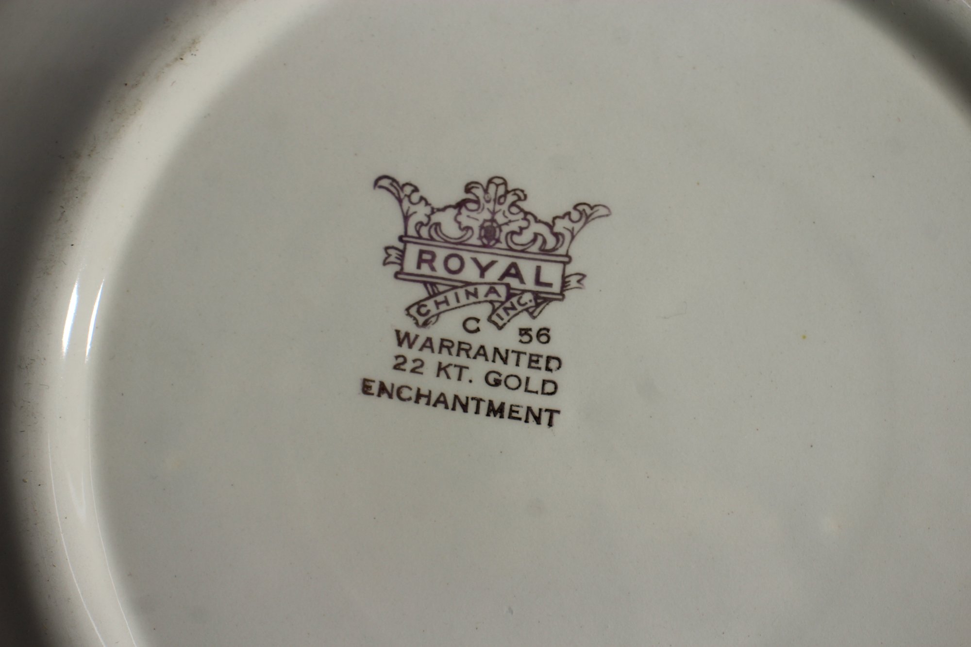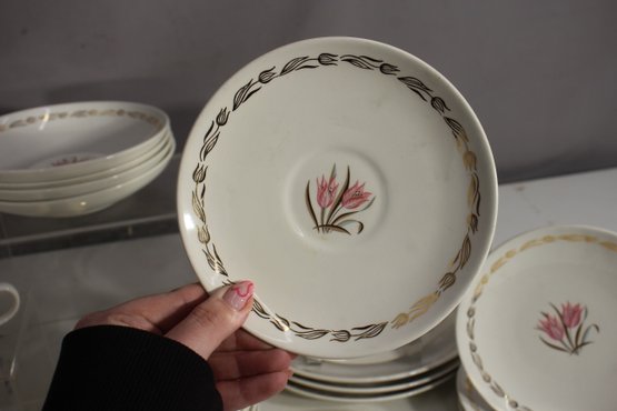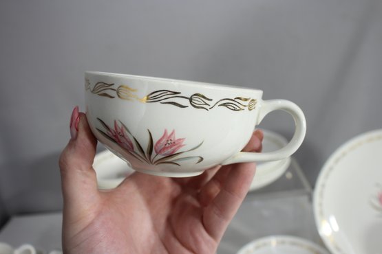partial dinnerware set by Royal China features the "Enchantment" pattern, showcasing delicate pink tulip floral motifs with 22K gold-trimmed accents. The vintage design adds a classic and timeless touch to any table setting.