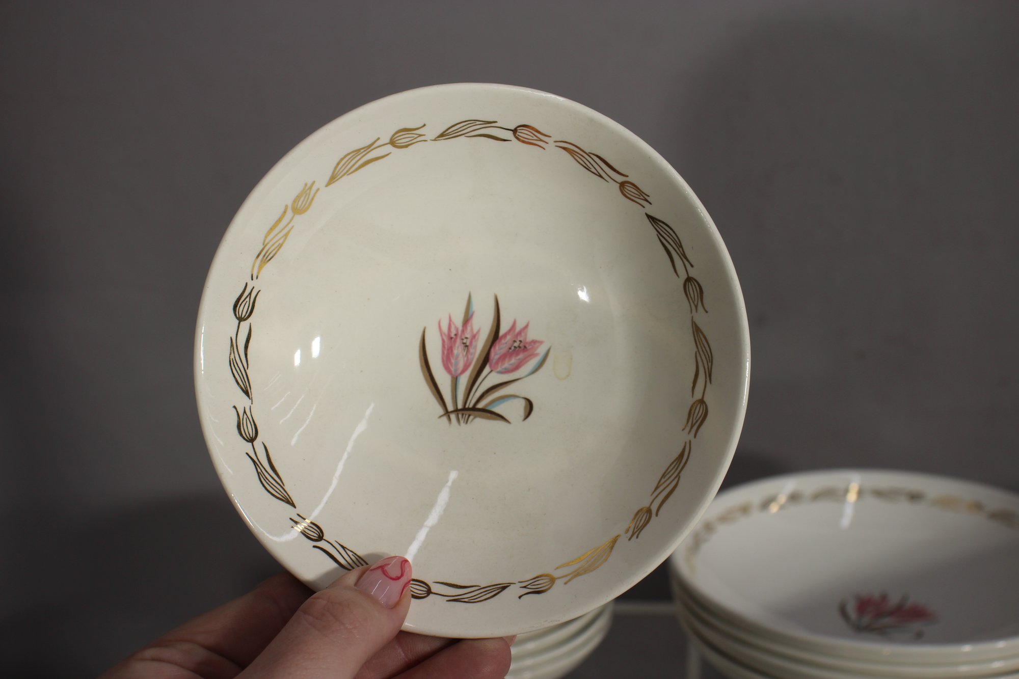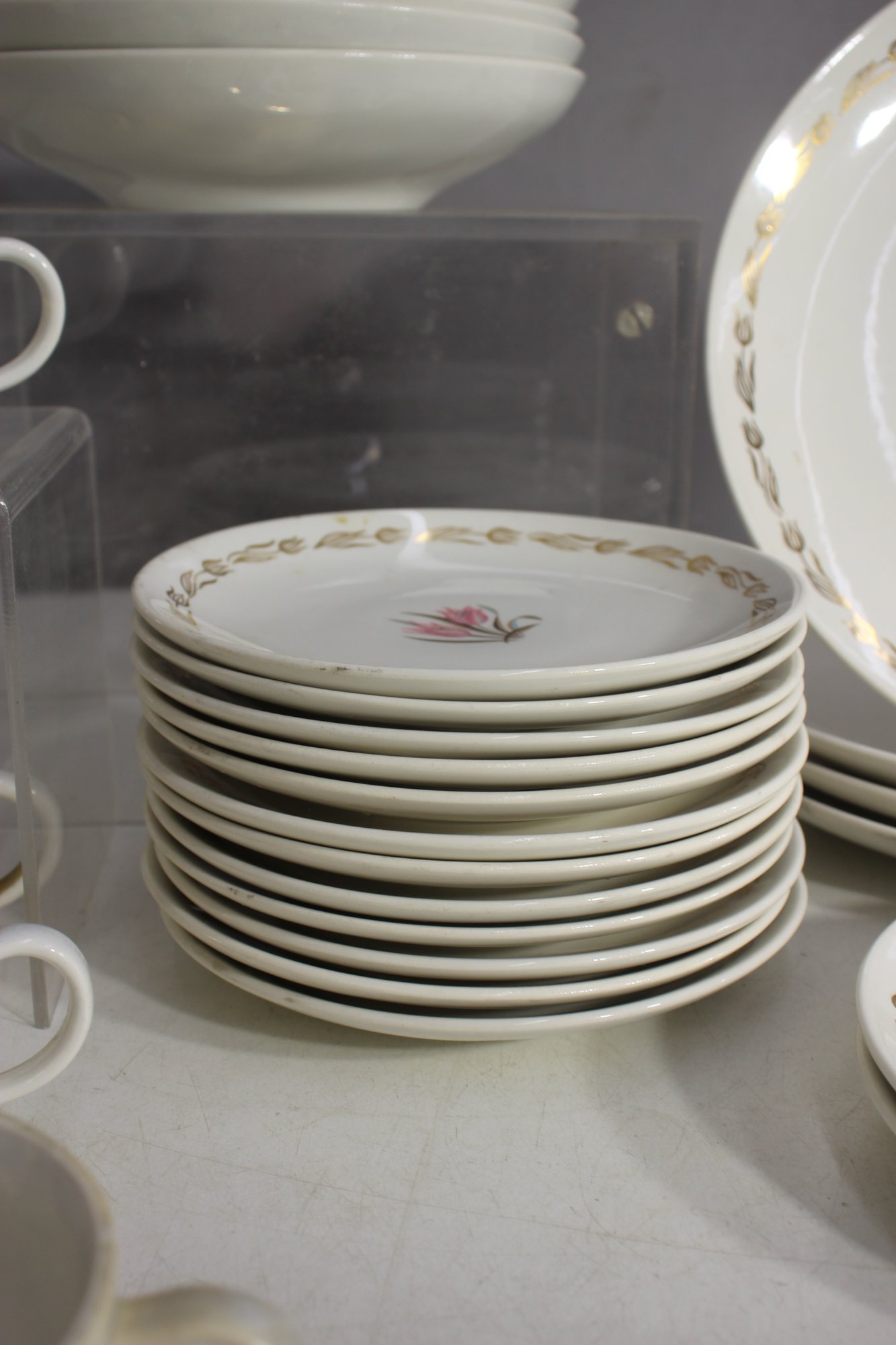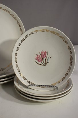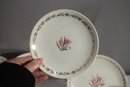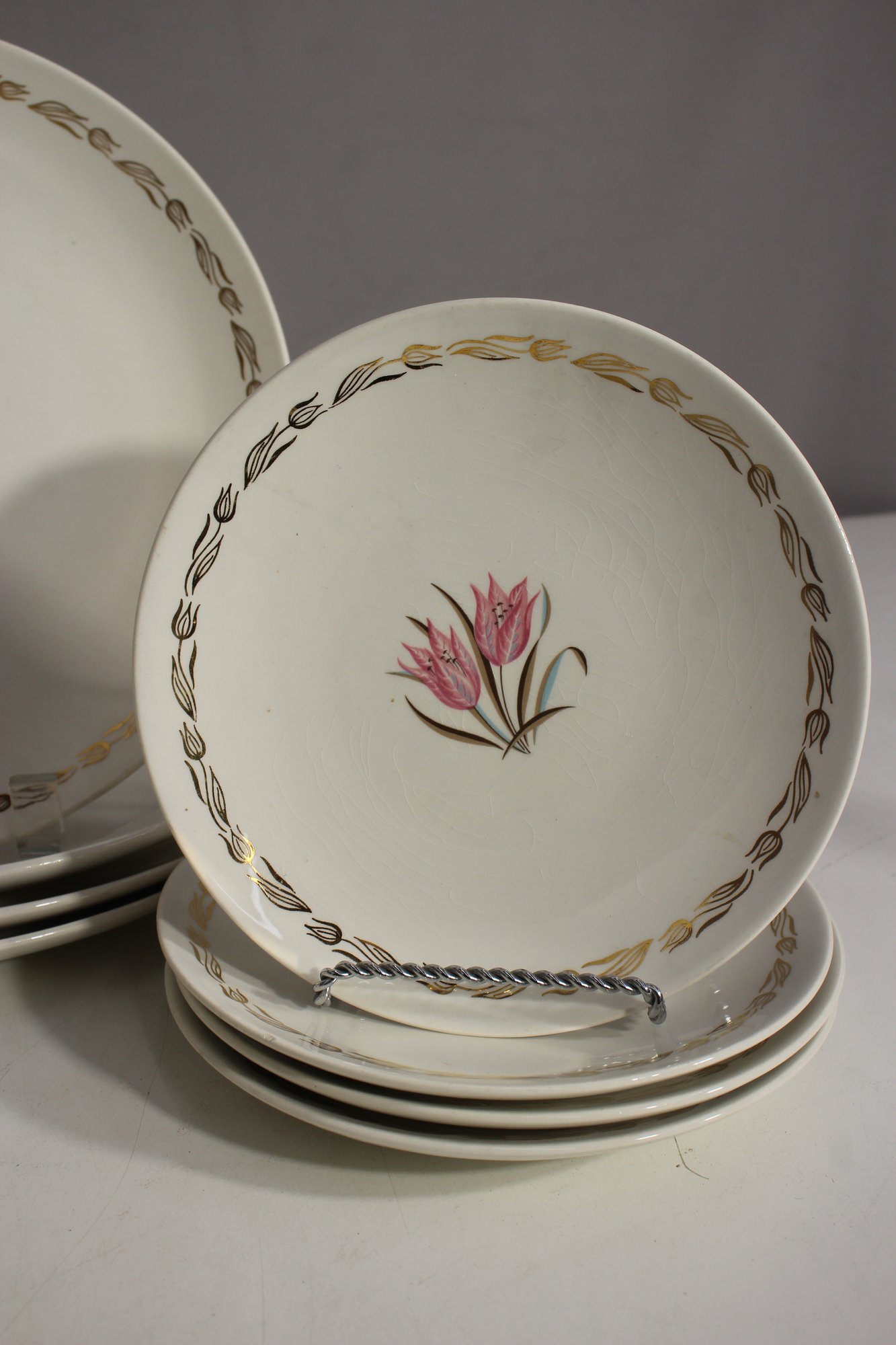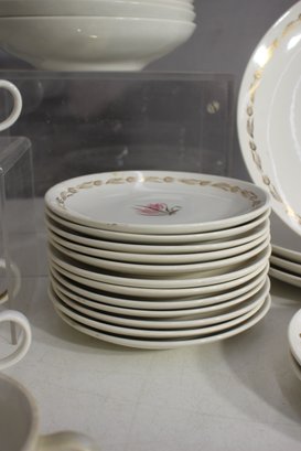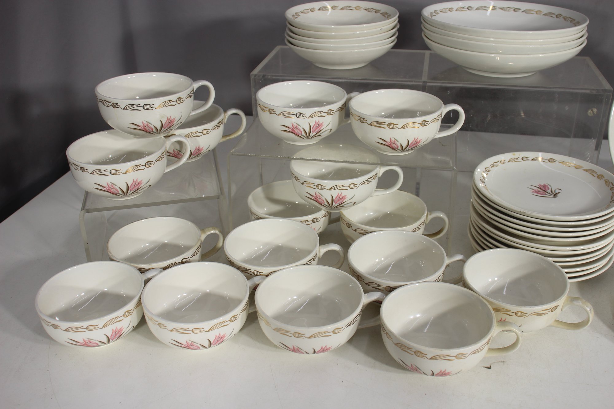partial dinnerware set by Royal China features the "Enchantment" pattern, showcasing delicate pink tulip floral motifs with 22K gold-trimmed accents. The vintage design adds a classic and timeless touch to any table setting.