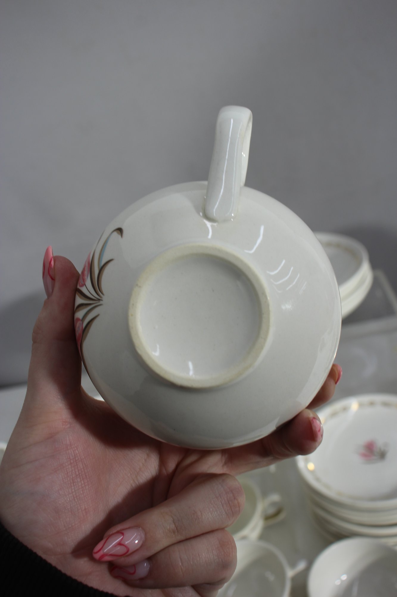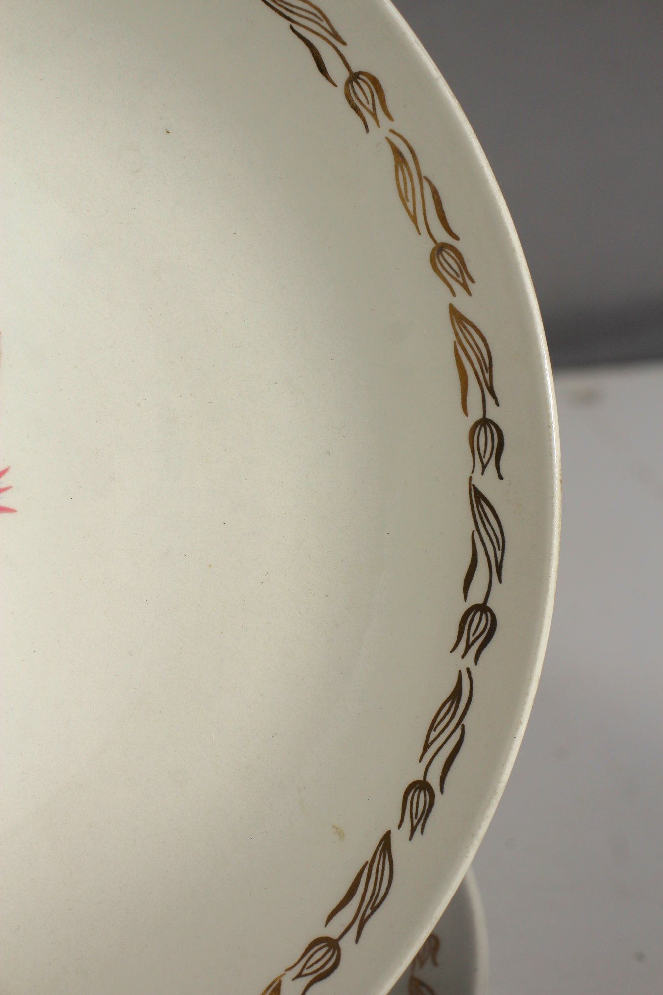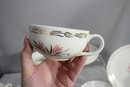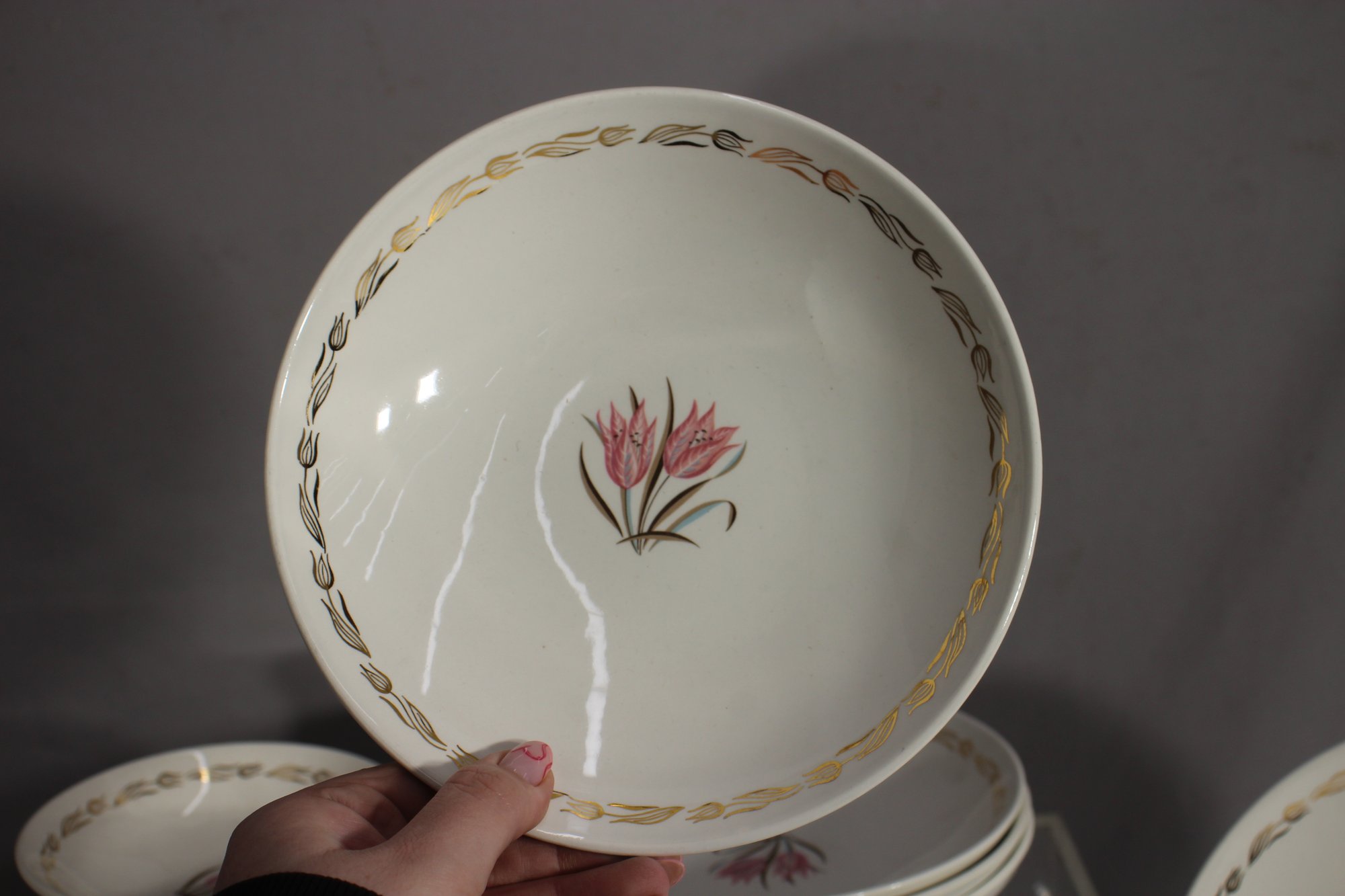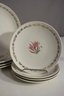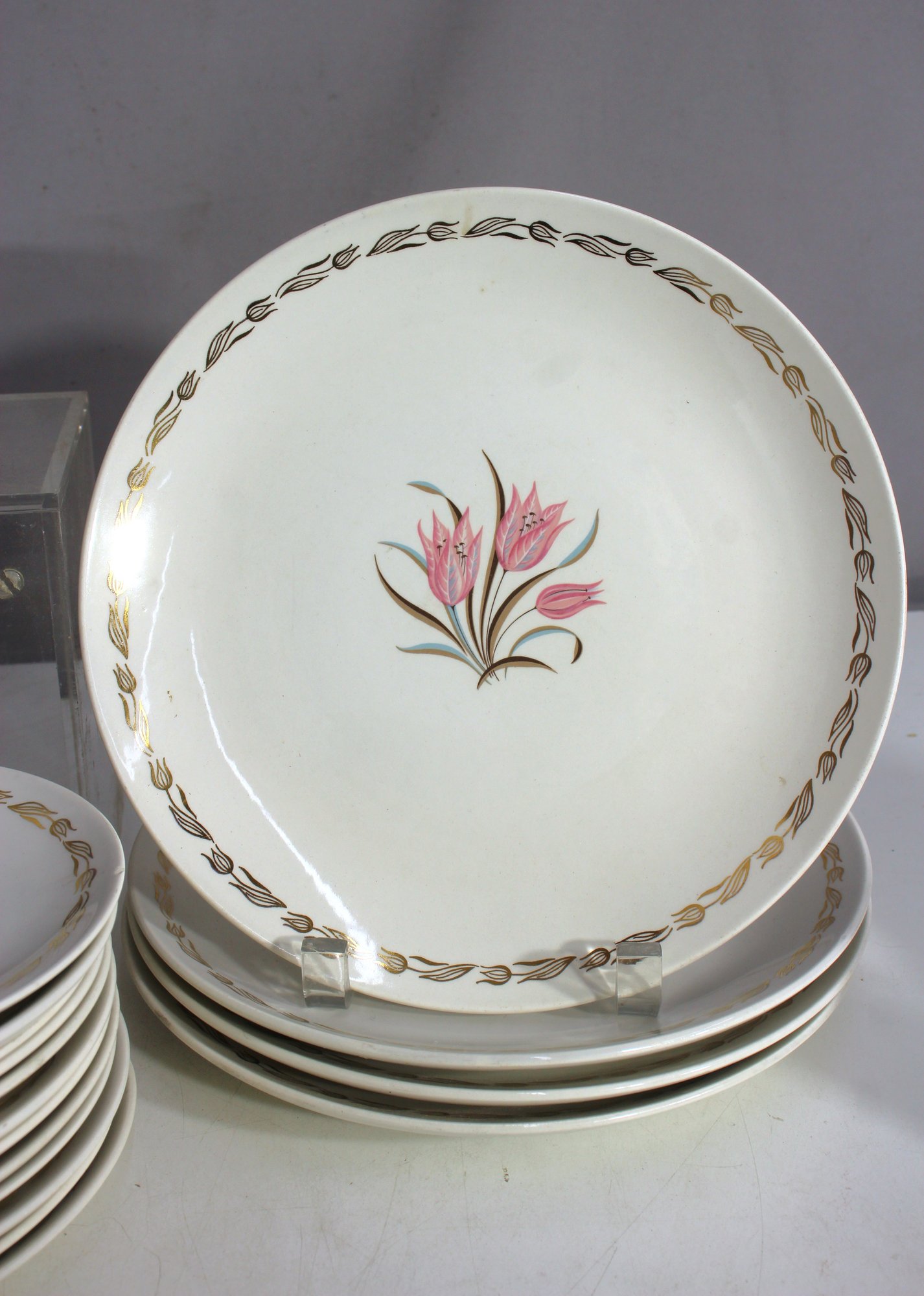 partial dinnerware set by Royal China features the "Enchantment" pattern, showcasing delicate pink tulip floral motifs with 22K gold-trimmed accents. The vintage design adds a classic and timeless touch to any table setting.