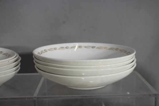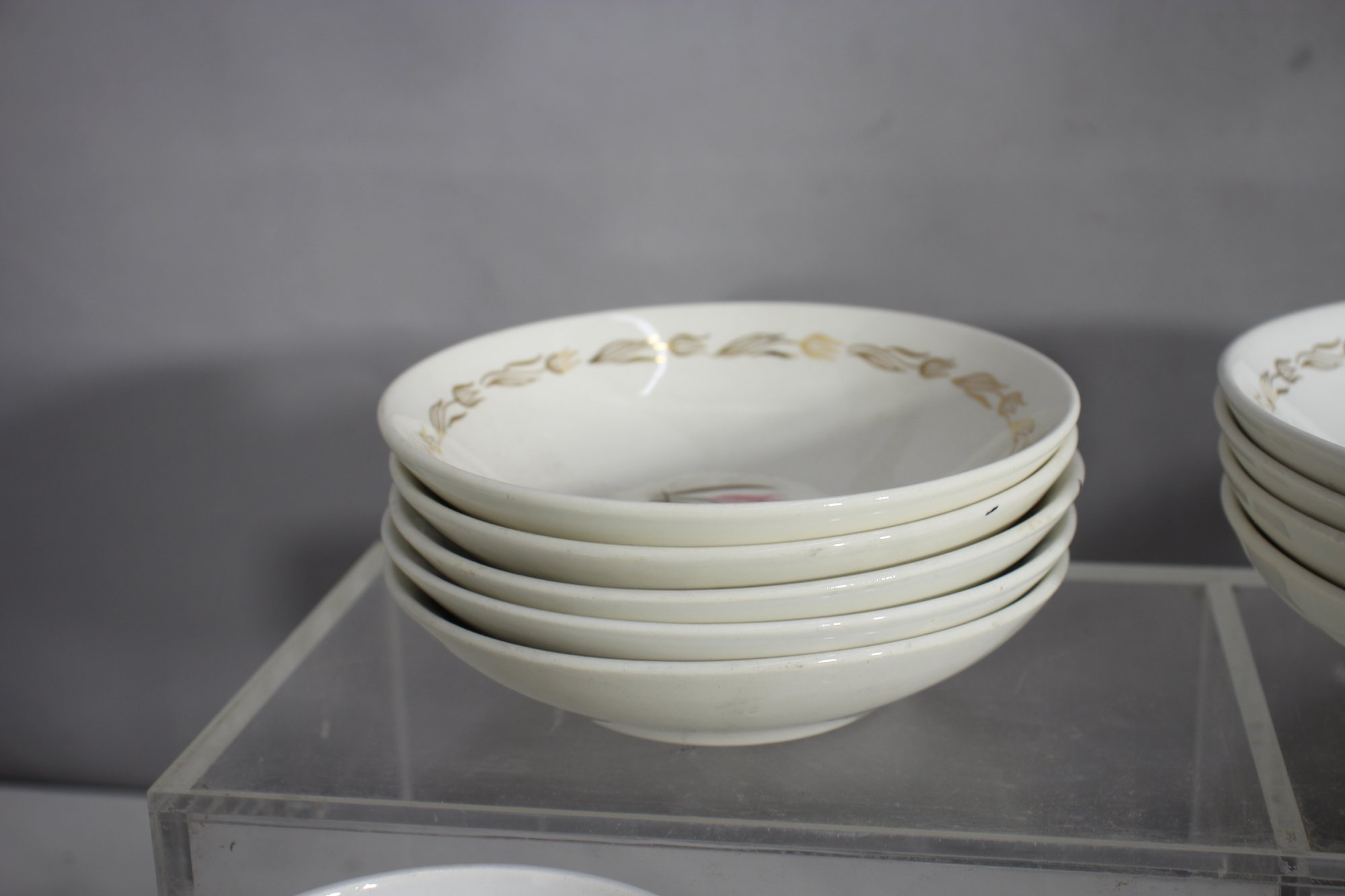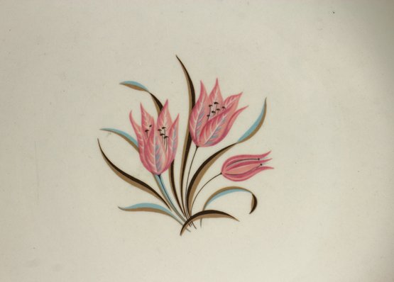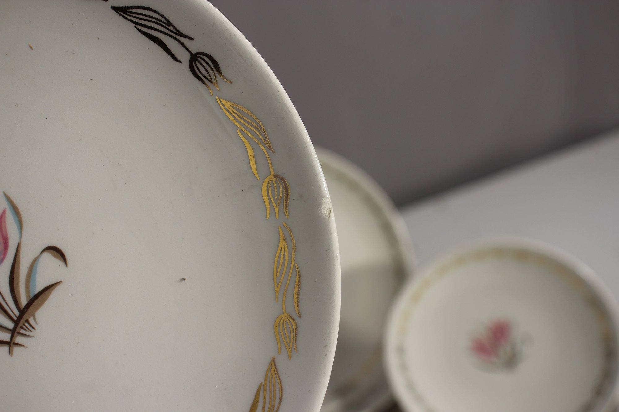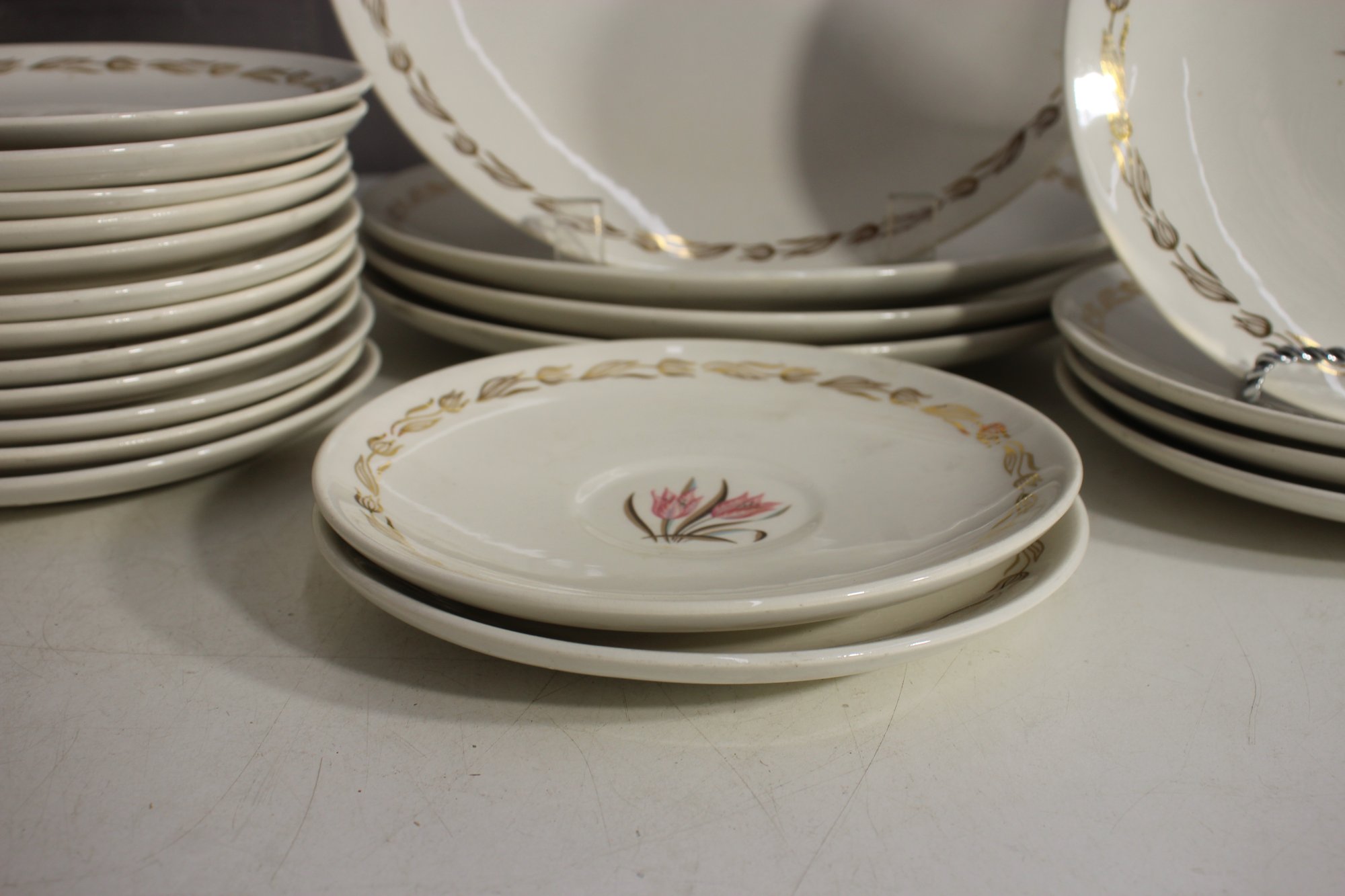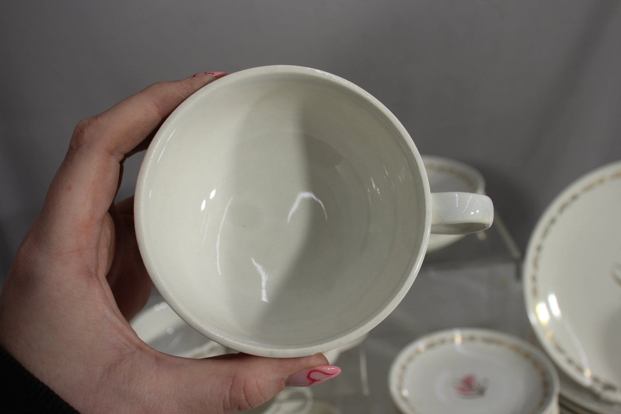 partial dinnerware set by Royal China features the "Enchantment" pattern, showcasing delicate pink tulip floral motifs with 22K gold-trimmed accents. The vintage design adds a classic and timeless touch to any table setting.
