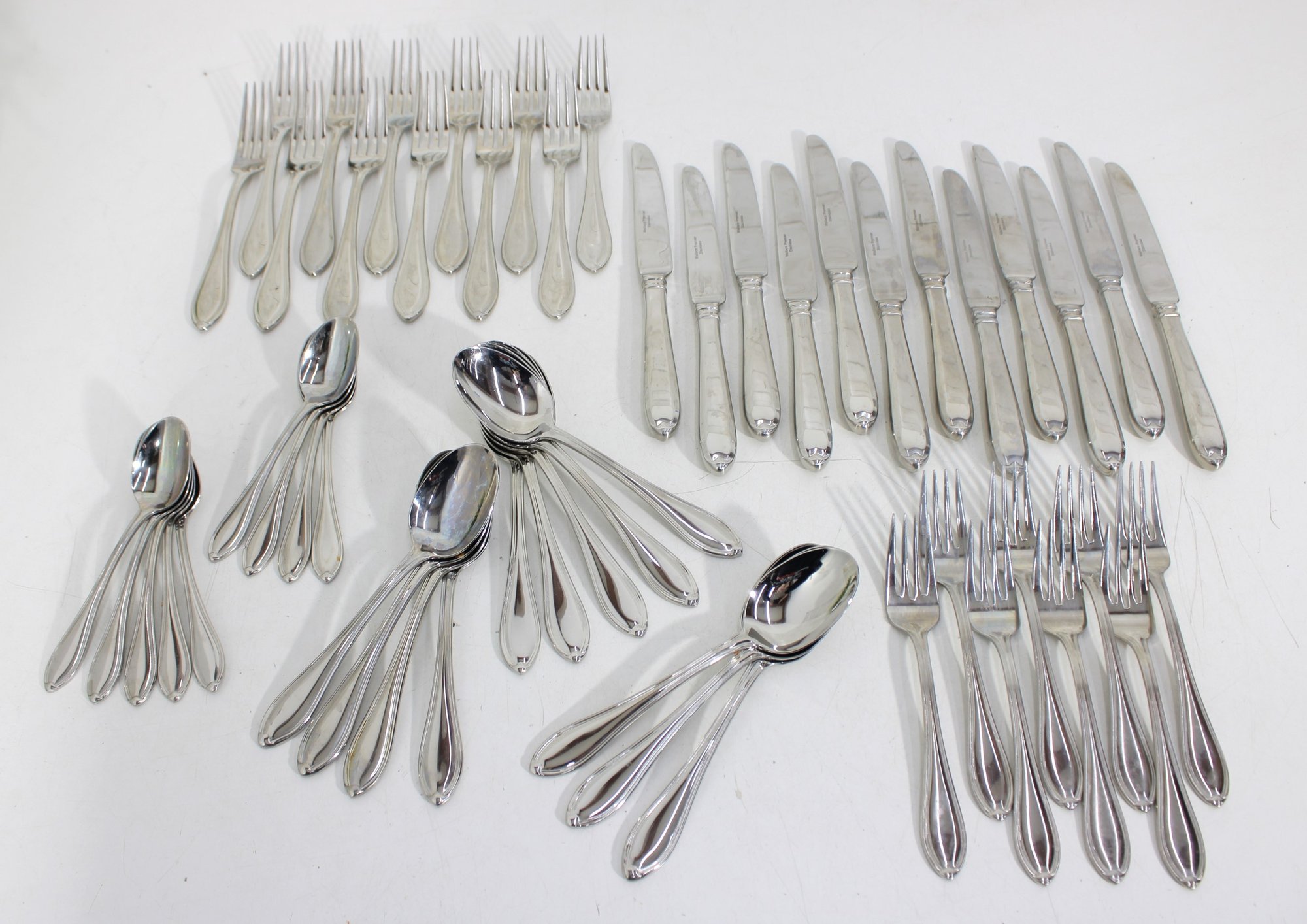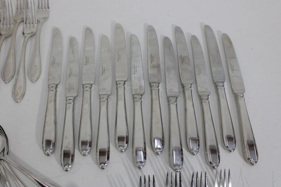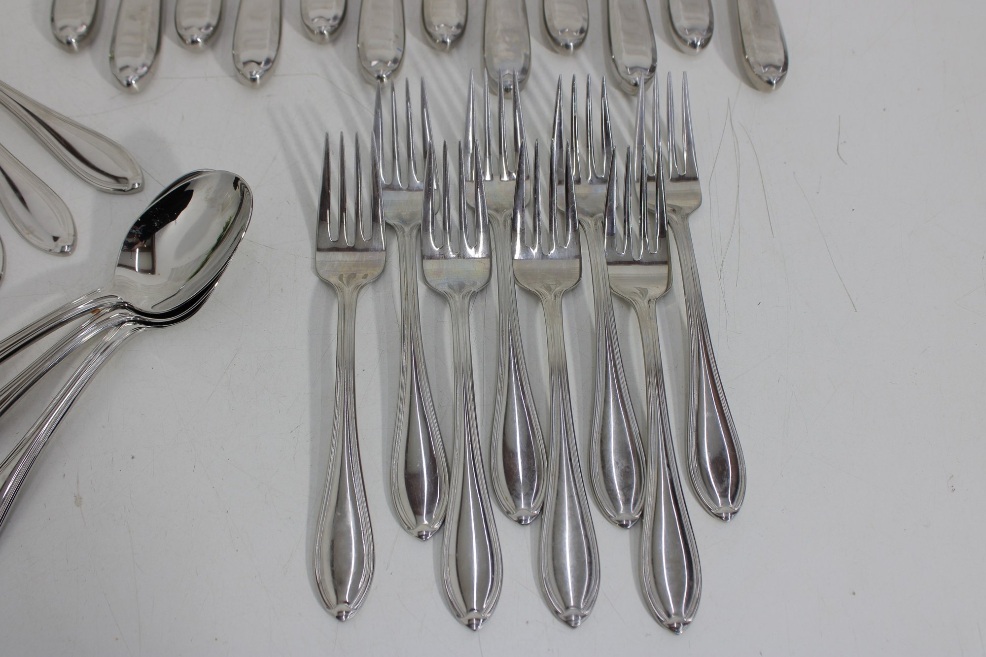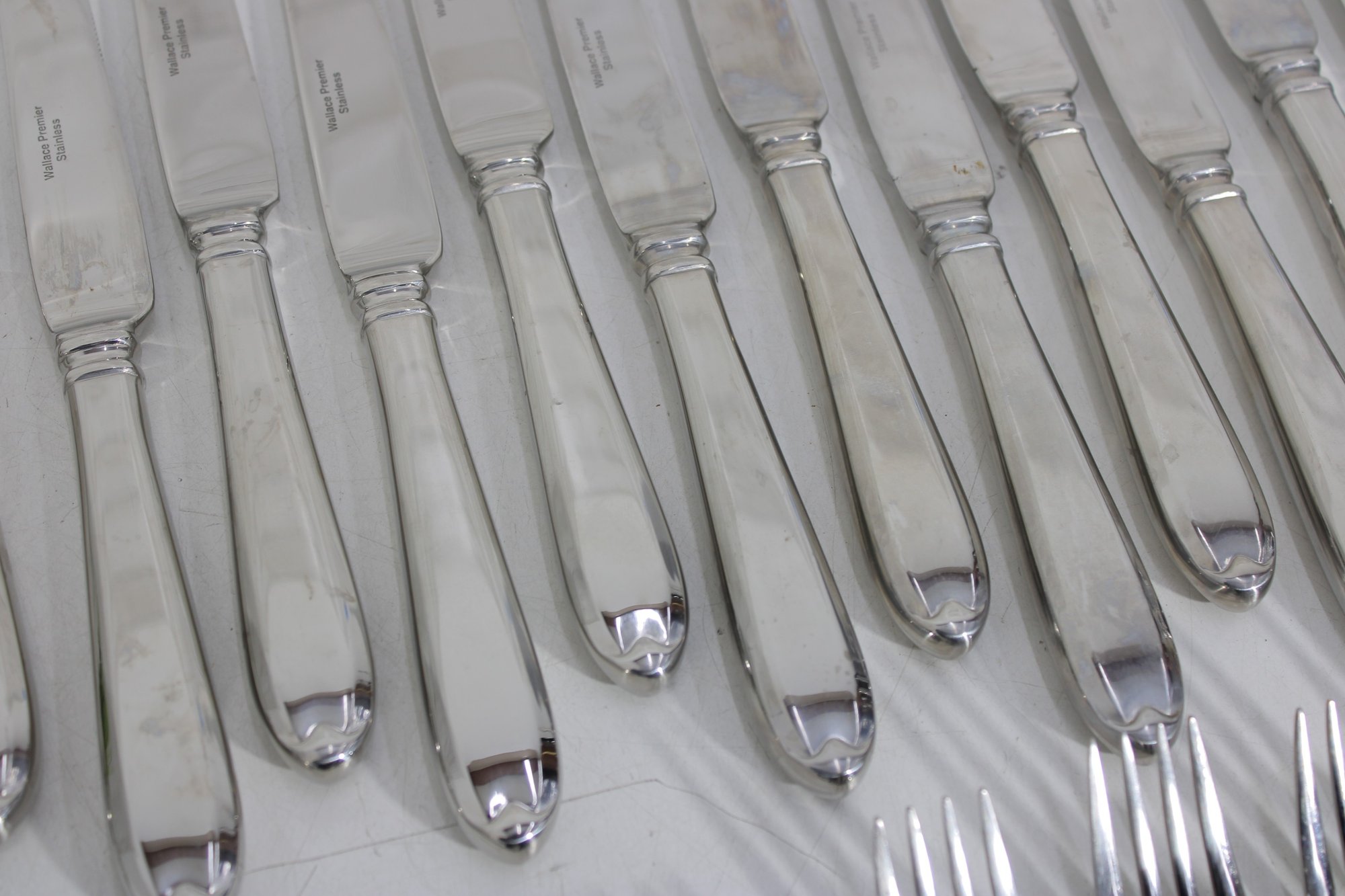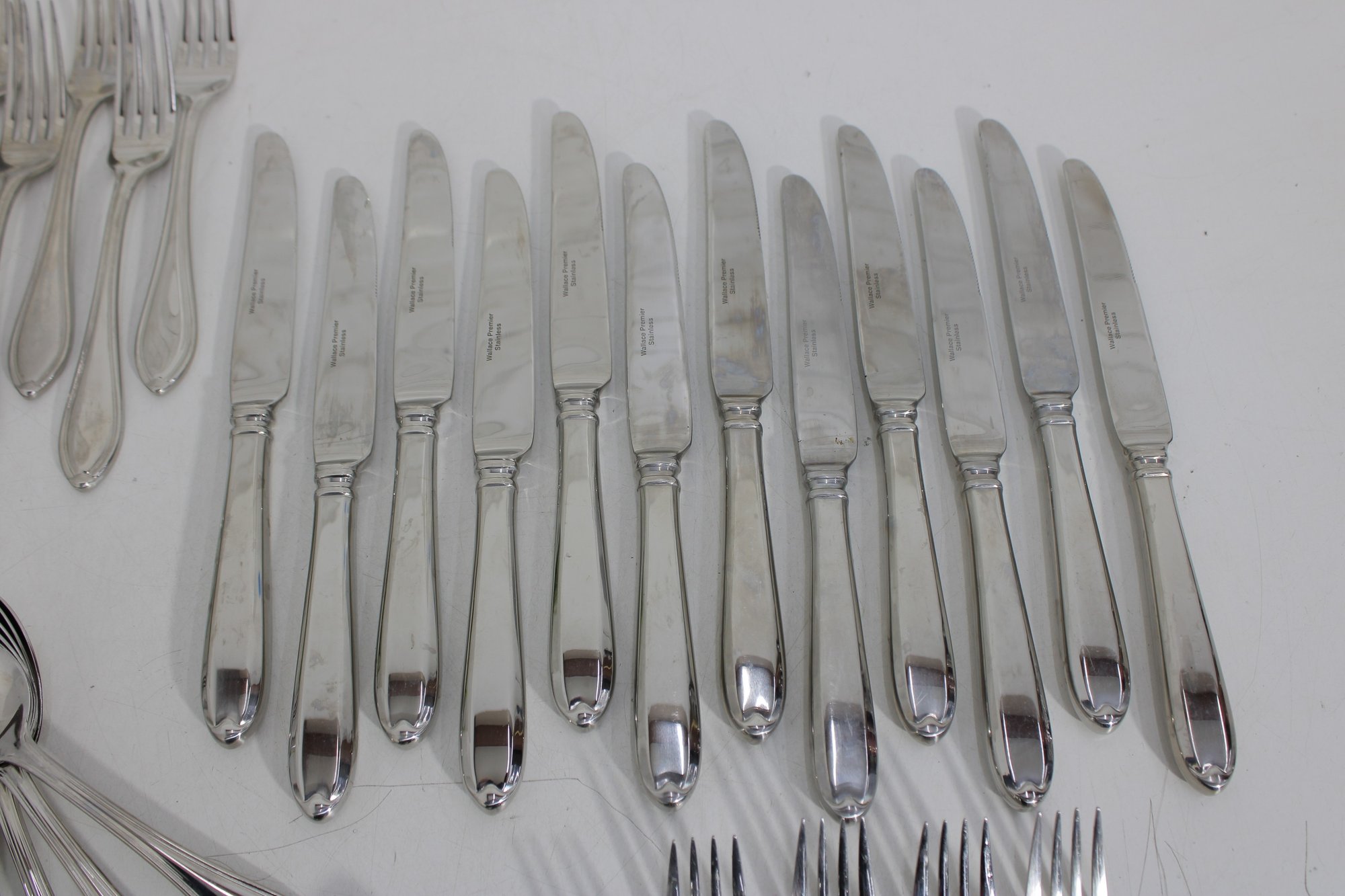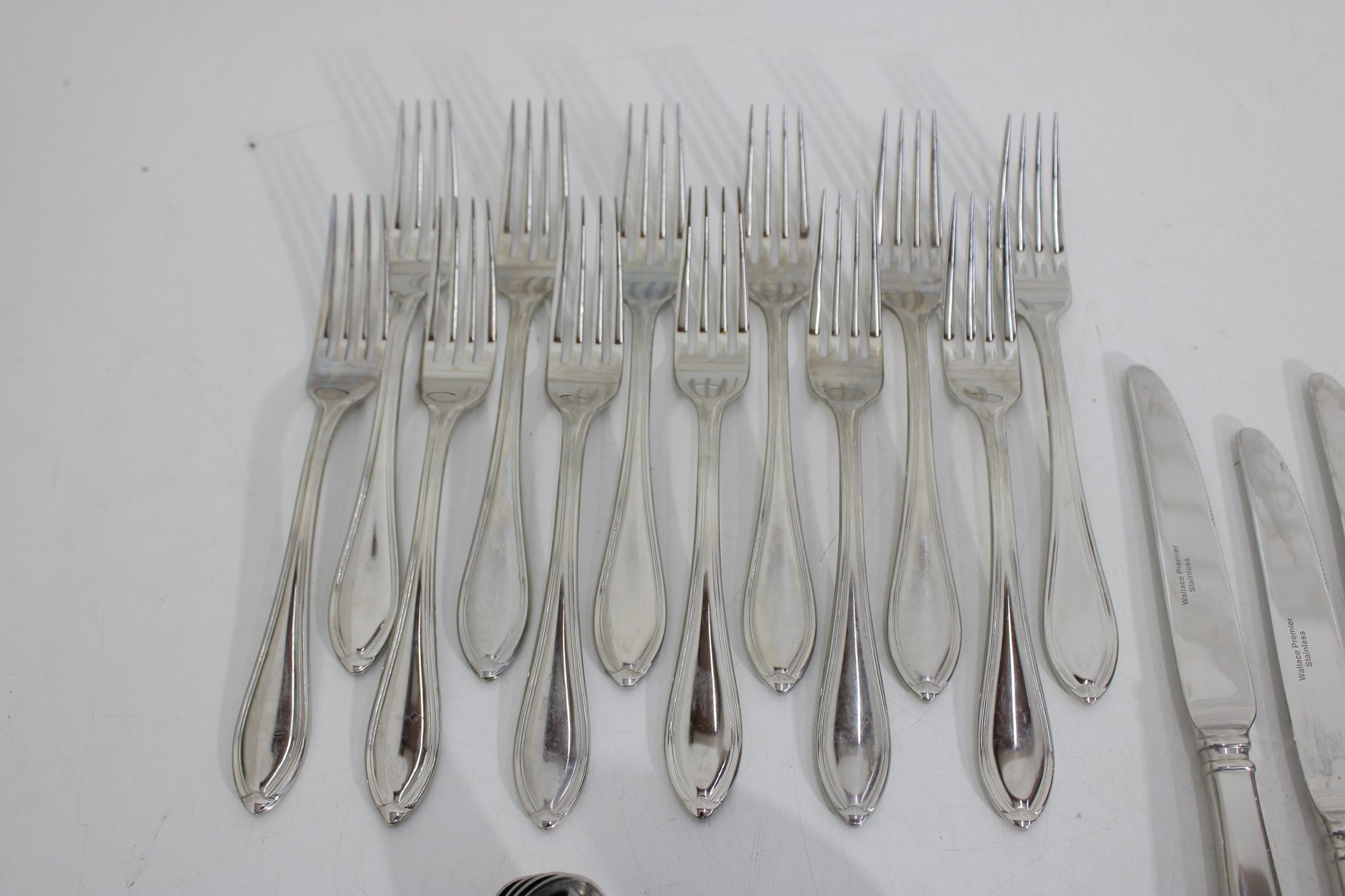 Attractive partial flatware set in the classic Wallace Premiere pattern, crafted in durable stainless steel. This lot includes a coordinated mix of dinner knives, forks, and spoons, all matching in style with graceful, teardrop-shaped handles and a timeless silhouette.