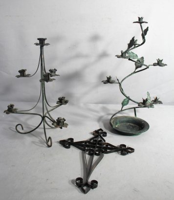 Included are three distinct candle holders: the first, a statuesque centerpiece, stands poised with its elegantly curved arms and cupped floral holders poised to cradle the flickering dance of candle flames. The second, an organic vine-inspired piece, artfully twists and climbs, its leaves and blooms creating whimsical perches for votive candles. The third is a compact, circular holder, designed to cast intimate glows in cozy corners.