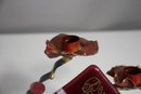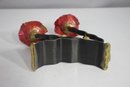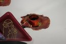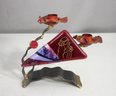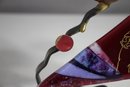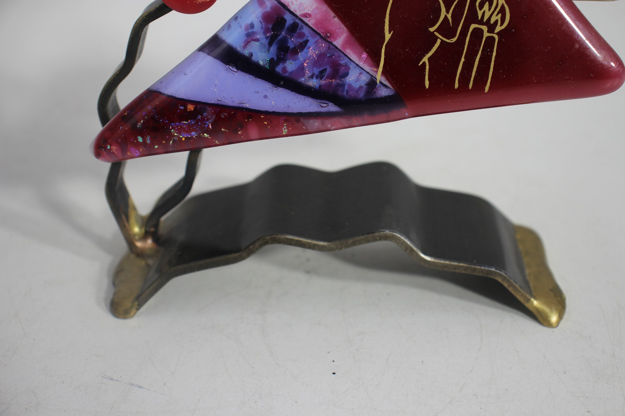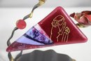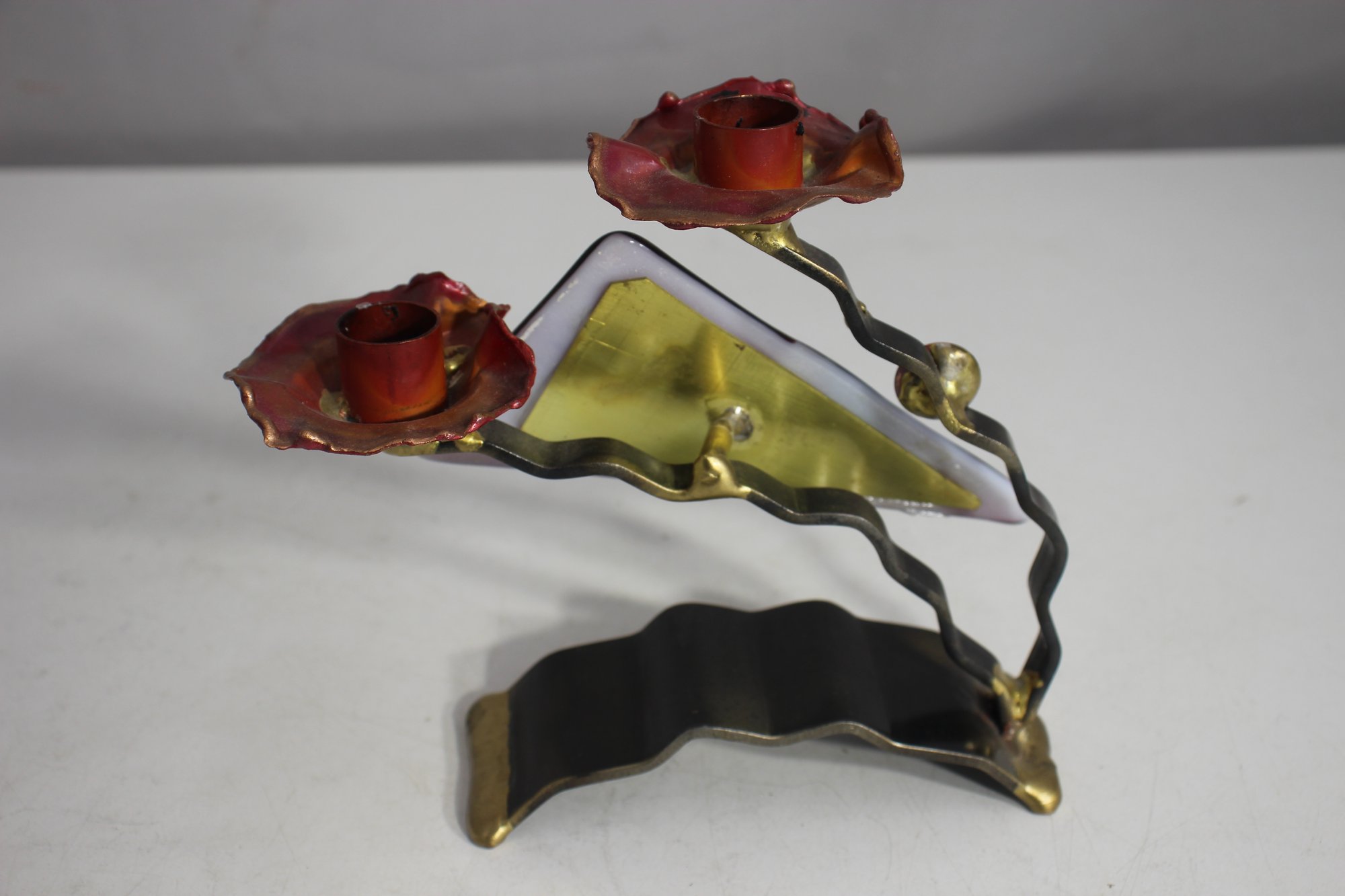 This stunning handcrafted Shabbat candle holder by renowned Judaica artist Gary Rosenthal blends metal, fused glass, and brass into a striking contemporary design. The piece features a bold triangular red glass panel with an etched figure, abstract fused glass accents, and sculptural metal branches supporting two candle holders.