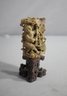 this evocative soapstone carving, titled "Scholar's Meditation," stands at an elegant 6 inches upon a rugged stone base which beautifully juxtaposes the soft hues of the soapstone against the raw, natural textures of its foundation