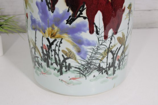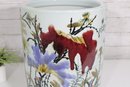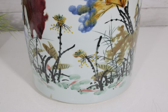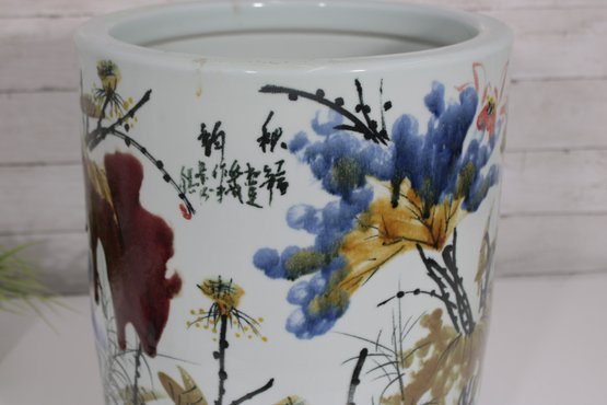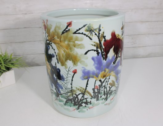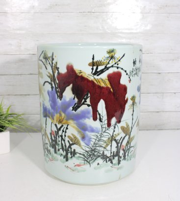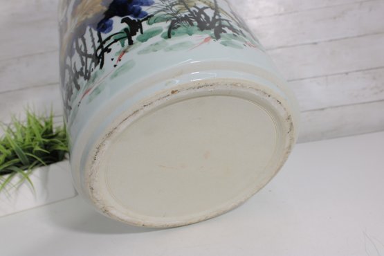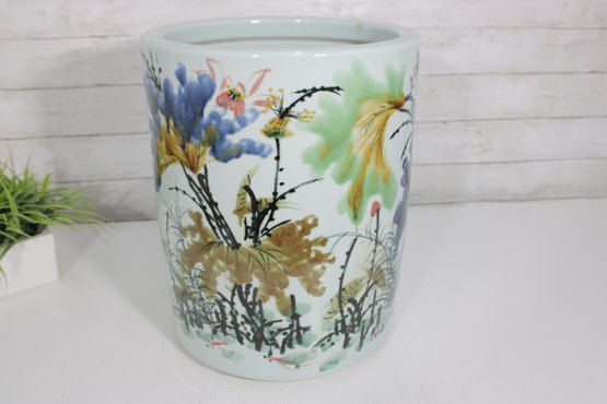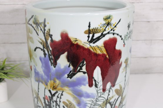 an artistic and cultural touch to your décor with this beautiful Asian-style ceramic planter or fish bowl. Measuring approximately 6 inches tall and 12 inches in diameter, this wide, rounded piece features vibrant hand-painted scenes of florals and animals, including a striking red fox-like figure among colorful foliage.