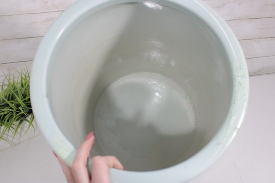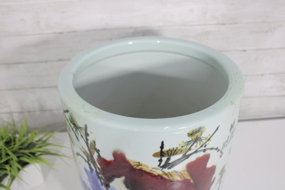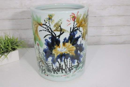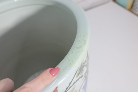The design is enhanced with delicate brushwork, soft background tones, and traditional-style calligraphy, giving it a refined and decorative appeal. Its wide opening and substantial ceramic construction make it ideal for use as a planter, cache pot, or decorative centerpiece.
