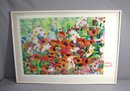 framed on a white metal frame ,The piece bursts with a lively depiction of poppies in a variety of warm hues that bring to life the essence of a blooming meadow. Set against a backdrop of lush greens and soothing pastels, the floral arrangement is both dynamic and soothing to the eye.