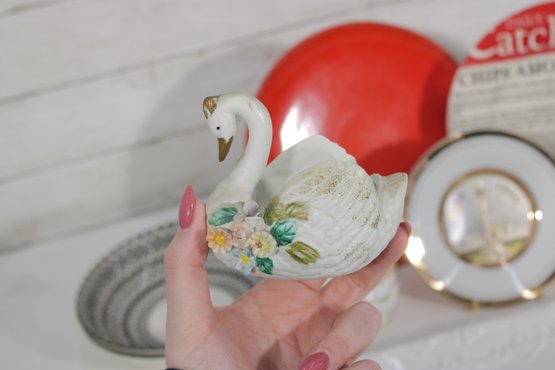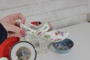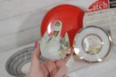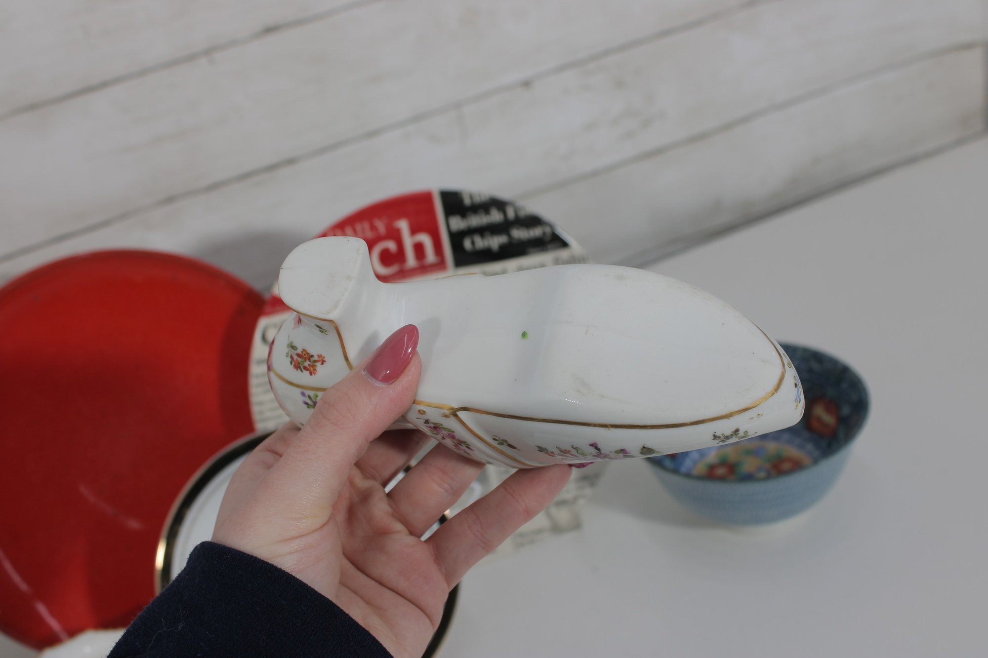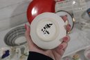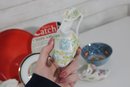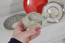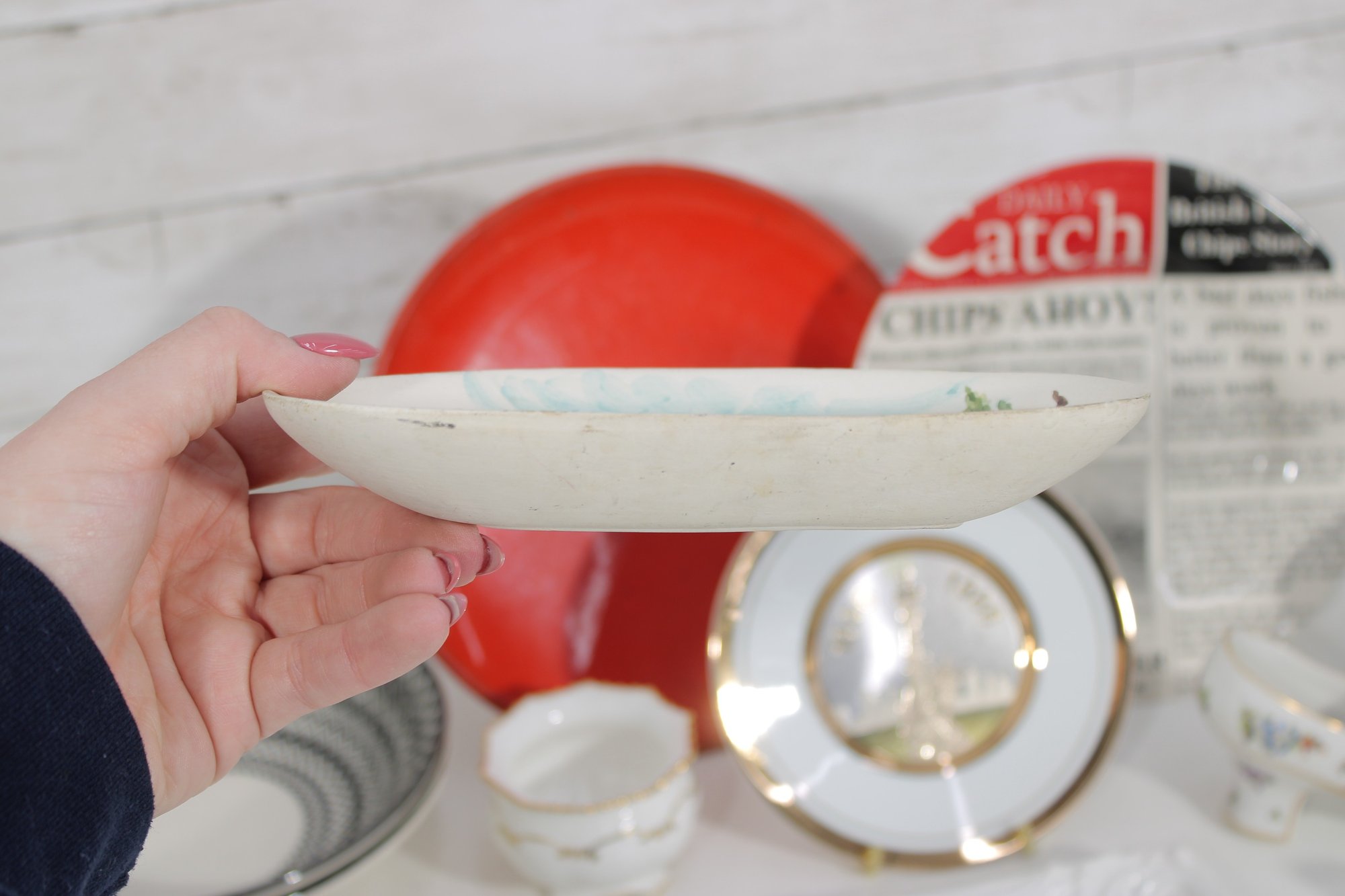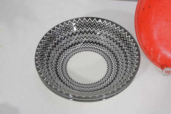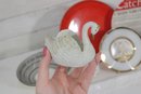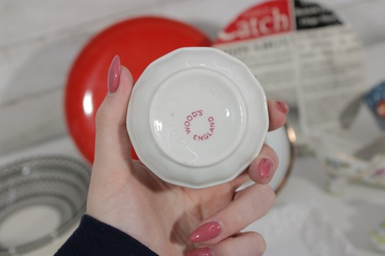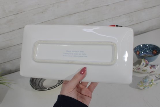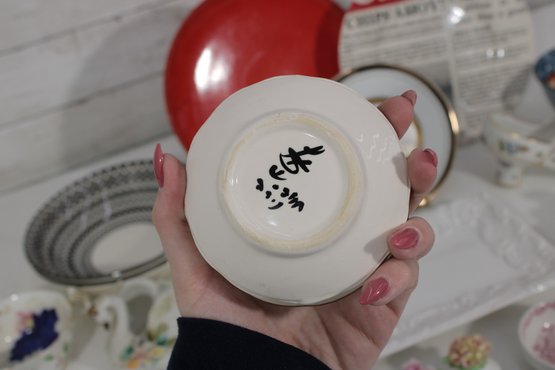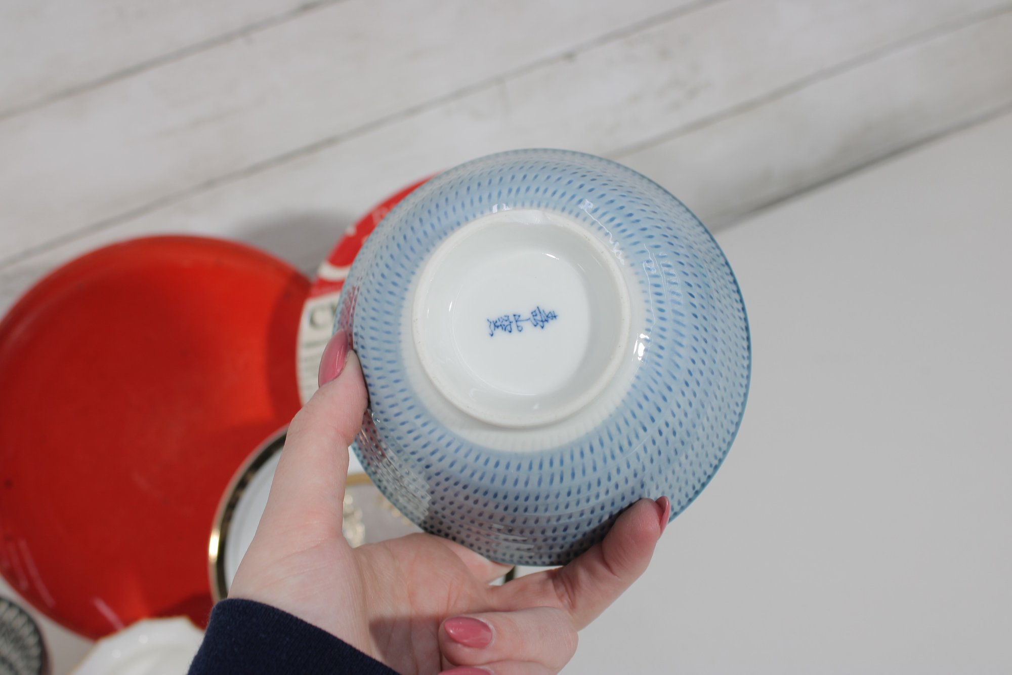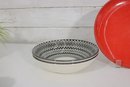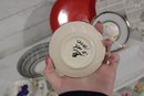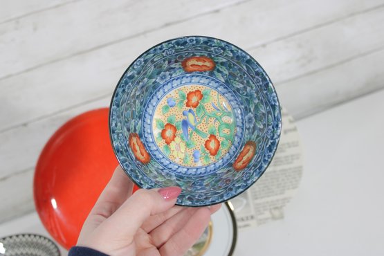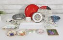 Assorted group lot of decorative housewares and tableware, including bowls, plates, small dishes, serving pieces, a red tray, a decorative tin, and other miscellaneous display and kitchen items in a variety of colors, patterns, and materials. A fun mixed lot with useful and decorative pieces suitable for everyday use, resale, collecting, or repurposing.