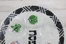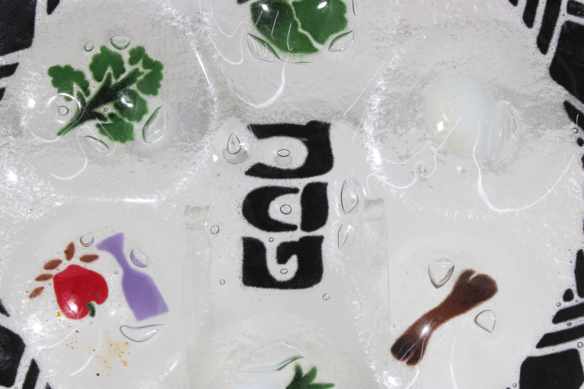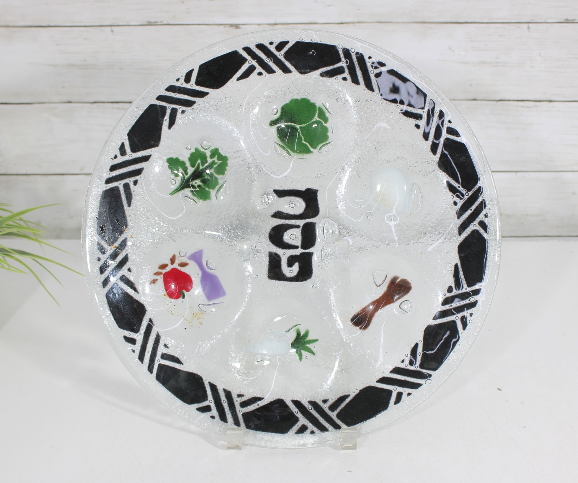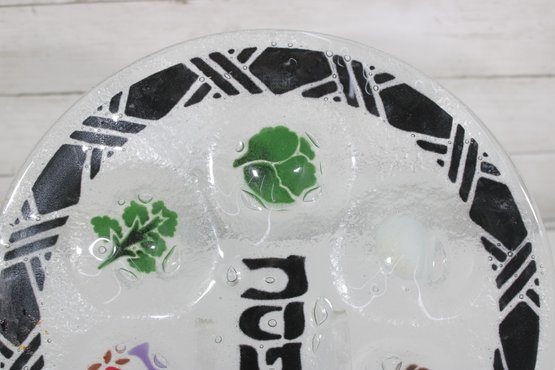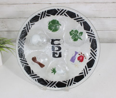 Beautiful Passover Seder plate featuring traditional compartments for the symbolic foods of the Seder meal. This 13.5" plate is decorated with colorful illustrations representing the ritual items, along with bold Hebrew lettering at the center.