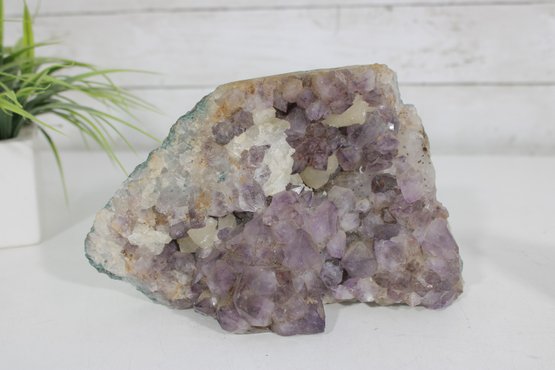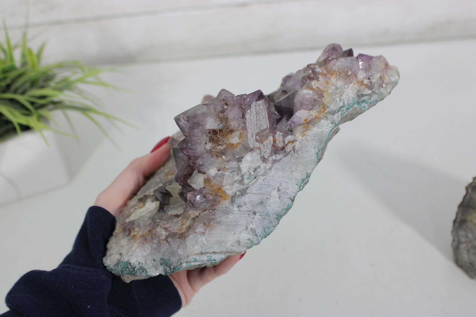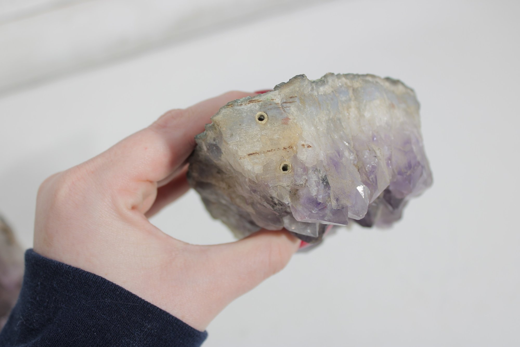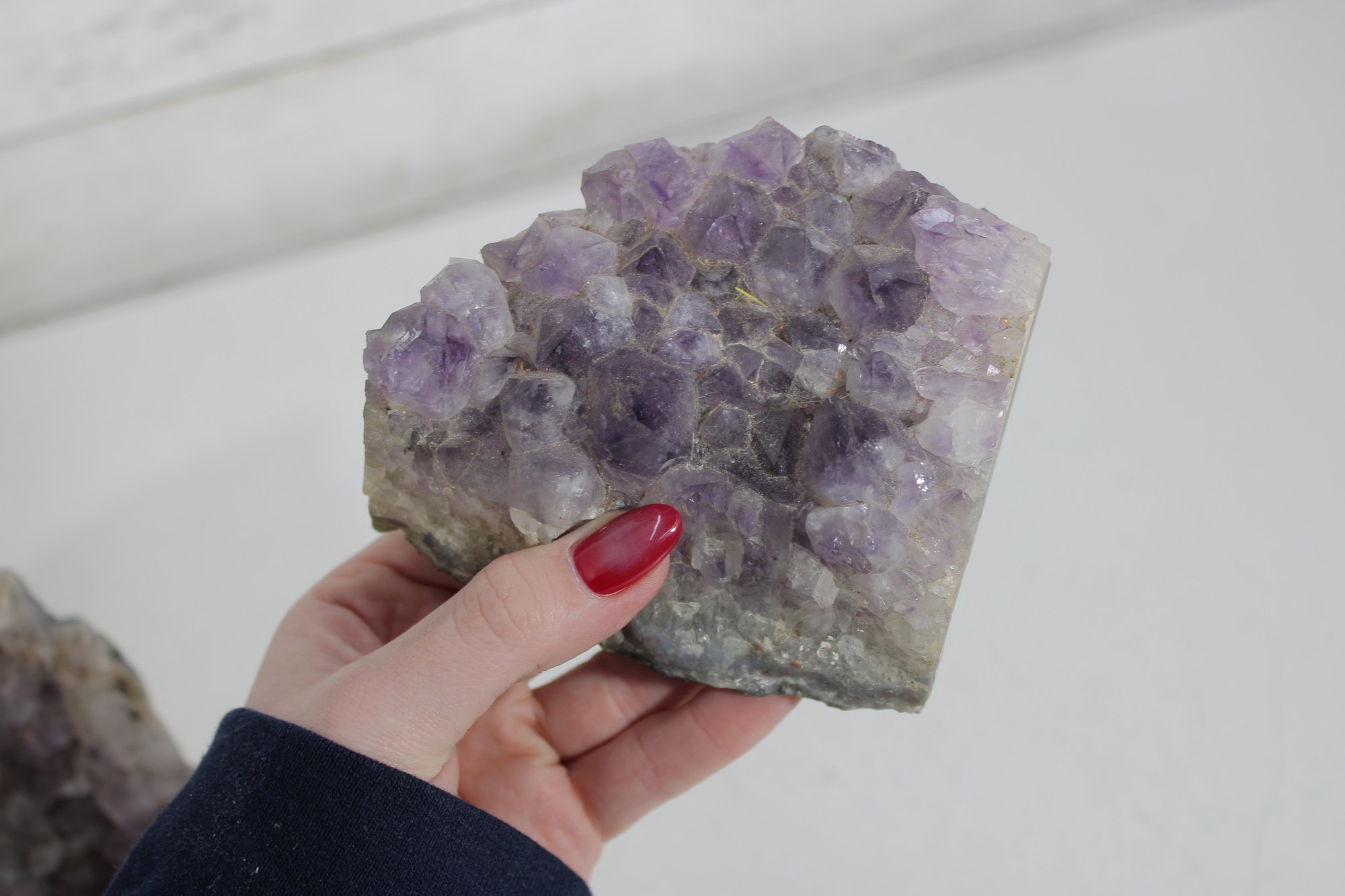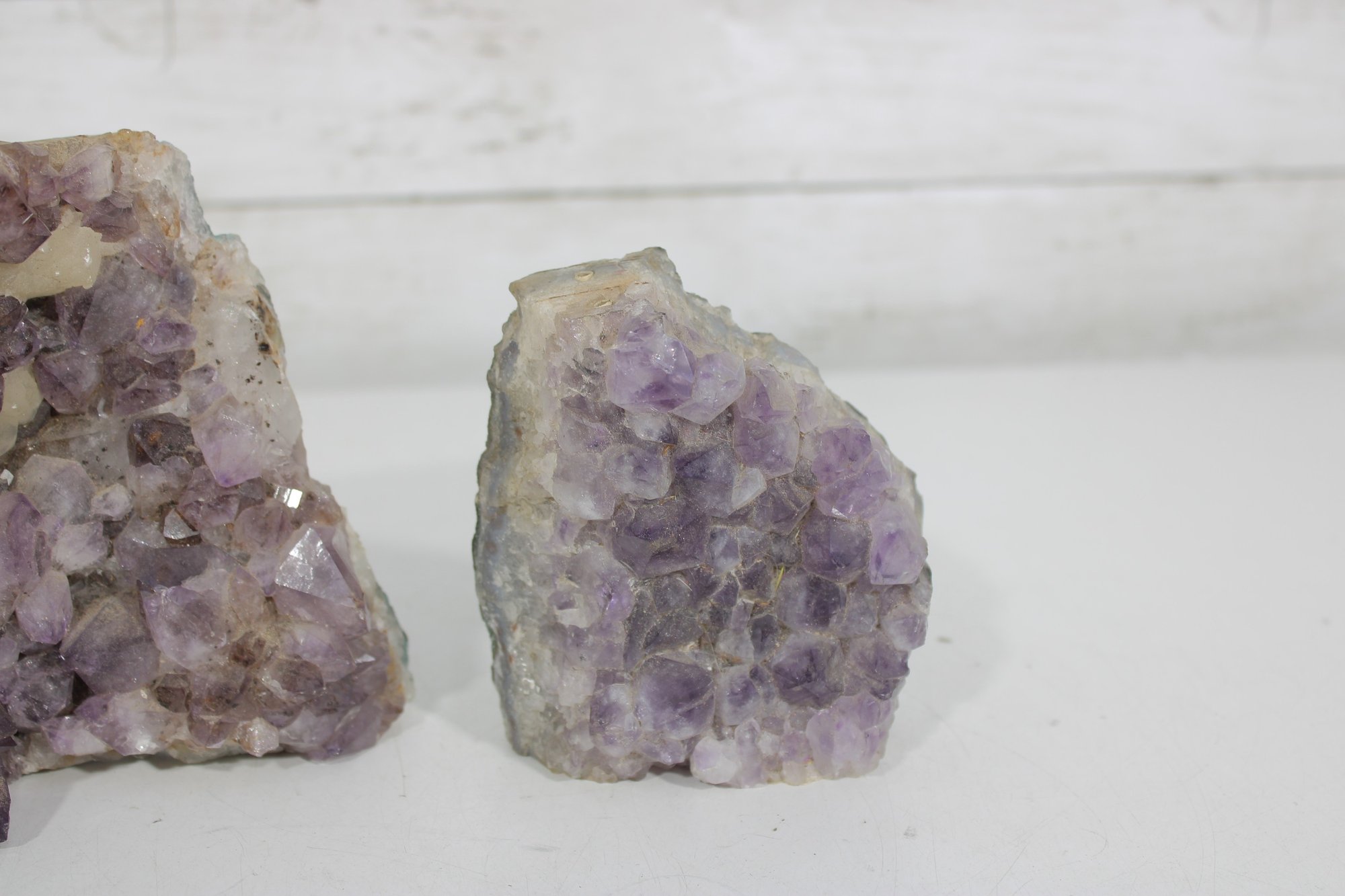 Beautiful pair of natural amethyst crystal clusters featuring rich purple hues and sparkling druzy formations. These raw mineral specimens measure approximately 6 inches and 4.5 inches tall, making them ideal for display, collection, or decorative use.