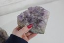Each piece showcases unique crystal growth patterns with varying shades of lavender to deep violet, complemented by natural matrix backing. The larger specimen displays a broad face of clustered points, while the smaller piece offers a compact, well-defined formation.
