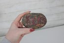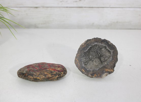 Nice pair of natural mineral specimens including a sparkling crystal geode half and a polished multicolor stone. The geode features a rough natural exterior with a shimmering crystalline interior, while the smooth polished stone displays beautiful earthy tones with red and green coloration.