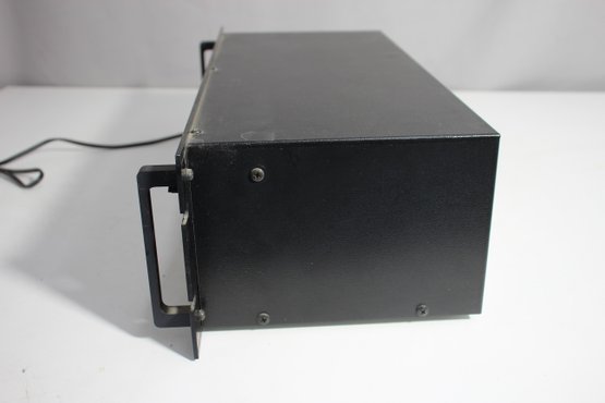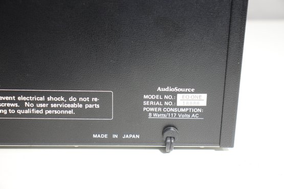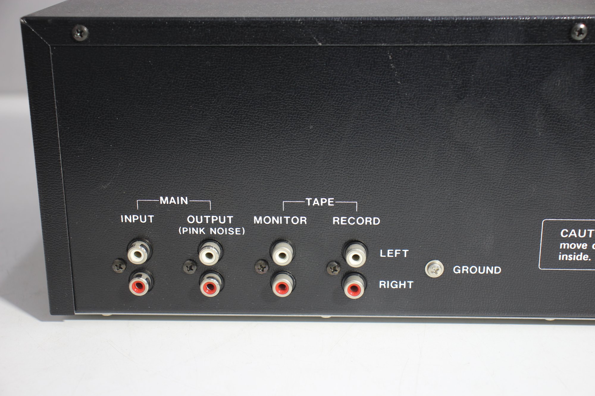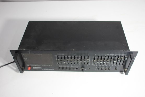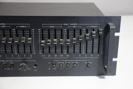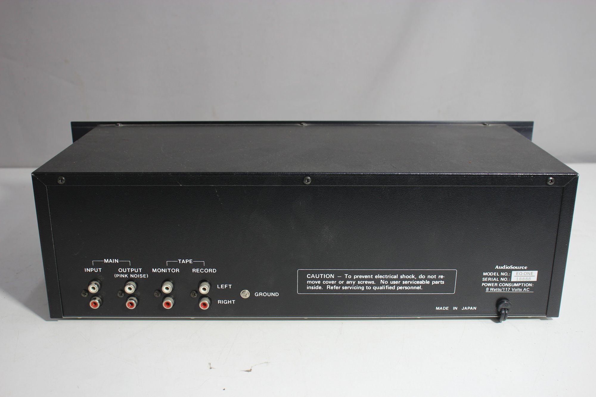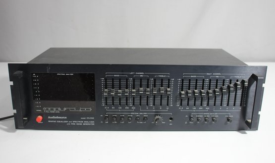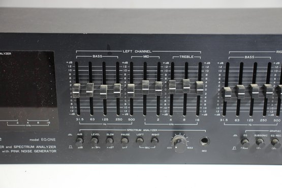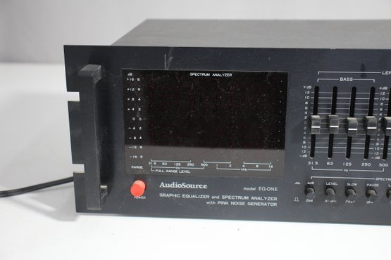 vintage AudioSource EQ-One Graphic Equalizer and Spectrum Analyzer with Pink Noise Generation. Made in Japan, this professional audio equipment is designed for precise sound control, featuring a full graphic equalizer with individual sliders for both channels and a spectrum display for frequency monitoring.