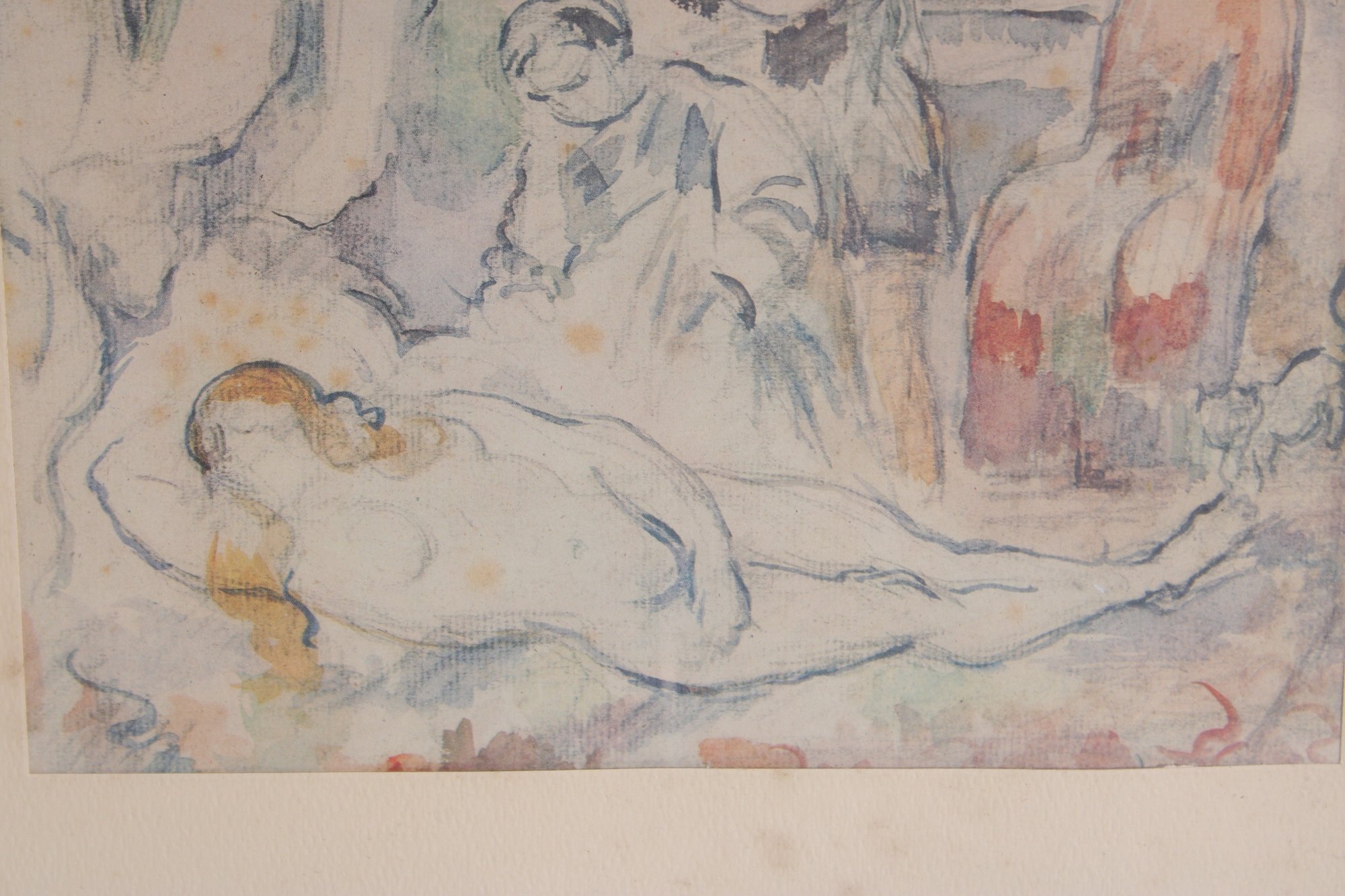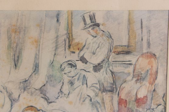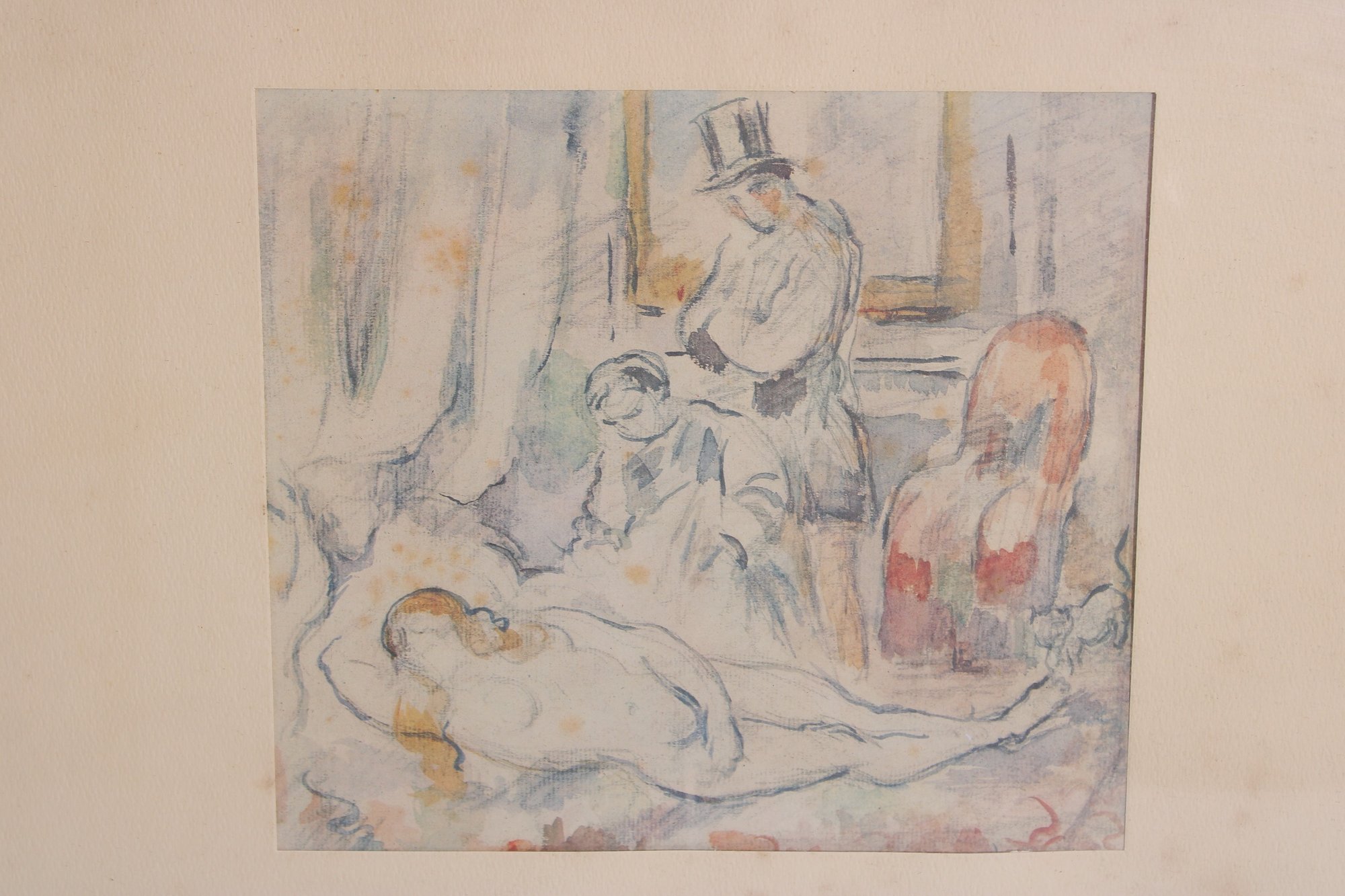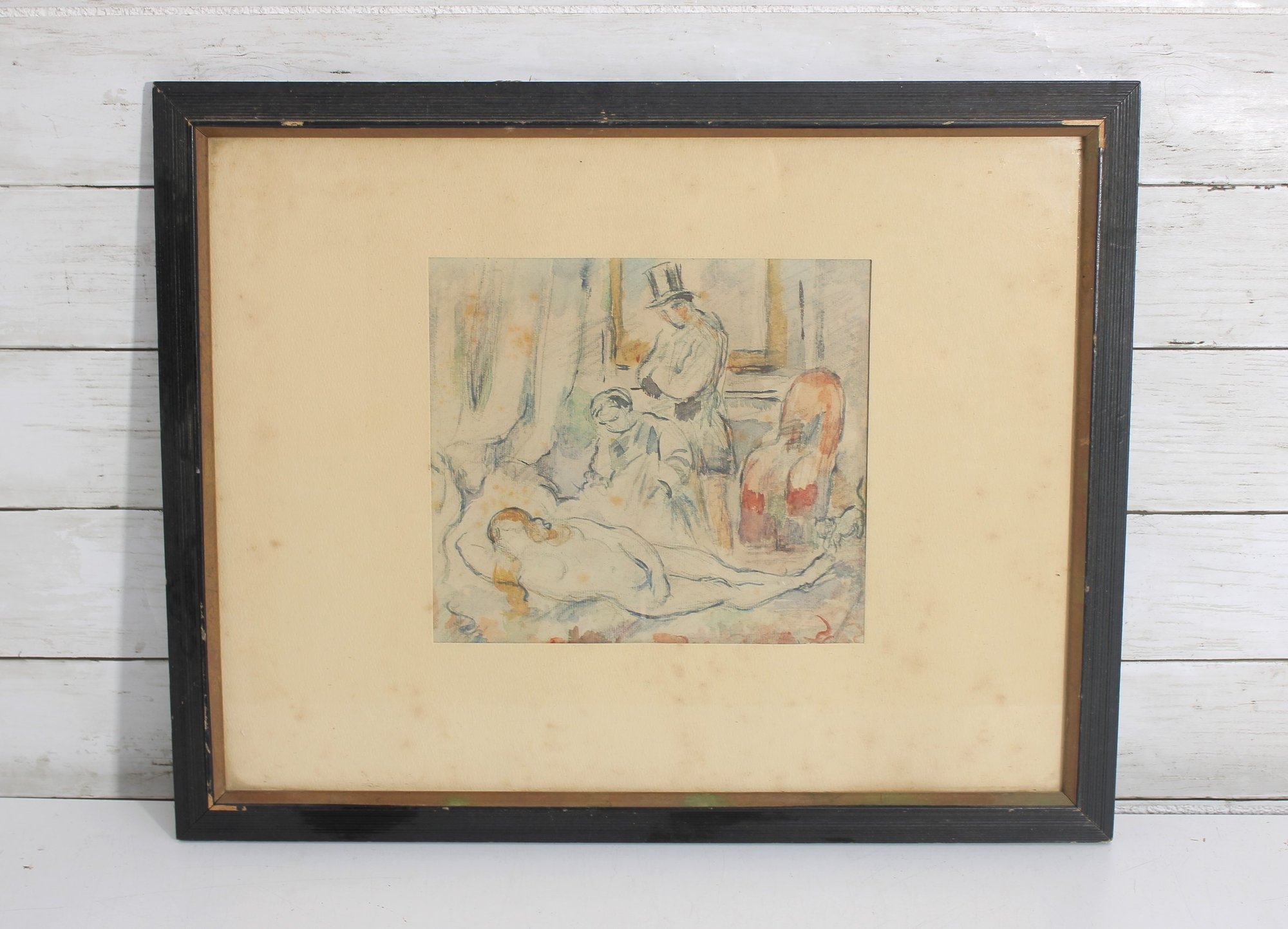 vintage framed print of “Olympia” by Paul Cézanne, a beautiful example of Impressionist-style artwork. The composition features a softly rendered reclining nude figure with additional figures in the background, executed in Cézanne’s characteristic loose brushwork and subtle color palette.