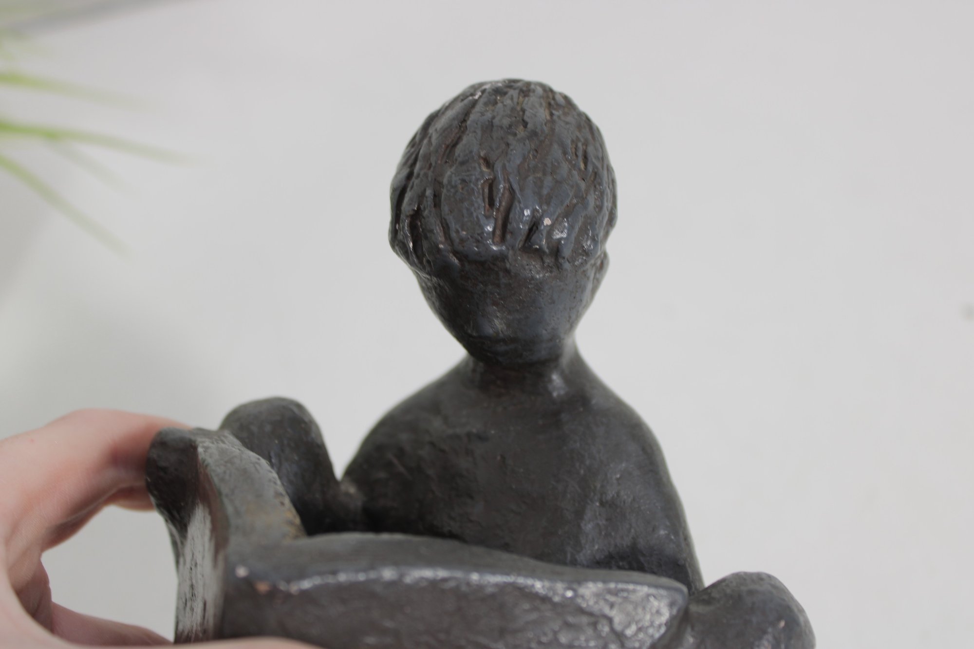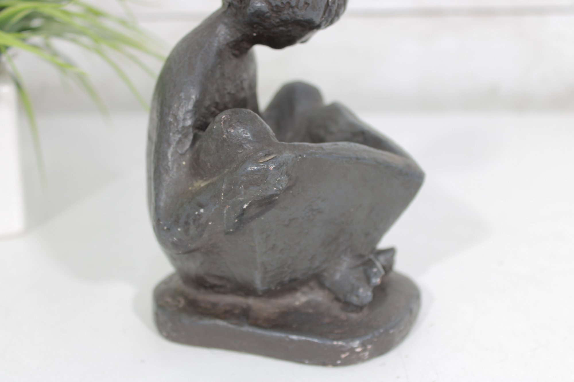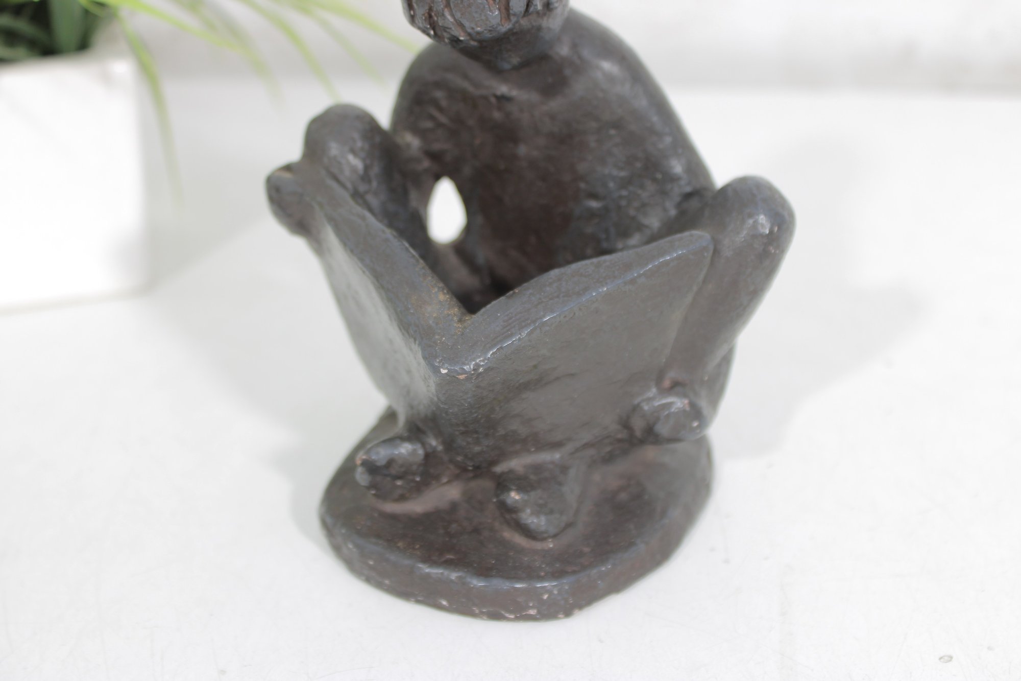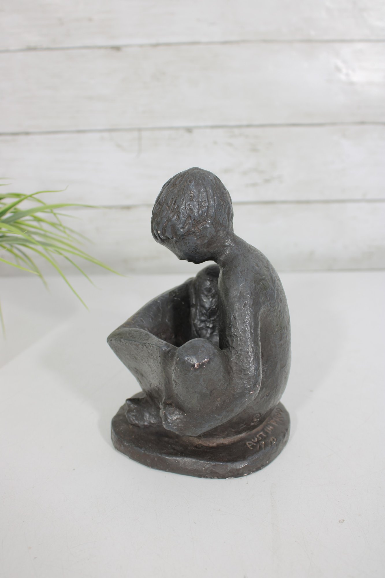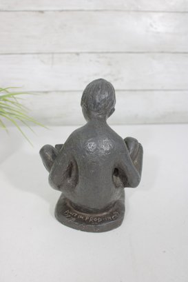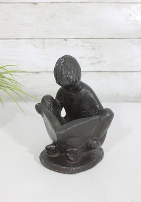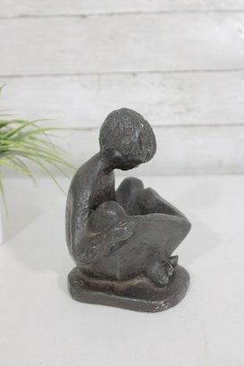 Charming vintage Austin Productions sculpture depicting a young child seated and reading a book. The figure is rendered in a textured dark finish, capturing a quiet, introspective moment with simple, expressive form.