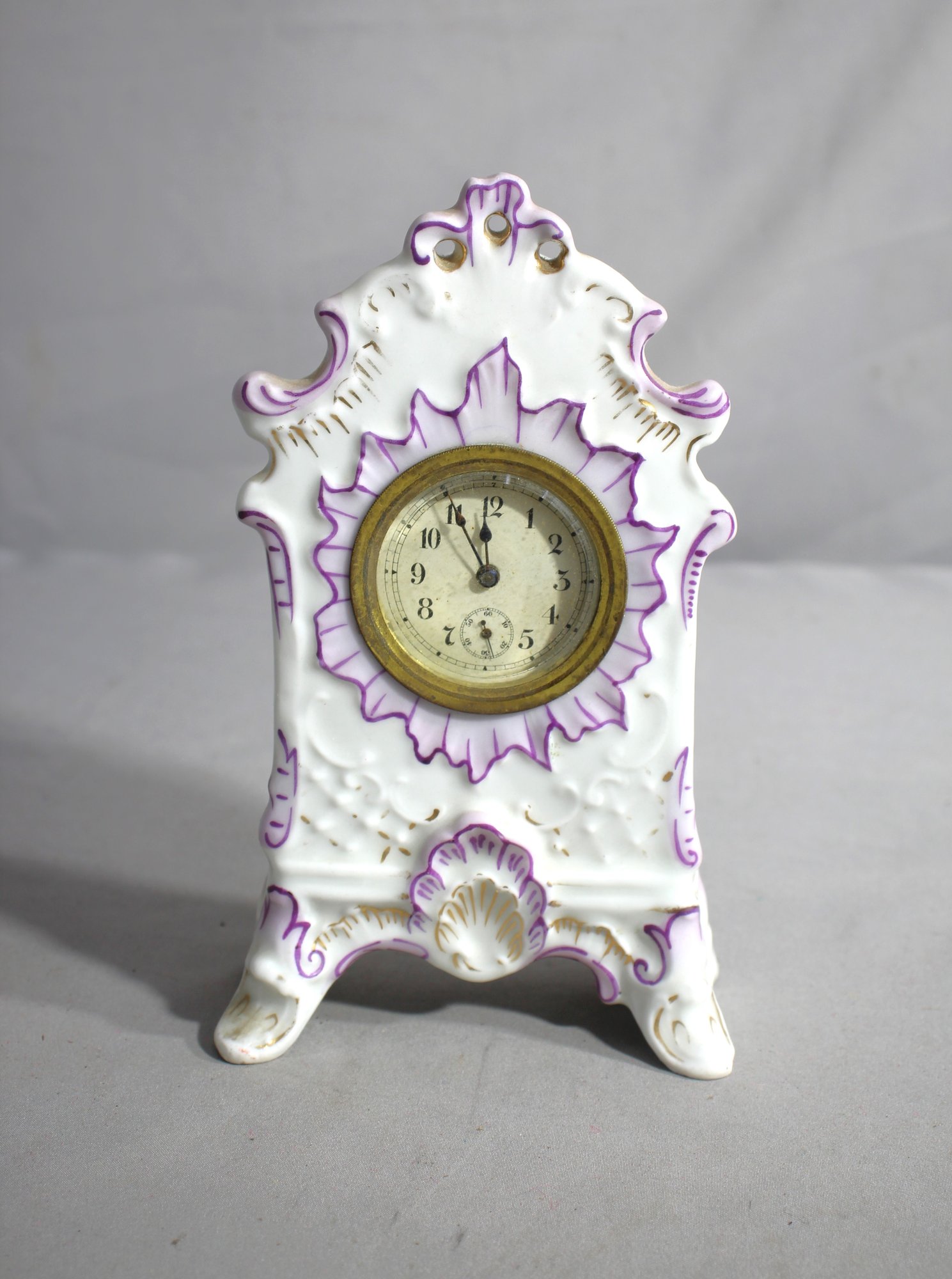 The clockâs body is a masterpiece of porcelain art, with delicate lavender accents highlighting its ornate scalloped edges and floral motifs. The face of the clock, framed by a golden ring, features classic numerals, a testament to the enduring elegance of its design.
