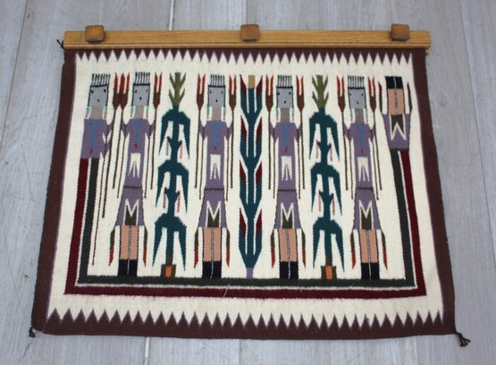 a remarkable Navajo Corn Yei rug, accompanied by a custom wooden wall hanging rack designed to showcase its intricate patterns and vibrant colors. This traditional Navajo weaving incorporates symbolic Corn Yei figures, which are important deities in Navajo culture.