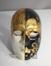This exquisite handcrafted Venetian half mask is an authentic piece from Venice, Italy, featuring a striking black and white base with intricate gold detailing. The mask’s dual-tone design and ornate gold accents give it a dramatic and sophisticated appearance, perfect for display or wearing to a masquerade. Measuring 9 inches in height and 5.5 inches in width, this mask is both a work of art and a piece of Venetian history.
