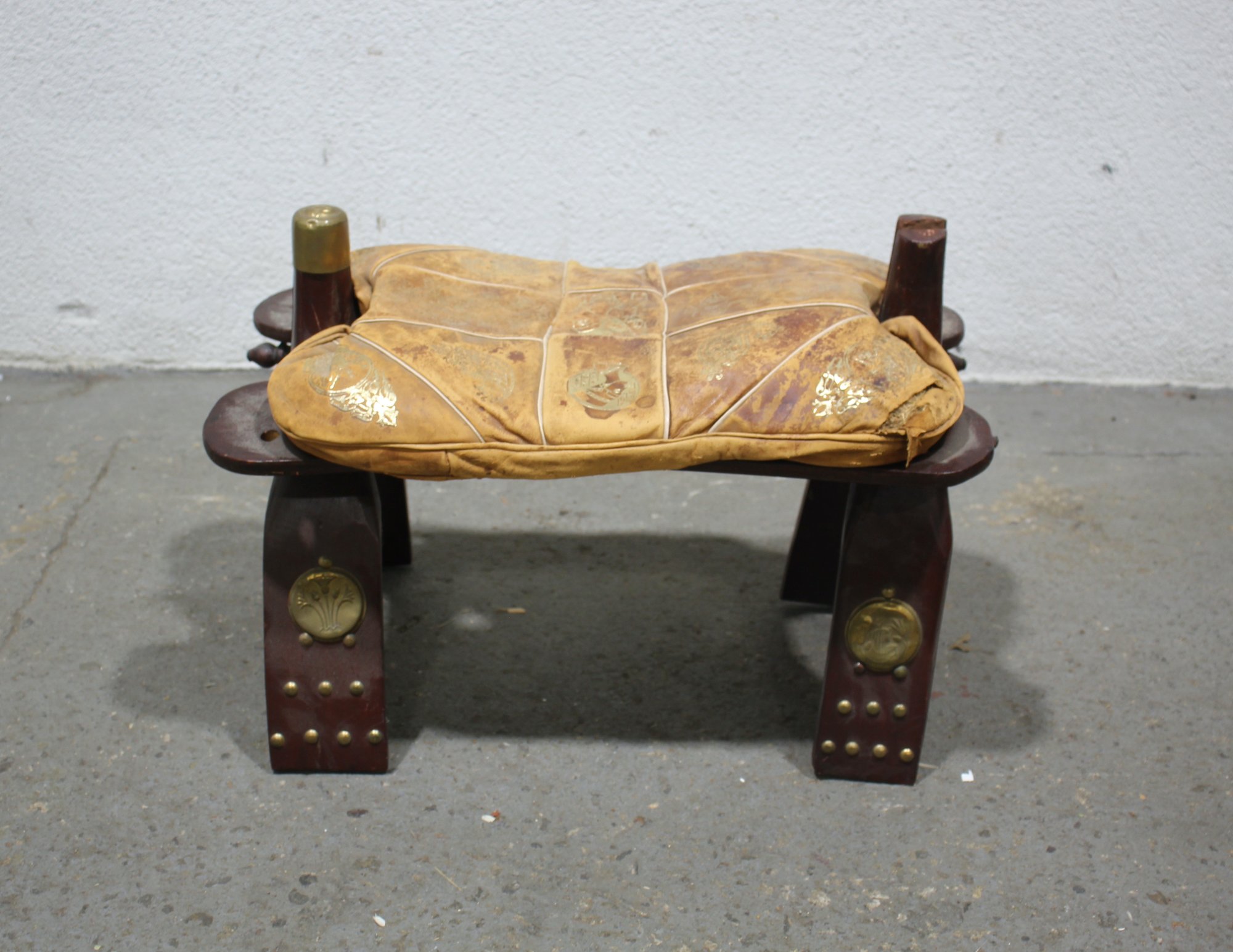 The saddle features a robust wooden frame, adorned with brass accents and rivets that not only reinforce the structure but also add an ornamental touch. The seat cushion, though worn from use and time, displays an intricate pattern that hints at its rich history and cultural significance