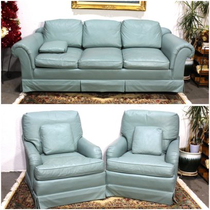 Elevate your living space with this elegant set from Baker Furniture, featuring a seafoam leather sofa and matching pair of armchairs. Known for their premium craftsmanship, this set boasts rolled arms, plush cushions, and a timeless design