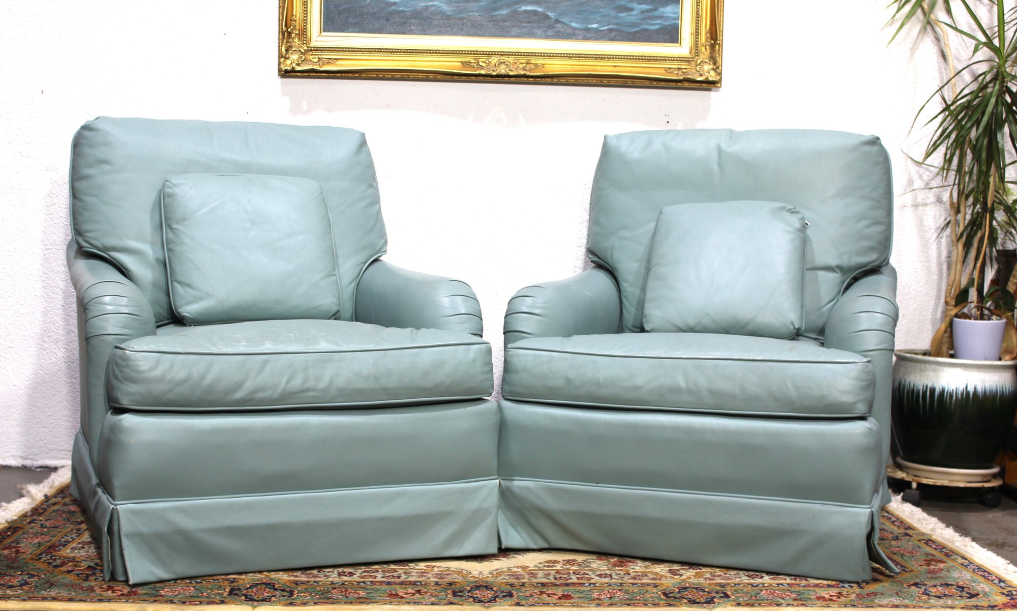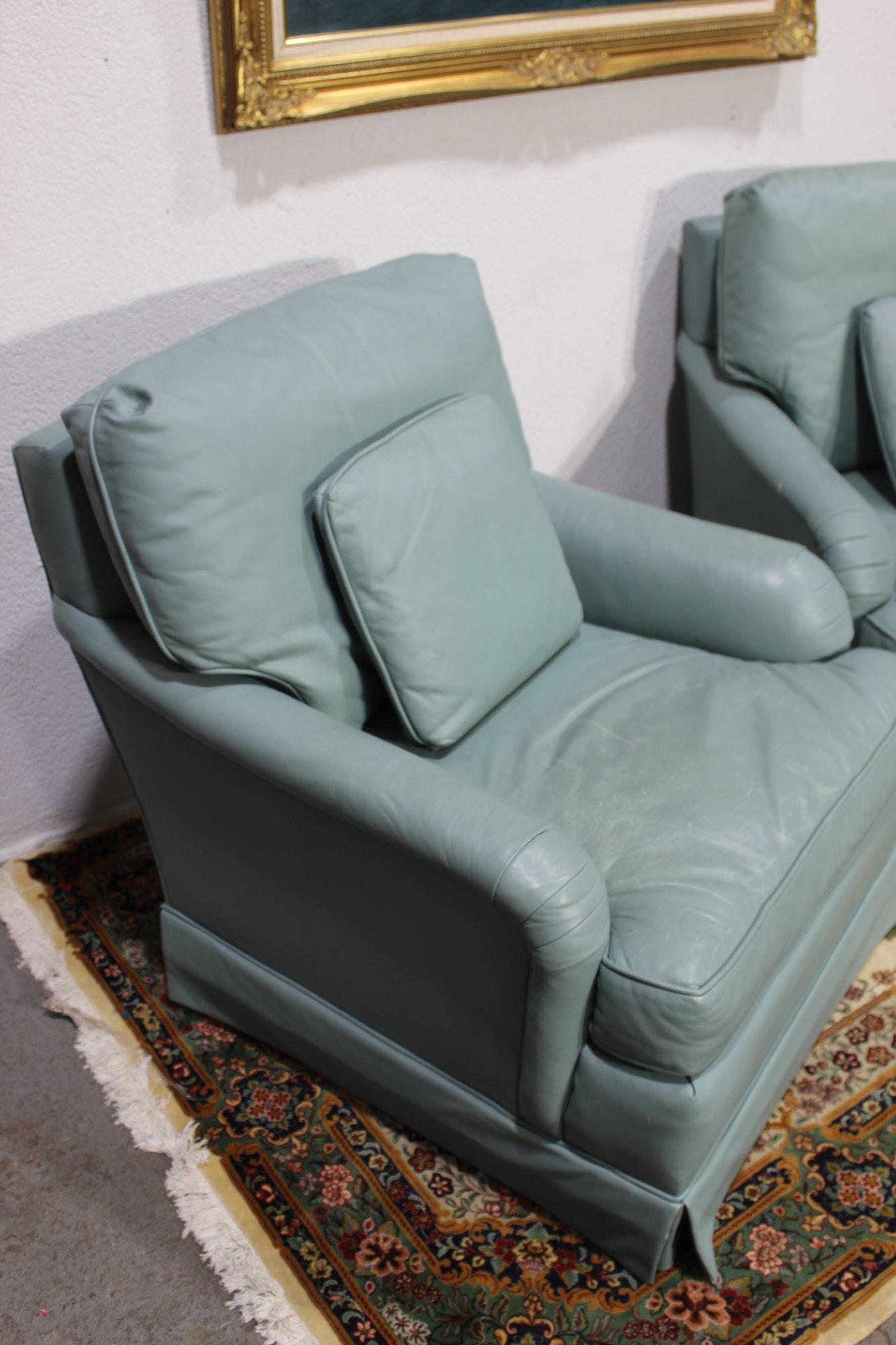 Elevate your living space with this elegant set from Baker Furniture, featuring a seafoam leather sofa and matching pair of armchairs. Known for their premium craftsmanship, this set boasts rolled arms, plush cushions, and a timeless design