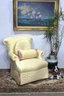 An elegant Baker Furniture upholstered armchair featuring a charming floral patterned fabric in soft yellow tones with pink accents. This high-quality piece includes a skirted base with decorative pink tassels, adding a sophisticated touch. The chair comes with two matching decorative cushions—a round tufted pillow and a bolster pillow with ruffled ends. Crafted by the renowned Baker Furniture Company of High Point, NC, this chair exemplifies timeless design and exceptional craftsmanship. The chair is in great vintage condition, with minor wear consistent with age (see photos for details). A luxurious addition to any traditional or classic interior!
