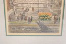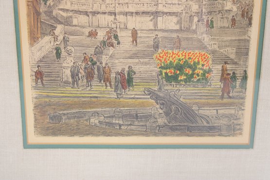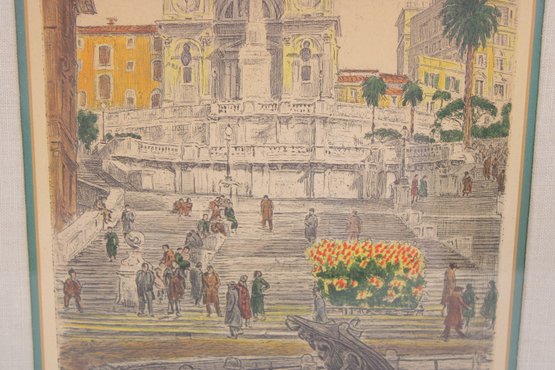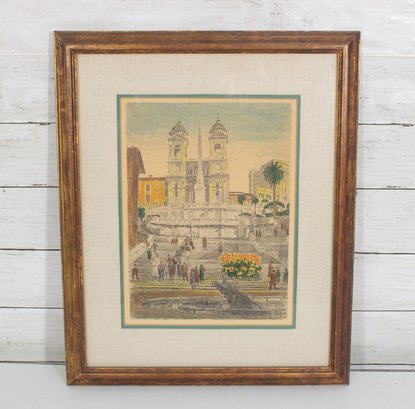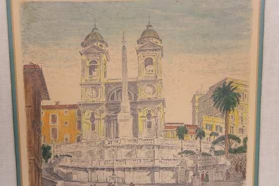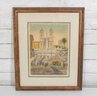 Beautiful signed artwork by Bela Sziklay, featuring a detailed European cityscape with classical architecture and a lively public square. The composition depicts an elegant church façade with twin towers, a grand staircase, and figures gathered in the foreground, accented by soft pastel tones and fine linework.