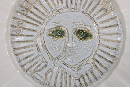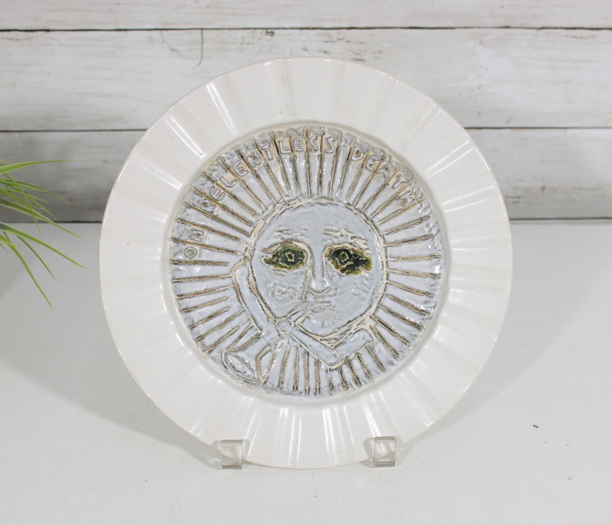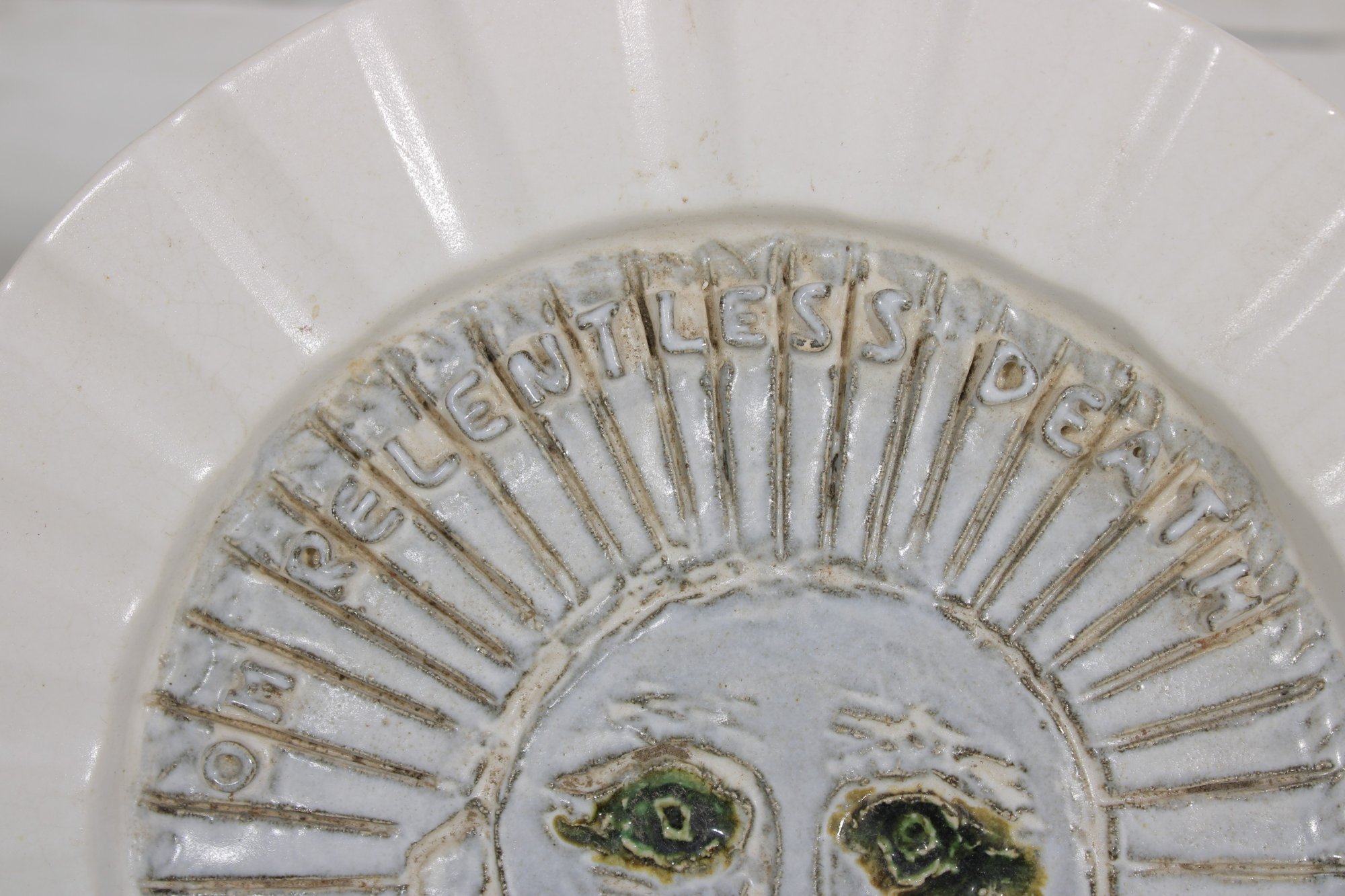 a striking and collectible Bennington Pottery art plate, pattern #1651, titled “Oh Relentless Death.” This dramatic 10-inch round charger features a haunting central face motif with expressive green eyes, encircled by radiating lines that evoke both sunburst and skeletal imagery—an iconic and conversation-starting design.