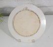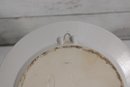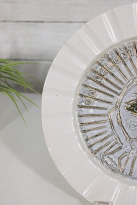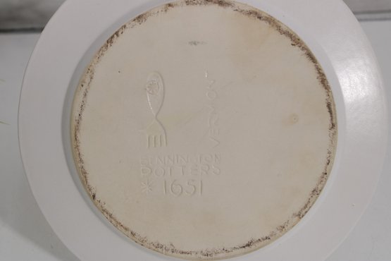 Crafted in classic Bennington style, the plate showcases a textured, hand-finished look with subtle variations in glaze and relief that highlight its artistic character. The off-white/cream body is accented with gold-toned detailing, giving the piece depth and visual intrigue.