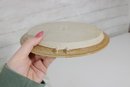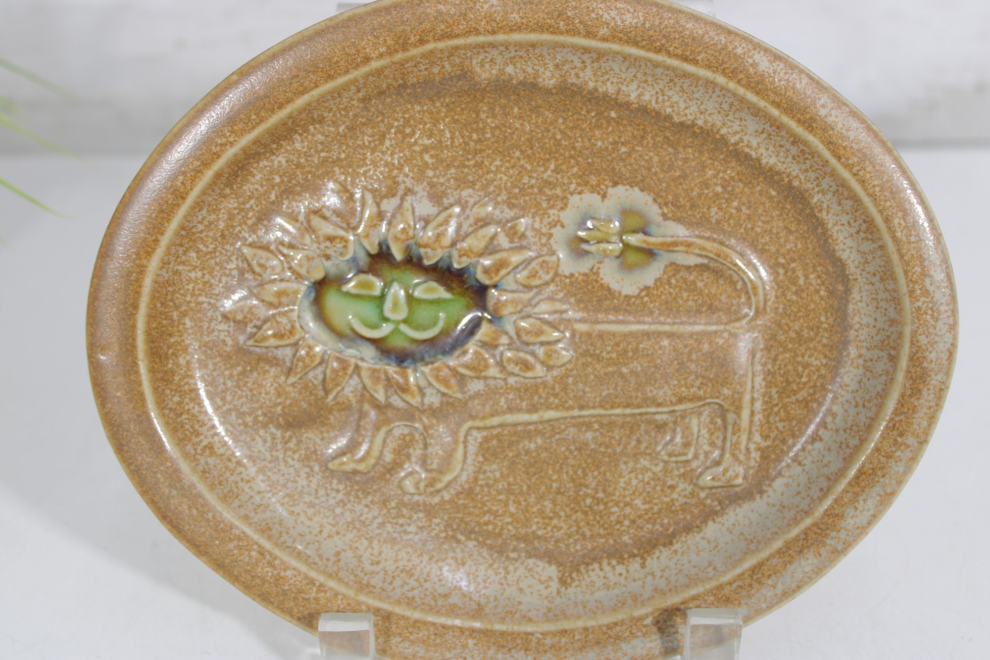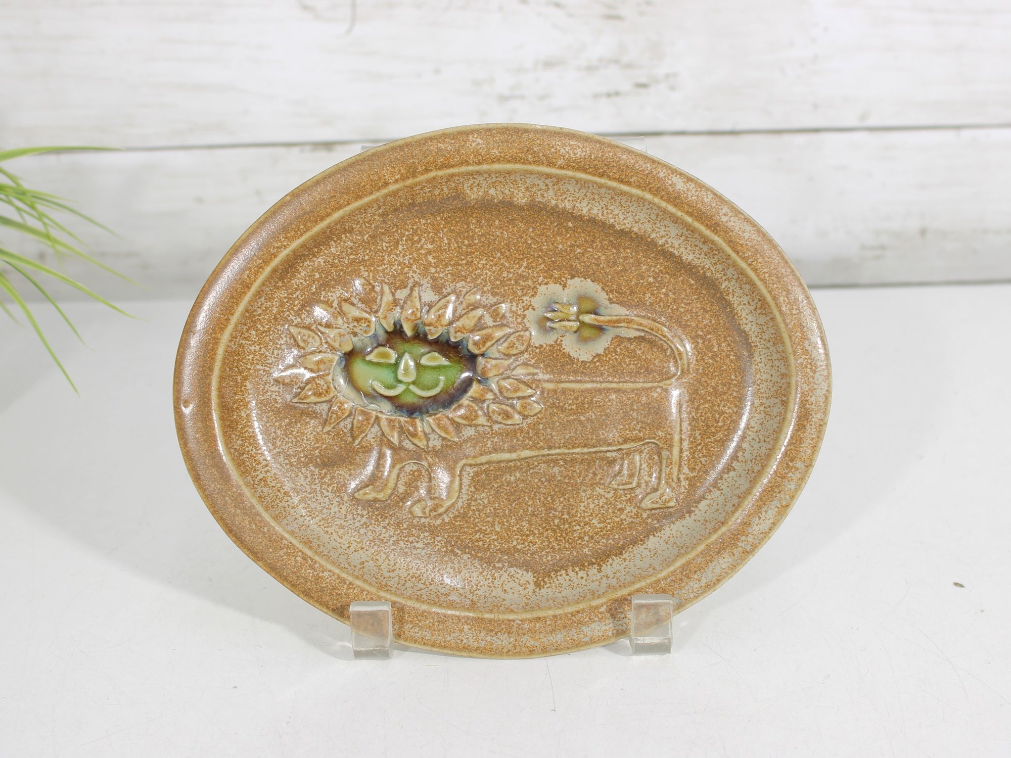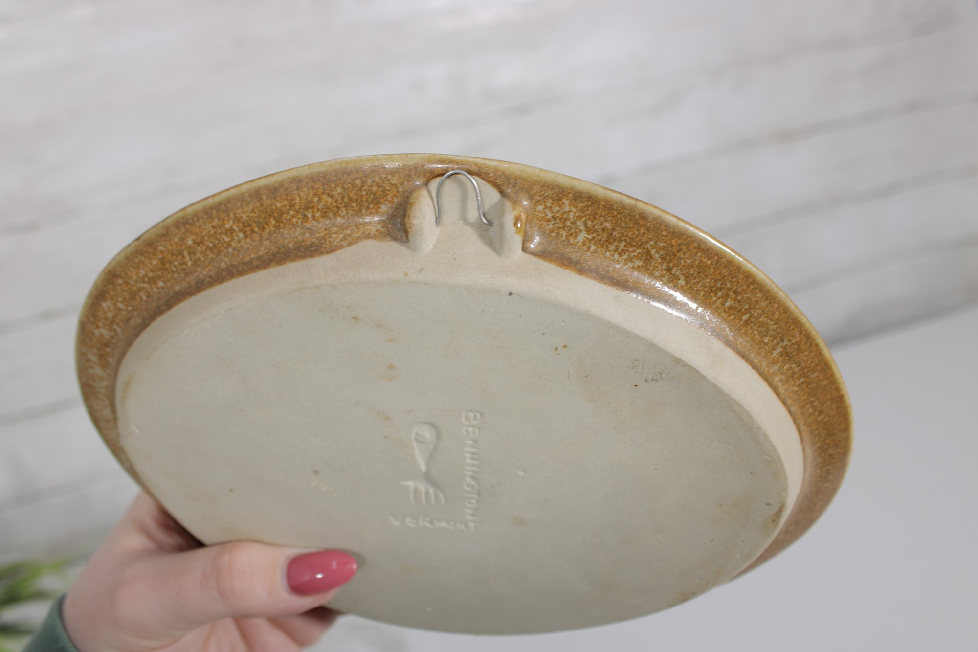Beautiful vintage Bennington Pottery platter featuring the classic tawny mustard glaze with a warm, earthy tone and subtle speckled finish. This piece showcases a raised floral/leaf motif in the center, adding texture and visual interest, characteristic of Benningtonās iconic handcrafted style.