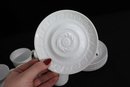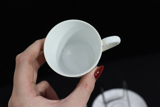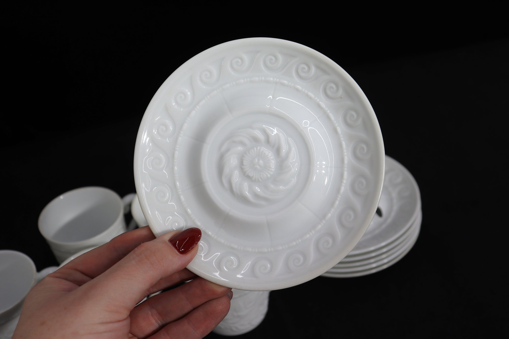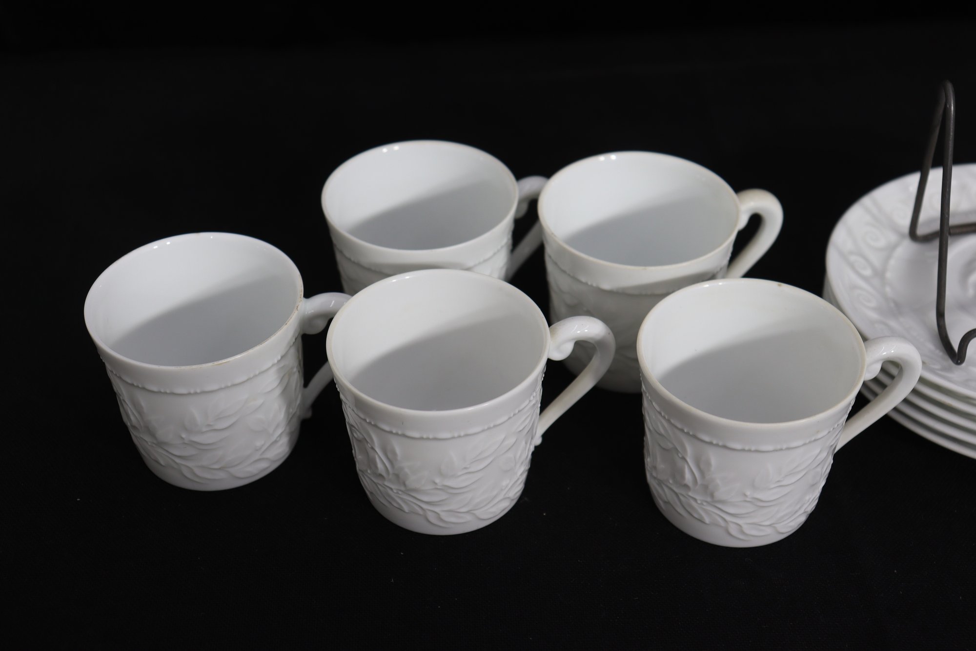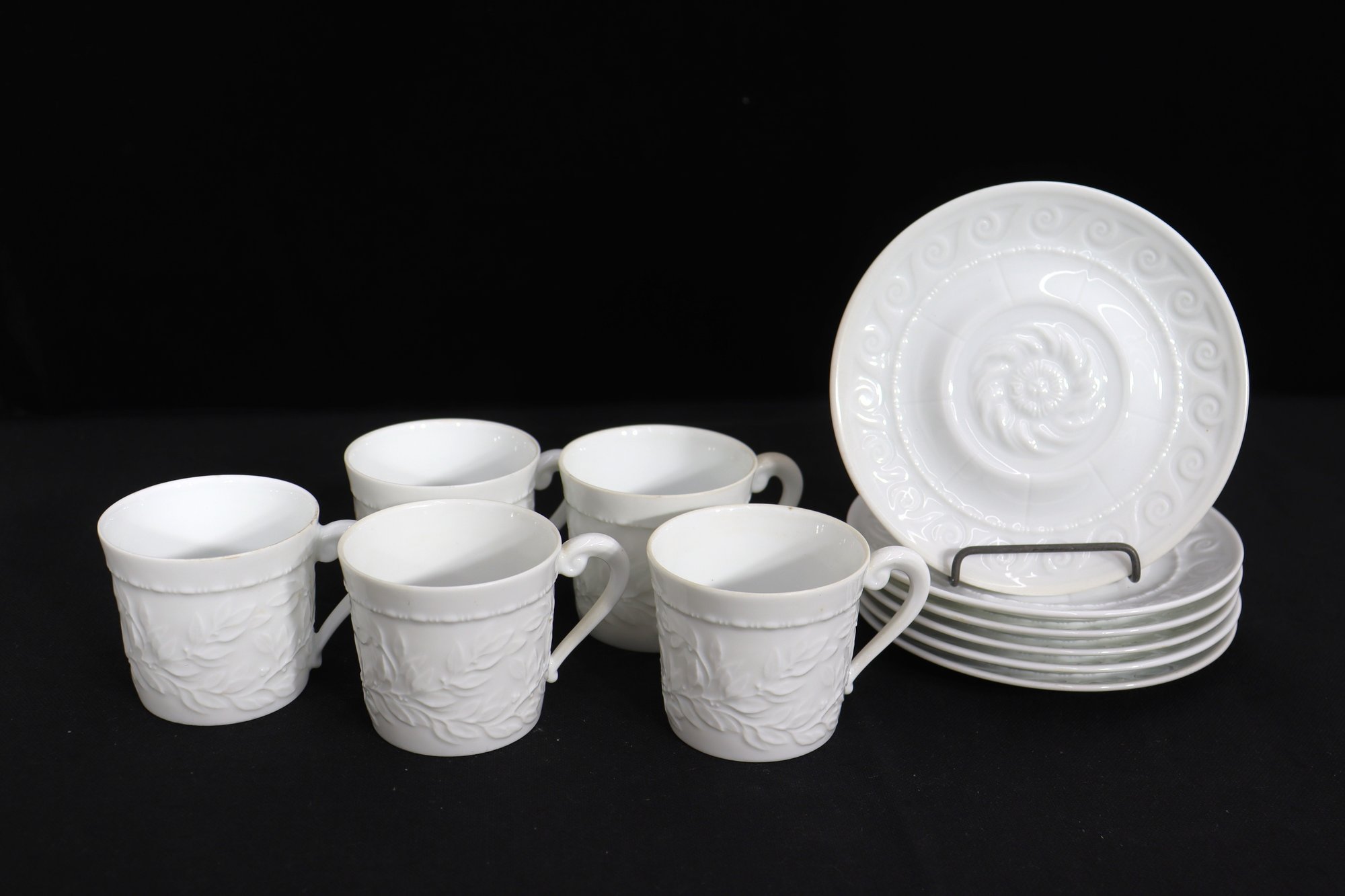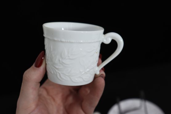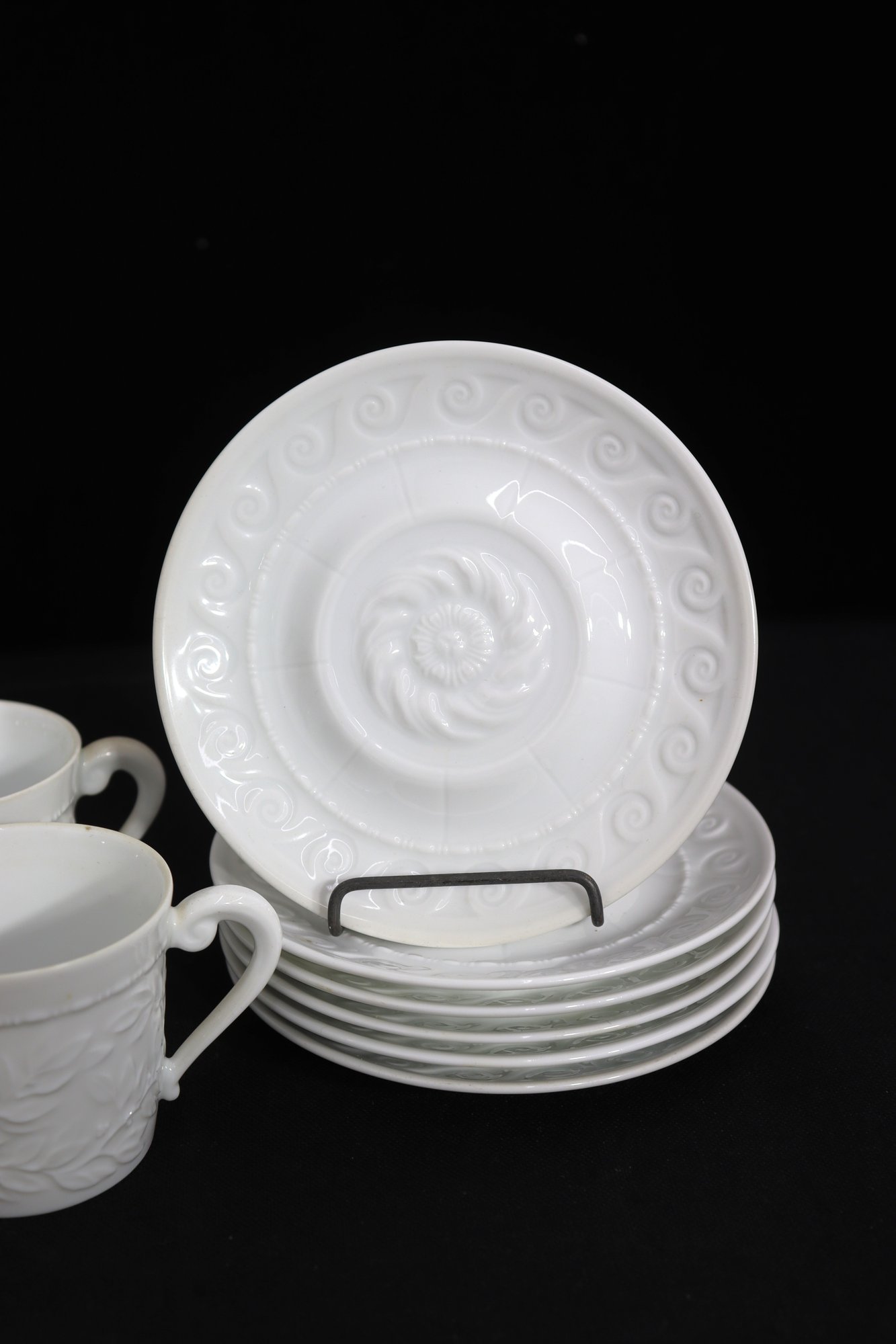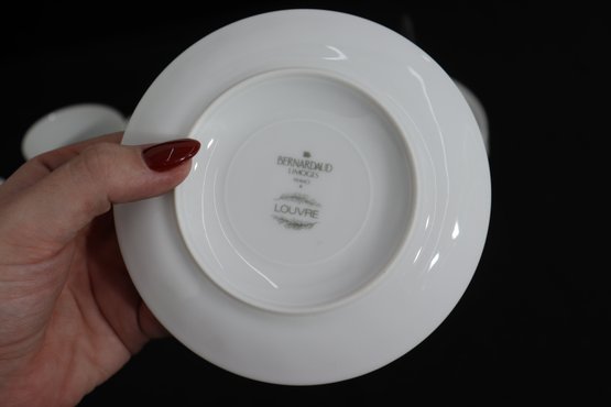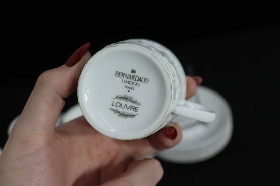 Bernardaud Limoges France white porcelain “Louvre” pattern cup and saucer set. Beautiful embossed raised motif detailing with classic refined French styling. Each cup marked Bernardaud Limoges – Louvre – France on base.