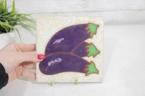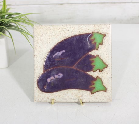 Charming Bertex ceramic art tile featuring a bold eggplant (aubergine) motif in rich purple tones with bright green stems, set against a speckled neutral background. The clean, stylized design gives this piece a fun and slightly whimsical character, perfect for kitchen or casual décor.