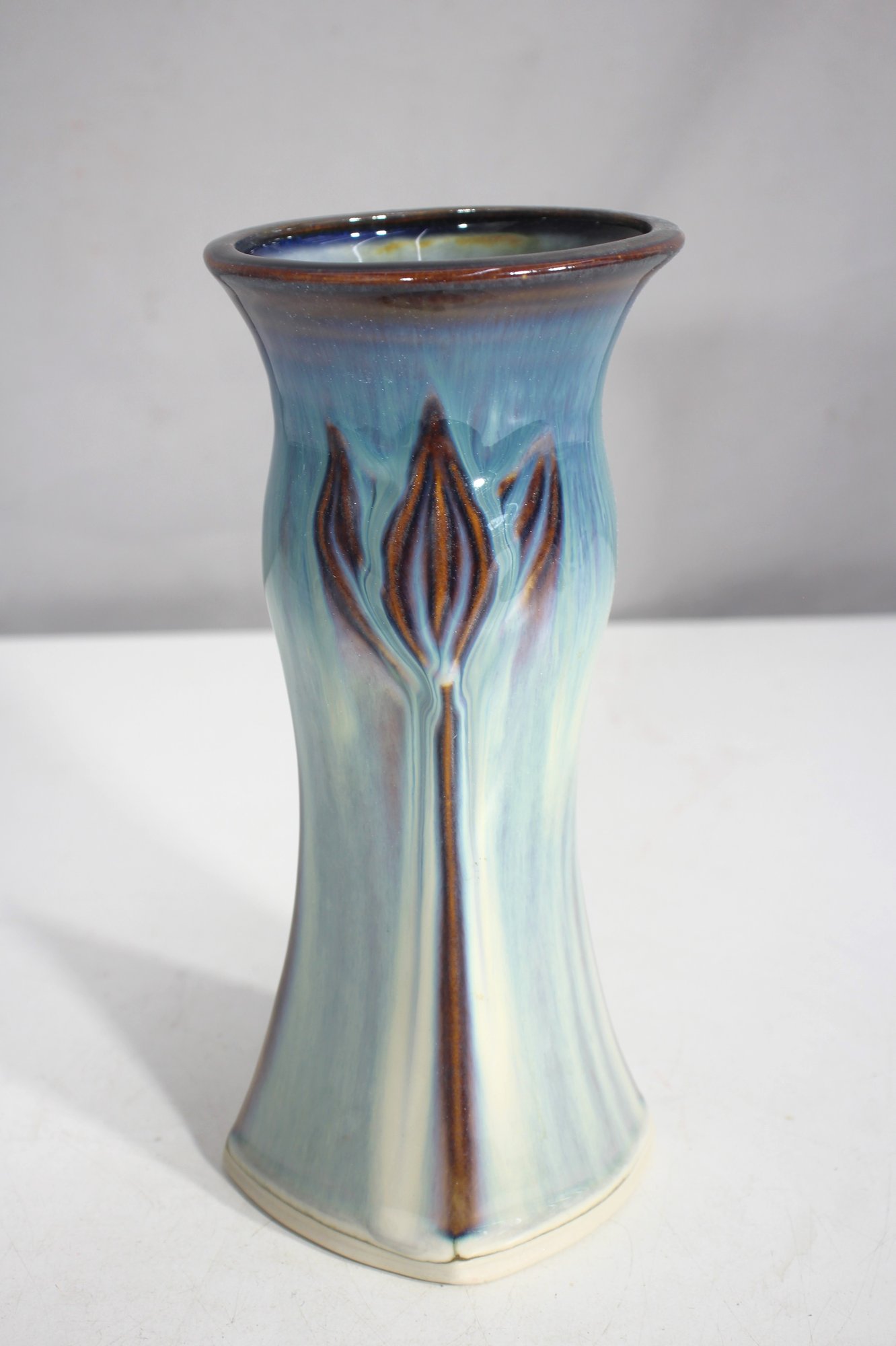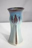 a stunning Bill Campbell Studio Art Pottery Lotus Vase, standing 9 inches tall and featuring his signature drip glaze technique. This exquisite ceramic piece showcases a soft blue-to-cream gradient glaze with earthy brown accents, creating a beautiful organic flow. The sculptural lotus-inspired form enhances its elegant, nature-inspired aesthetic.