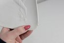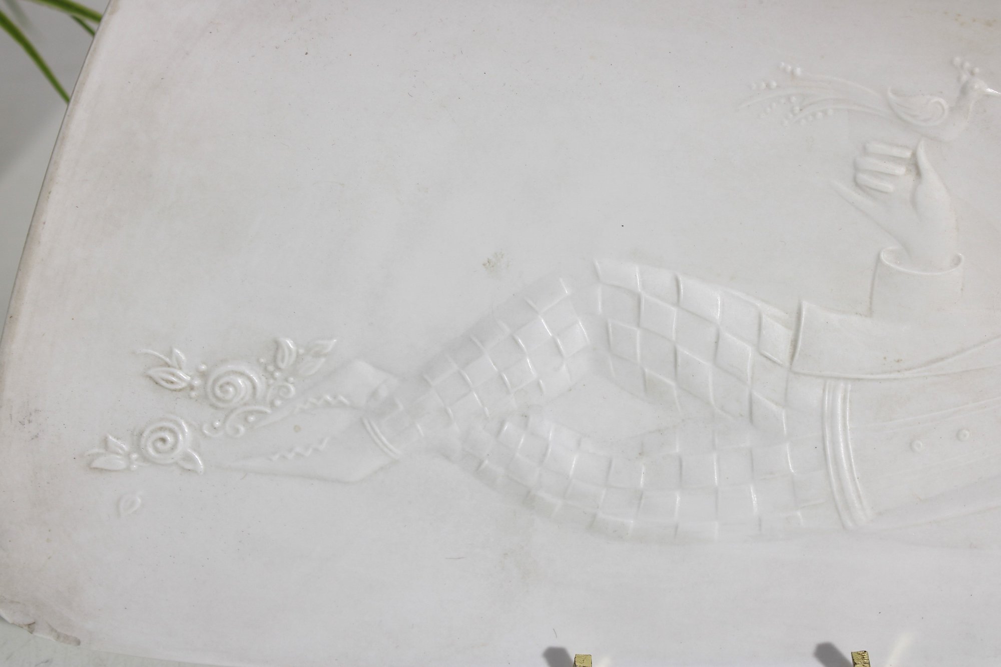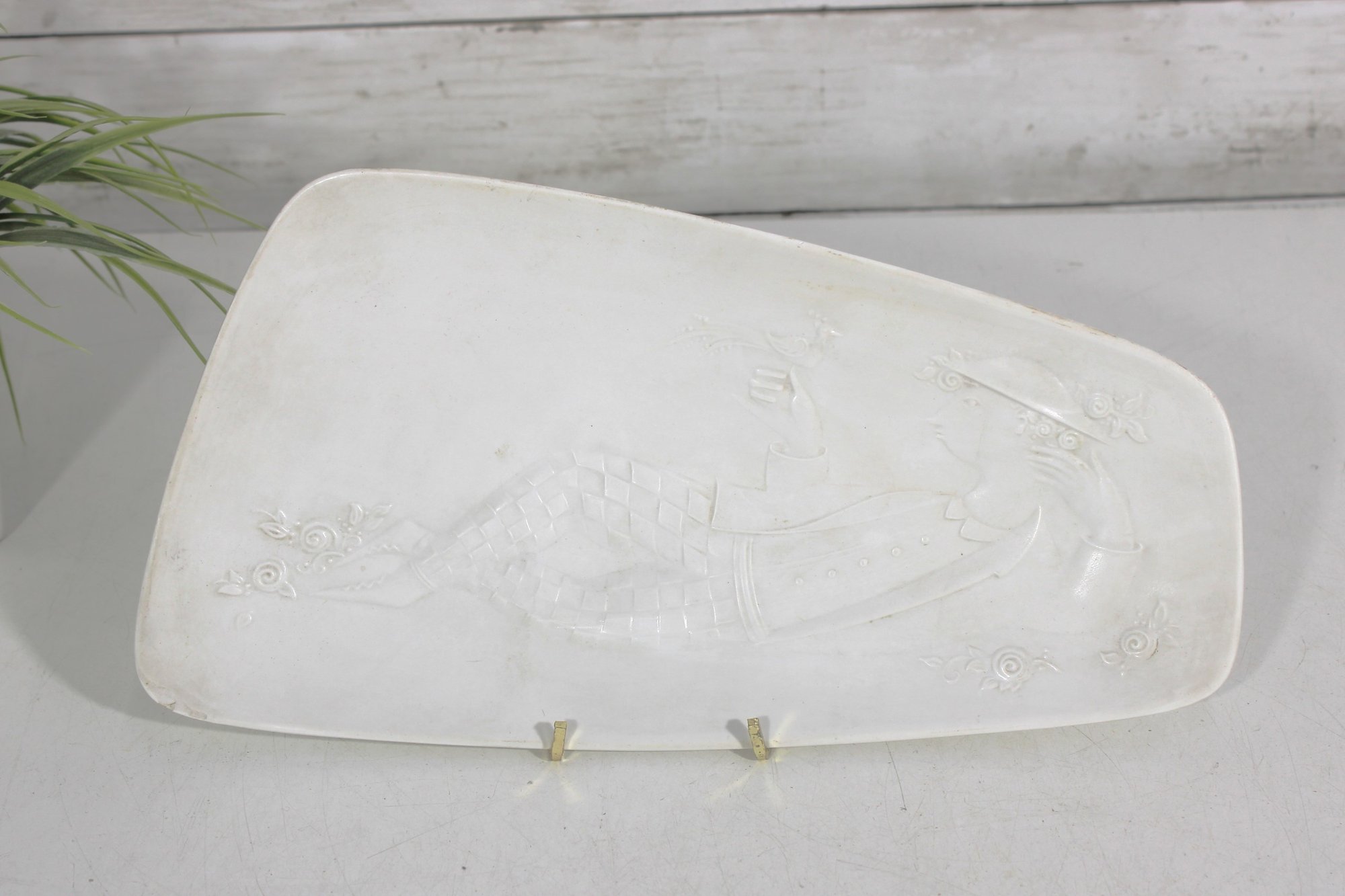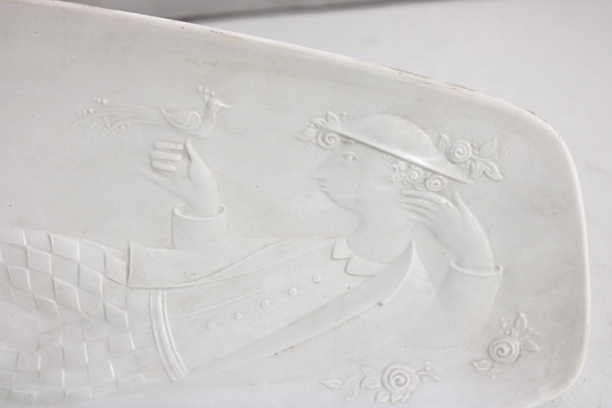 Vintage Bjorn Wiinblad for Rosenthal Studio Linie porcelain dish featuring a beautifully detailed bas relief figural design. This elegant piece showcases Wiinblad’s signature whimsical style, with a stylized figure in flowing costume surrounded by delicate decorative elements, all rendered in subtle raised white-on-white relief.