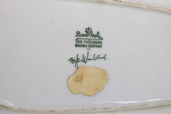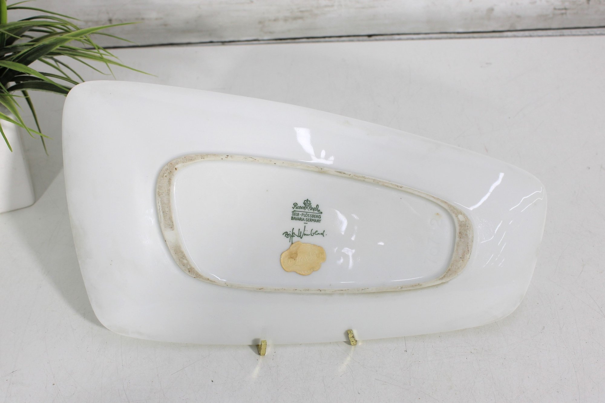 The dish has a modernist, asymmetrical form measuring approximately 12 inches by 6 inches, making it an eye-catching display piece ideal for collectors of mid-century design, Scandinavian art, or Rosenthal studio ceramics. The underside bears the Rosenthal Studio Linie mark along with Bjorn Wiinblad’s signature.