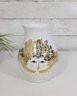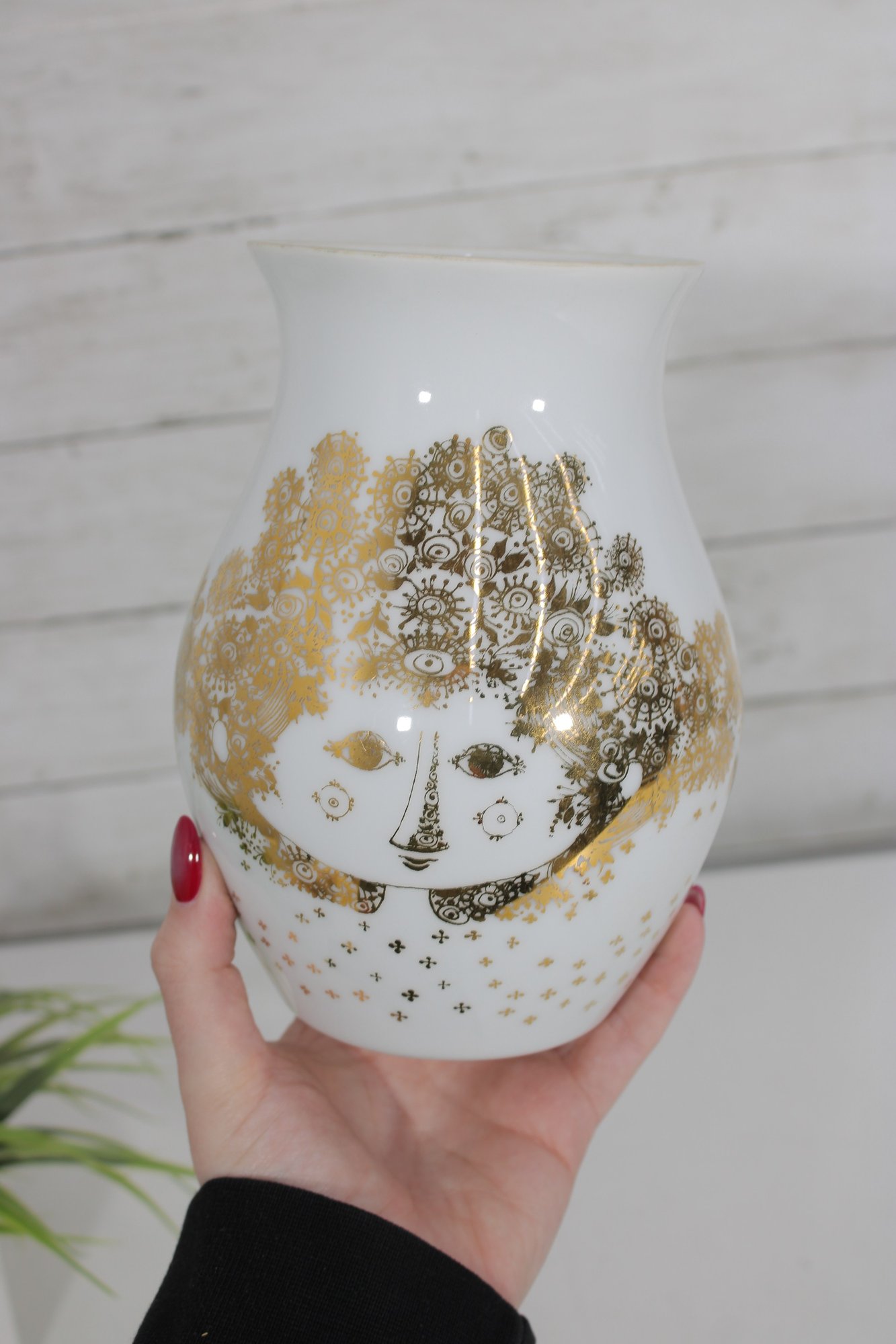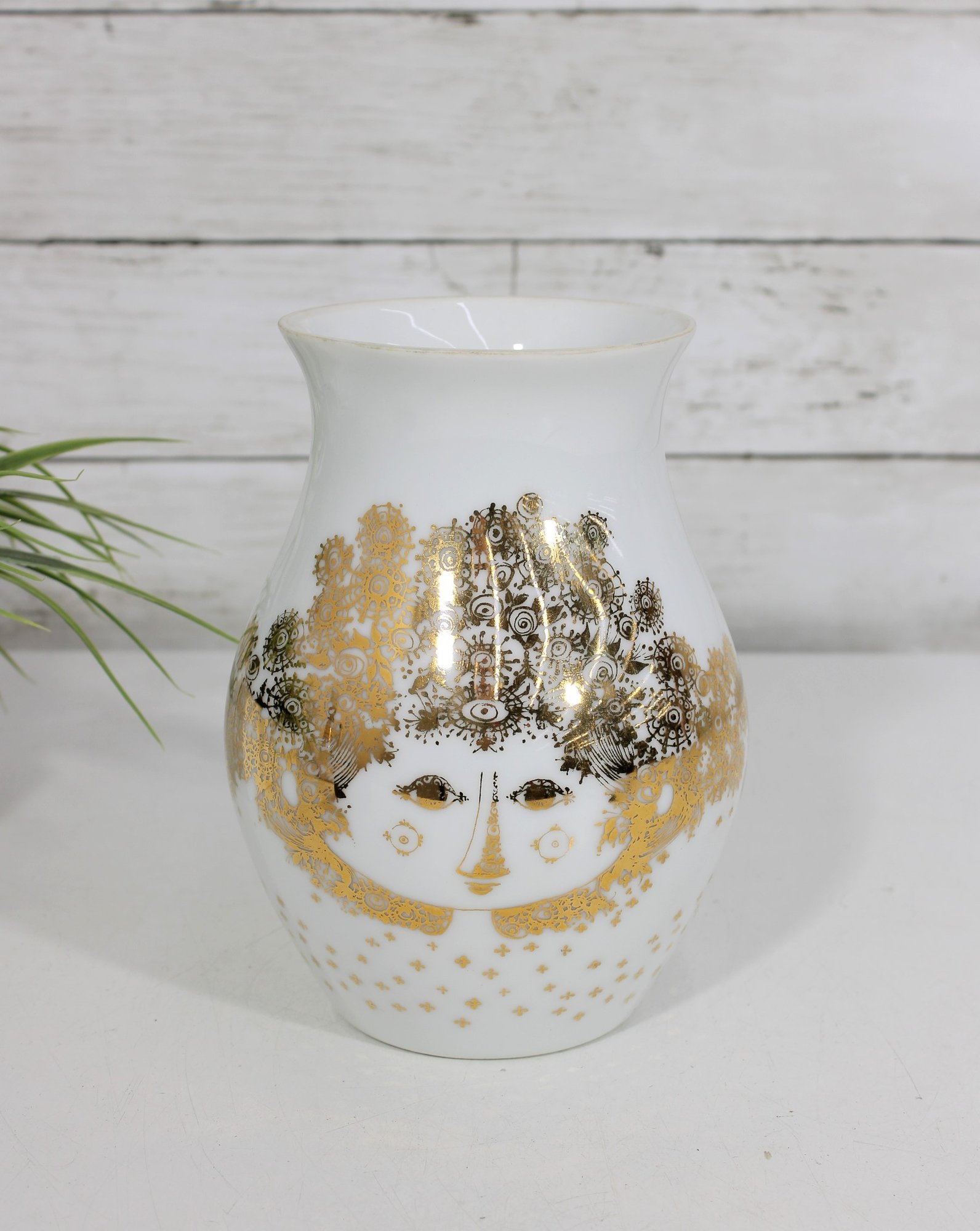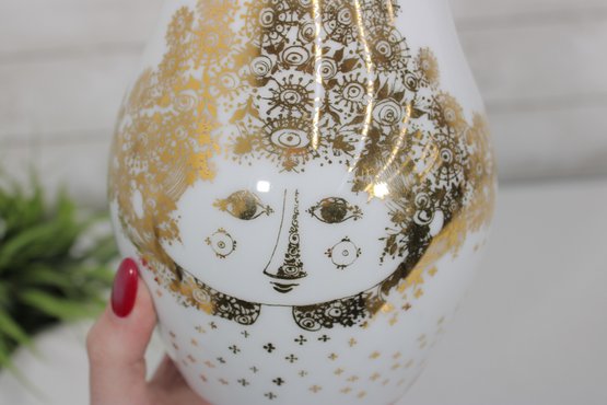 Björn Wiinblad porcelain vase, beautifully decorated with his iconic stylized faces and ornate detailing in rich gold accents. This piece captures Wiinblad’s signature whimsical and theatrical aesthetic, making it a standout example of mid-century European design.