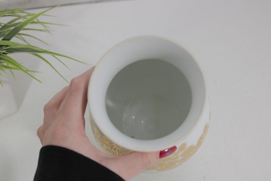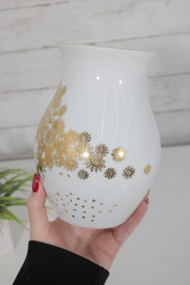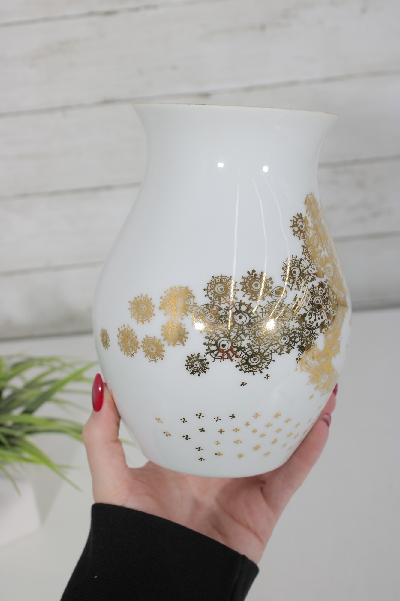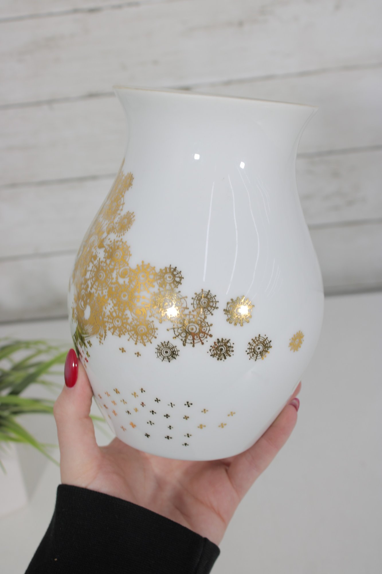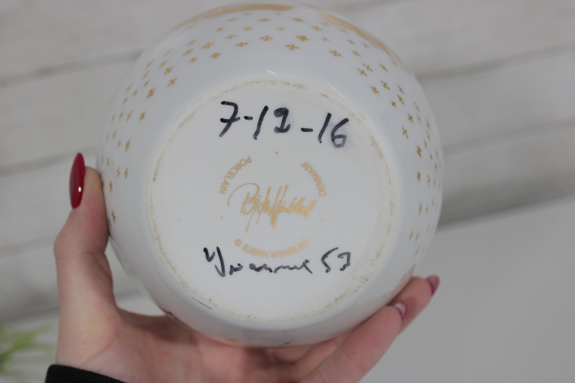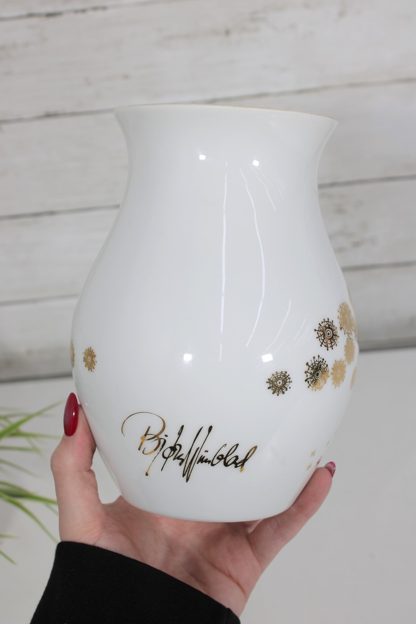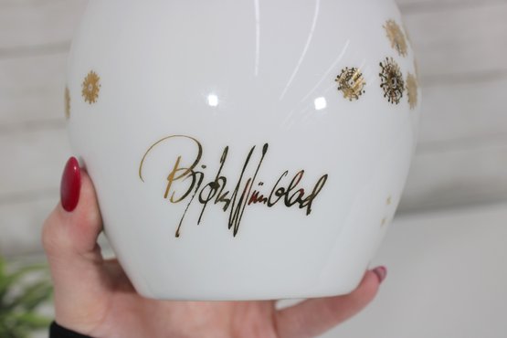 The vase features a softly rounded form with delicate gold patterning and expressive figural faces, creating a luxurious and artistic presence. It is signed in gold by Björn Wiinblad, adding to its desirability and collectible value.