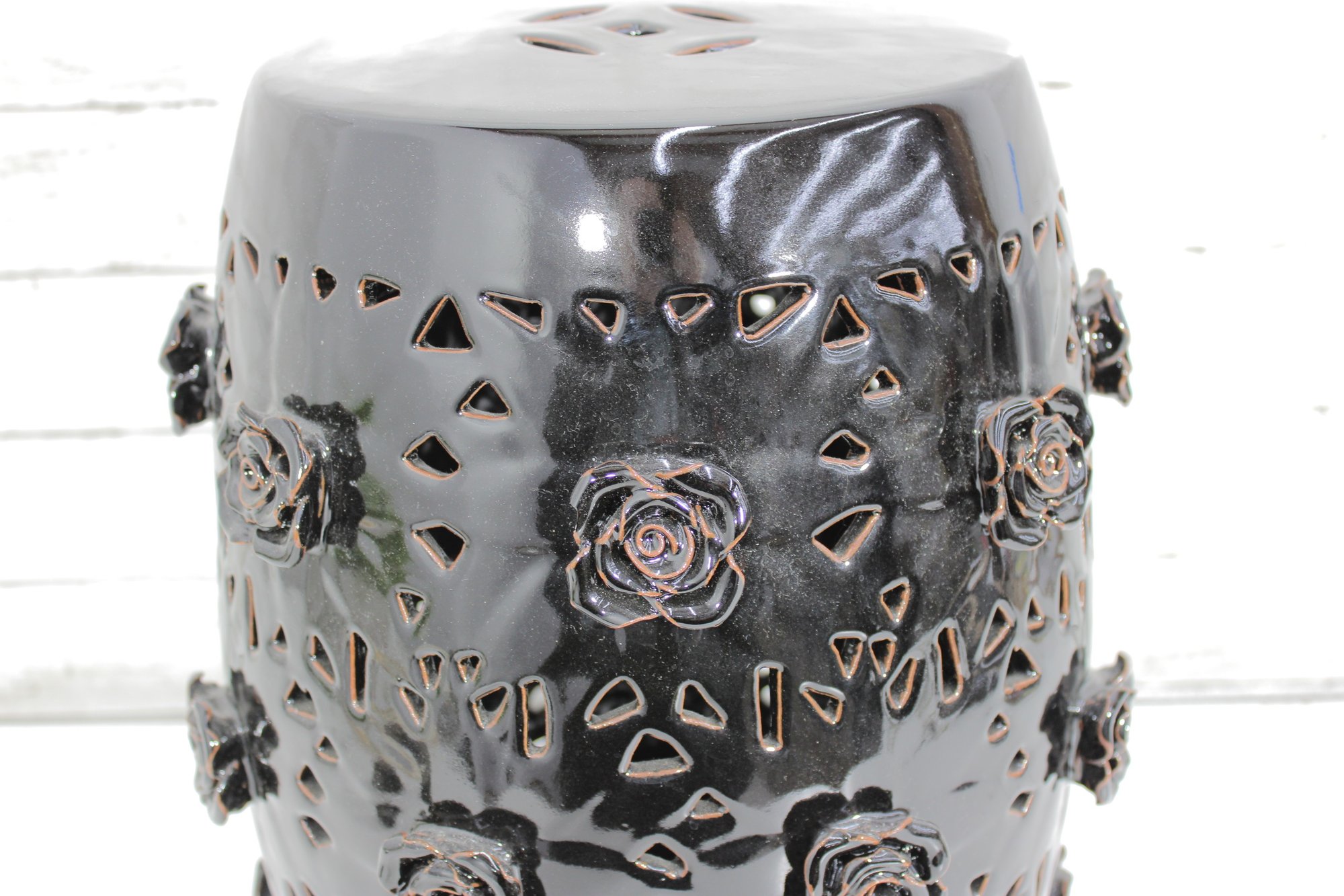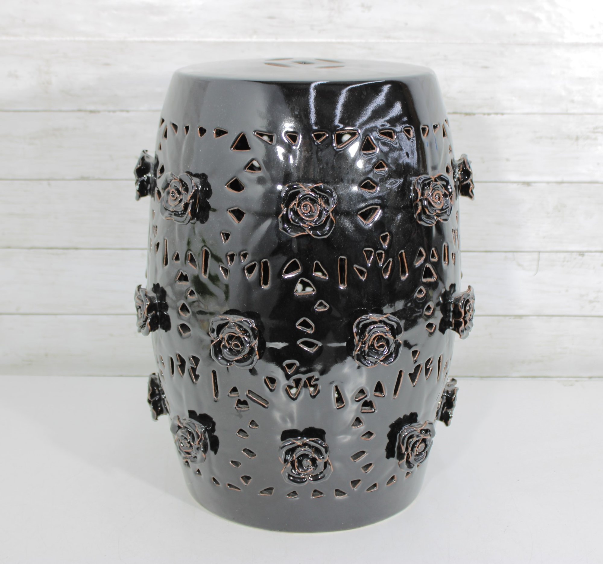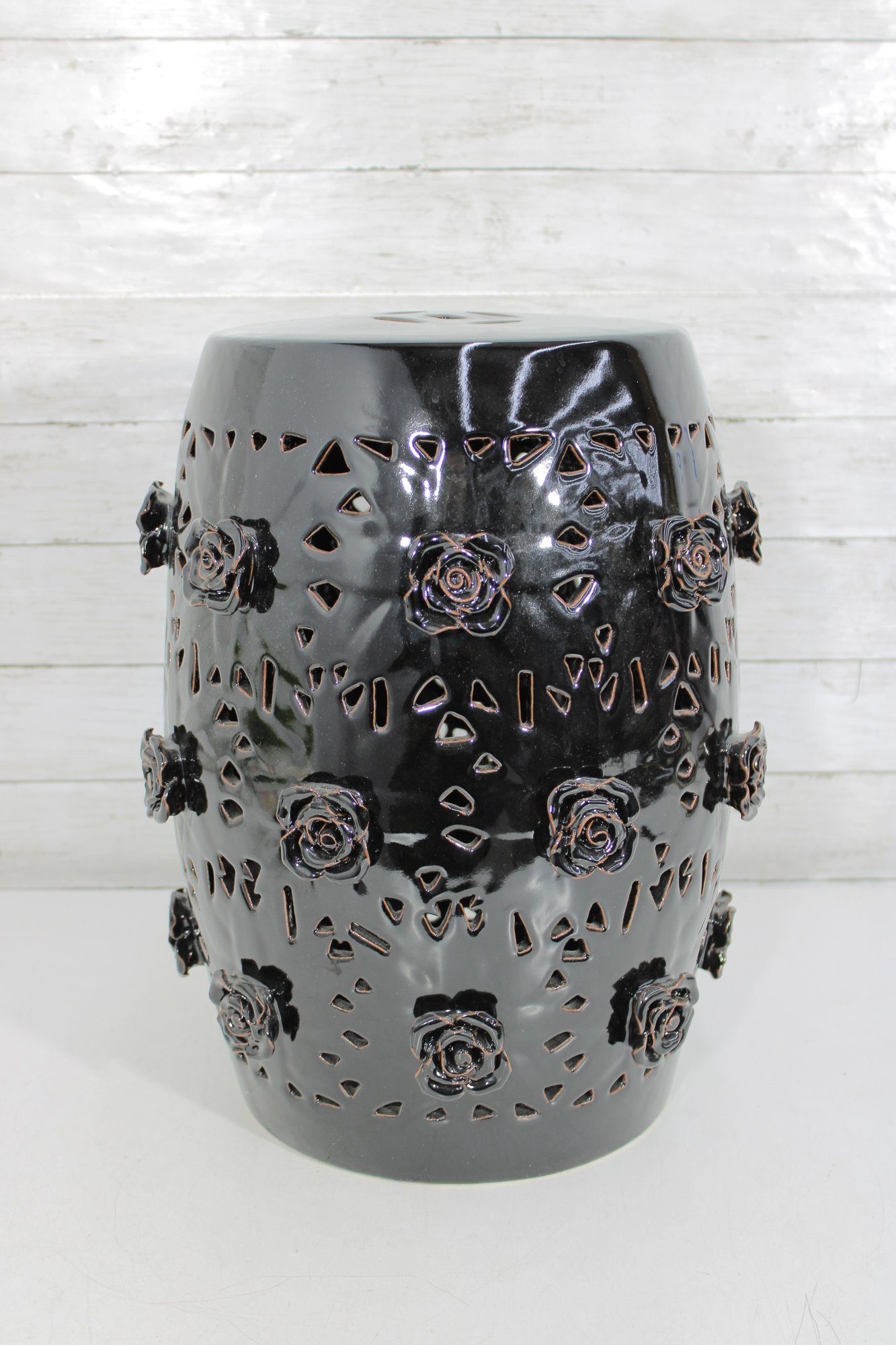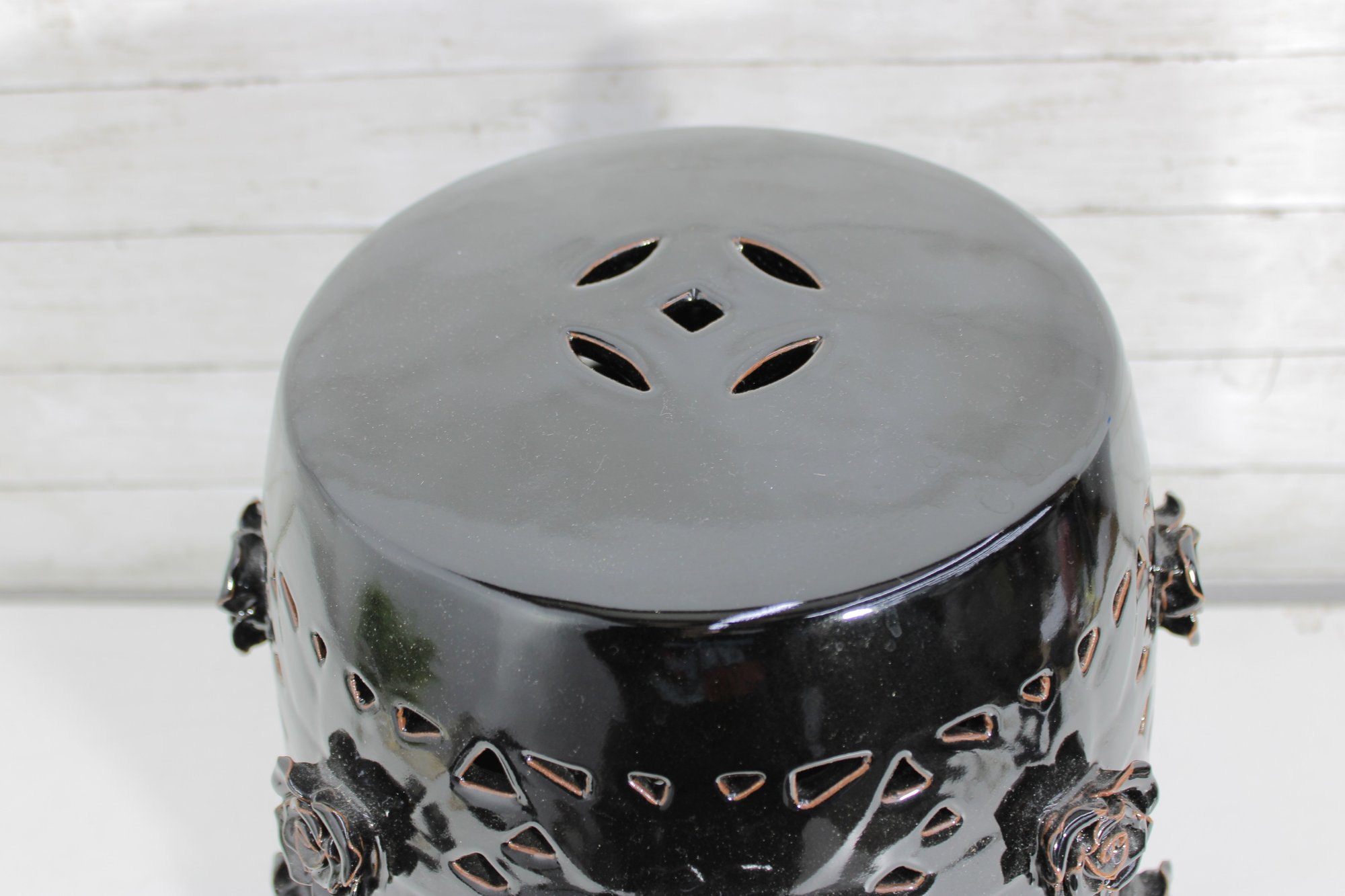 this stunning black glazed ceramic garden stool, standing 17.5 inches tall. Featuring an eye-catching pierced design with raised floral medallions, this piece blends classic Chinoiserie influence with modern, high-contrast appeal.