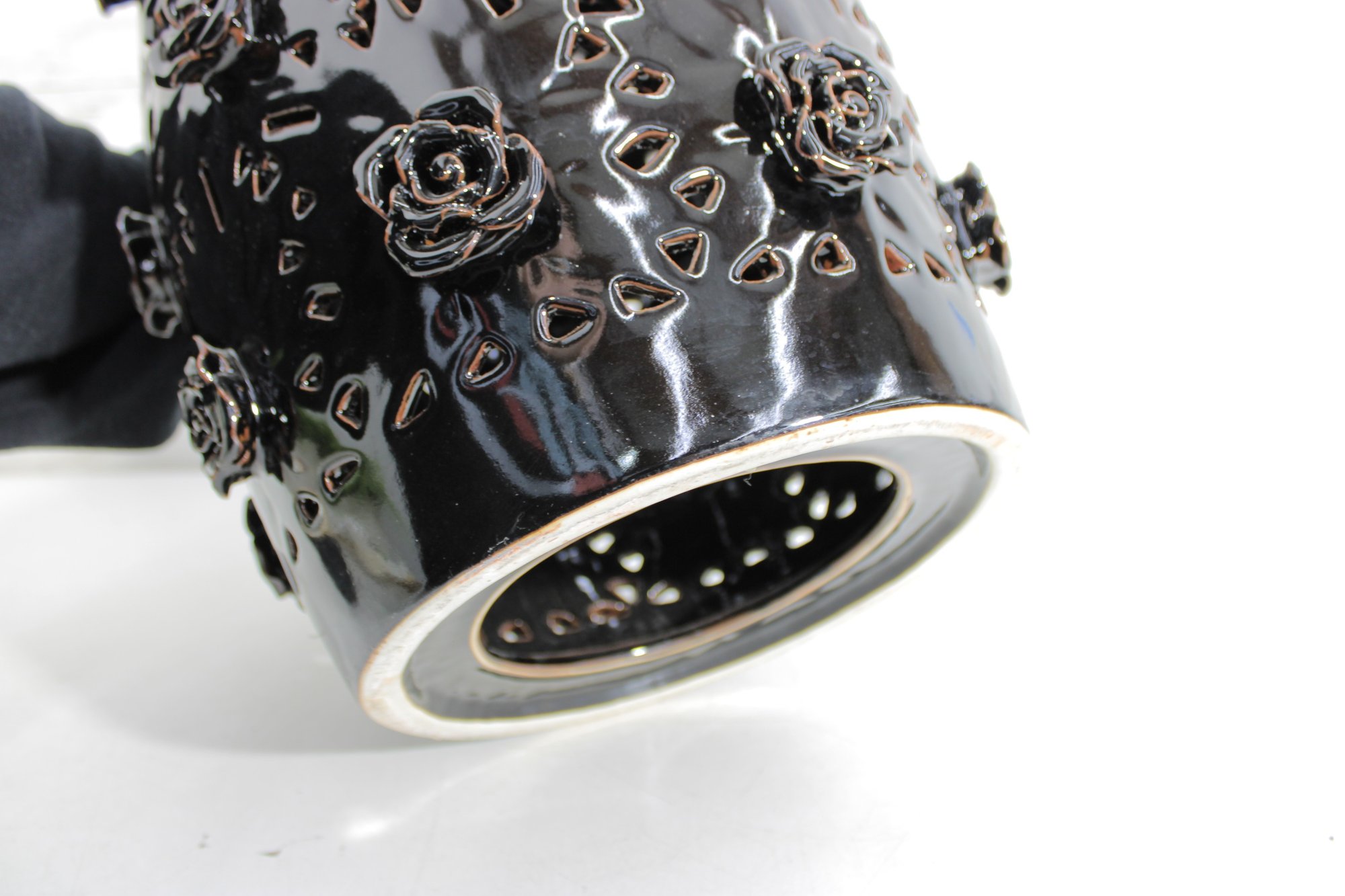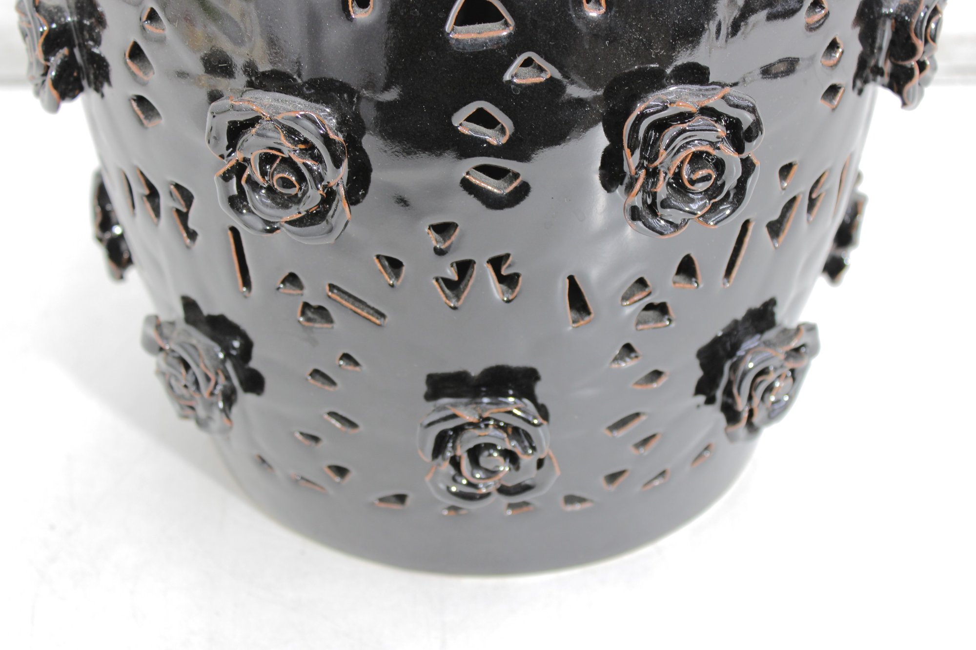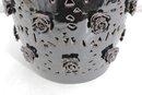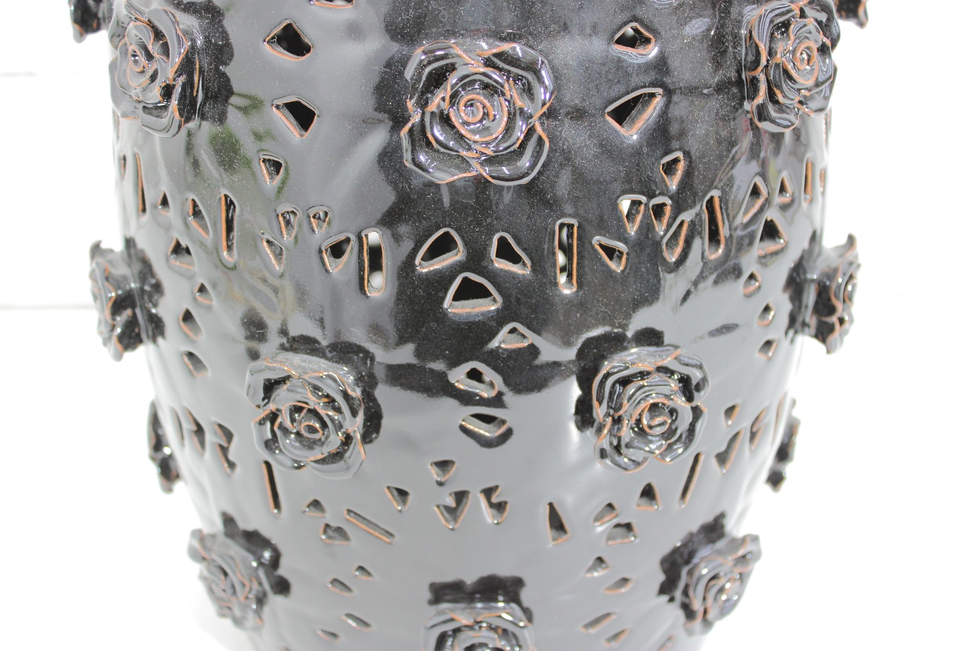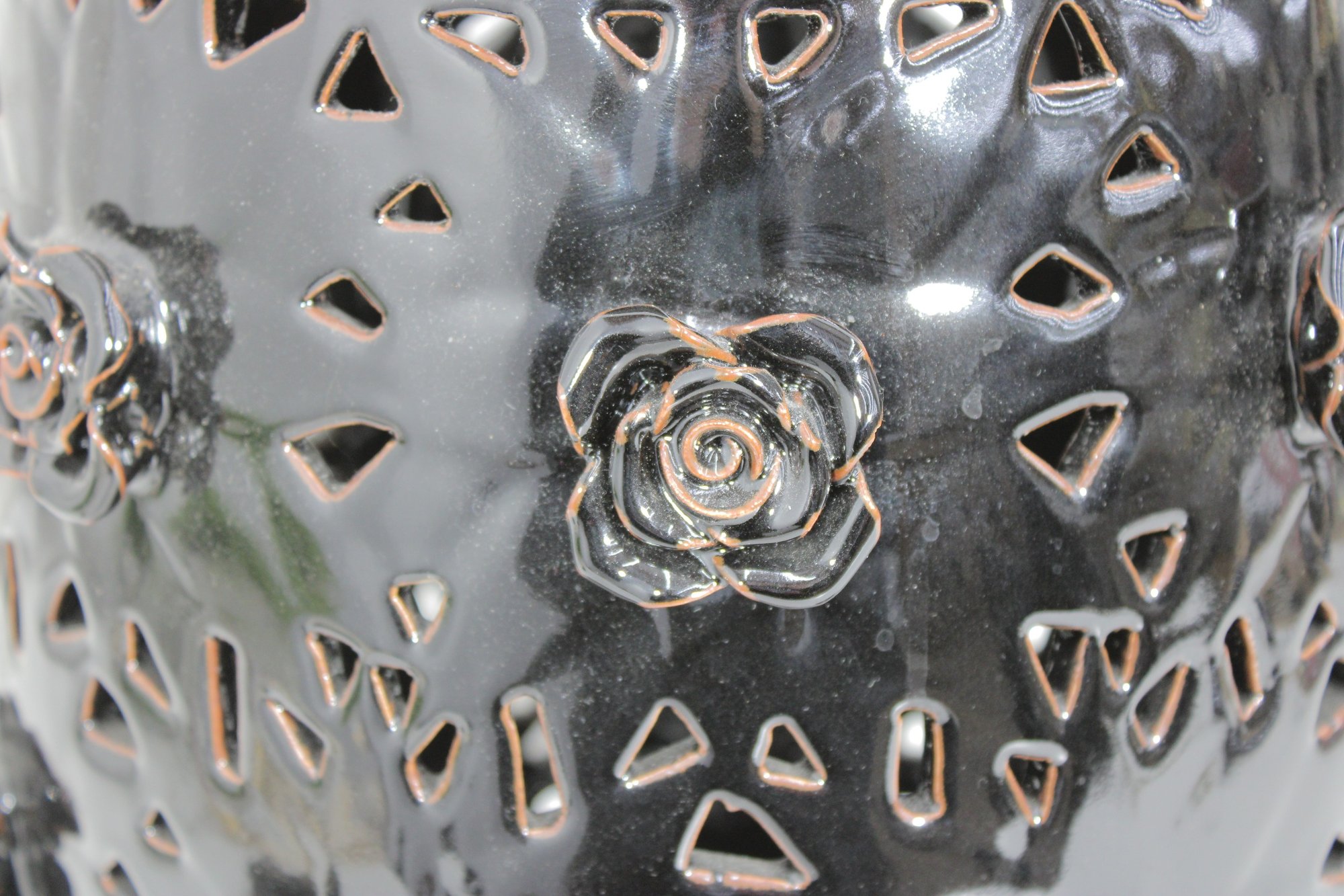 this stunning black glazed ceramic garden stool, standing 17.5 inches tall. Featuring an eye-catching pierced design with raised floral medallions, this piece blends classic Chinoiserie influence with modern, high-contrast appeal.